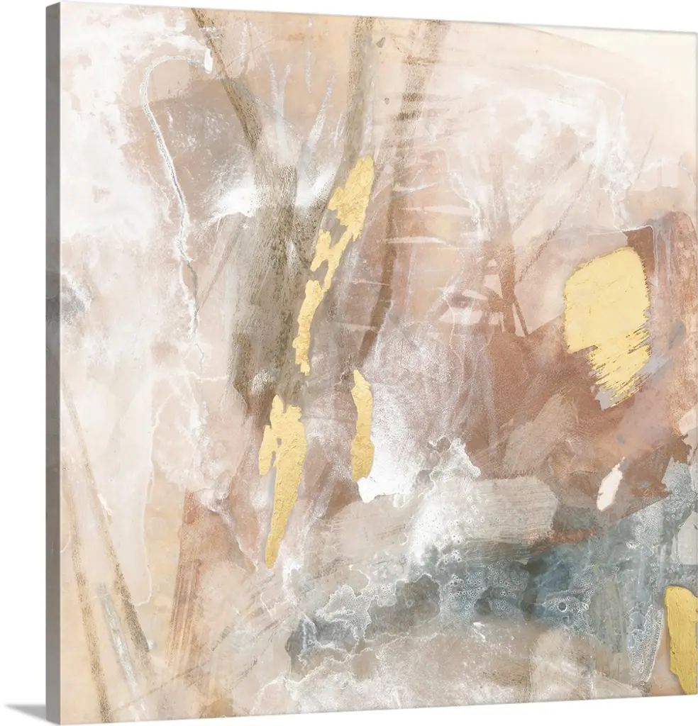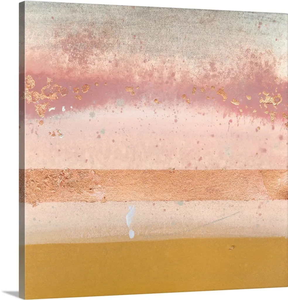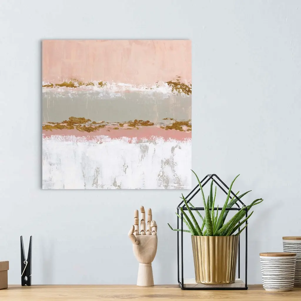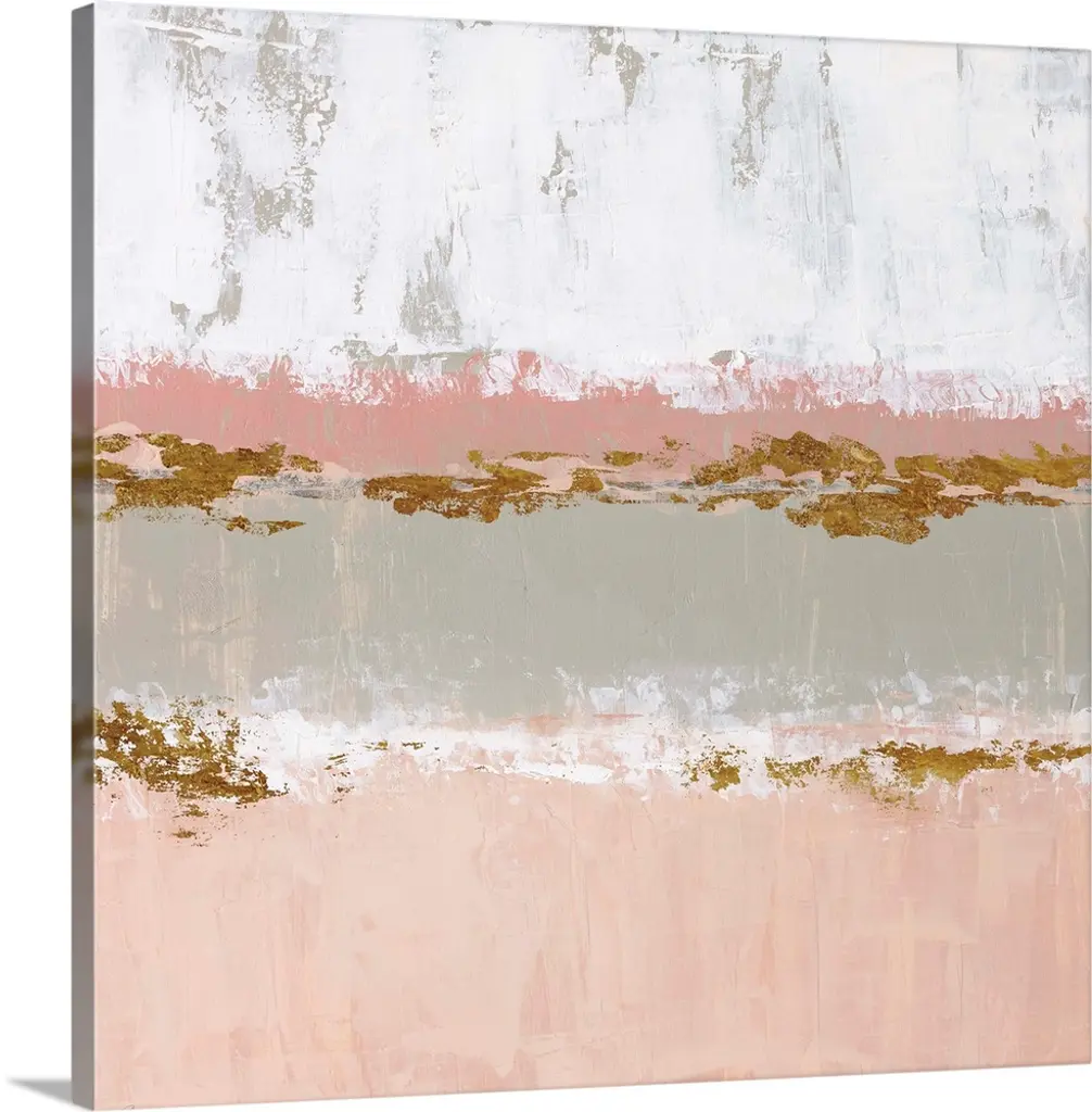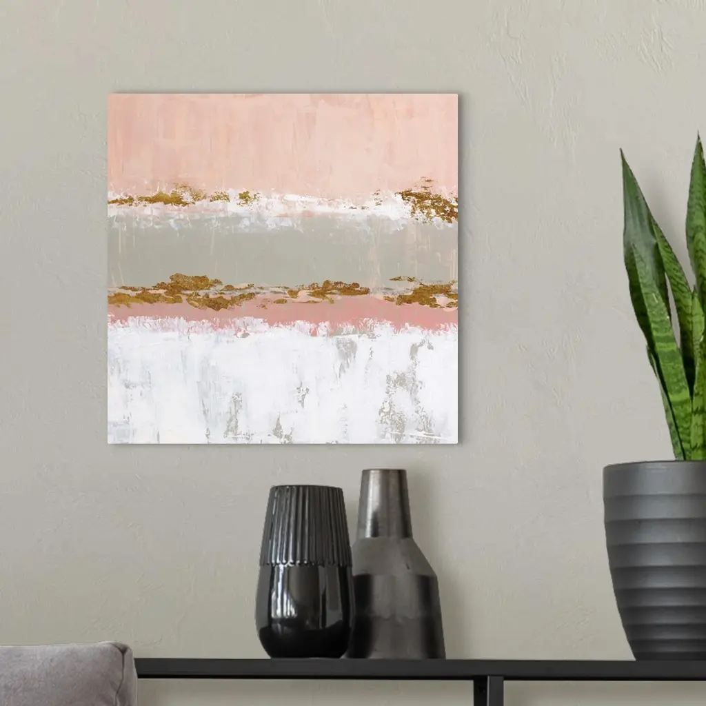 Square abstract artwork made with horizontal sections in pale pink, gray, white, and metallic gold hues.