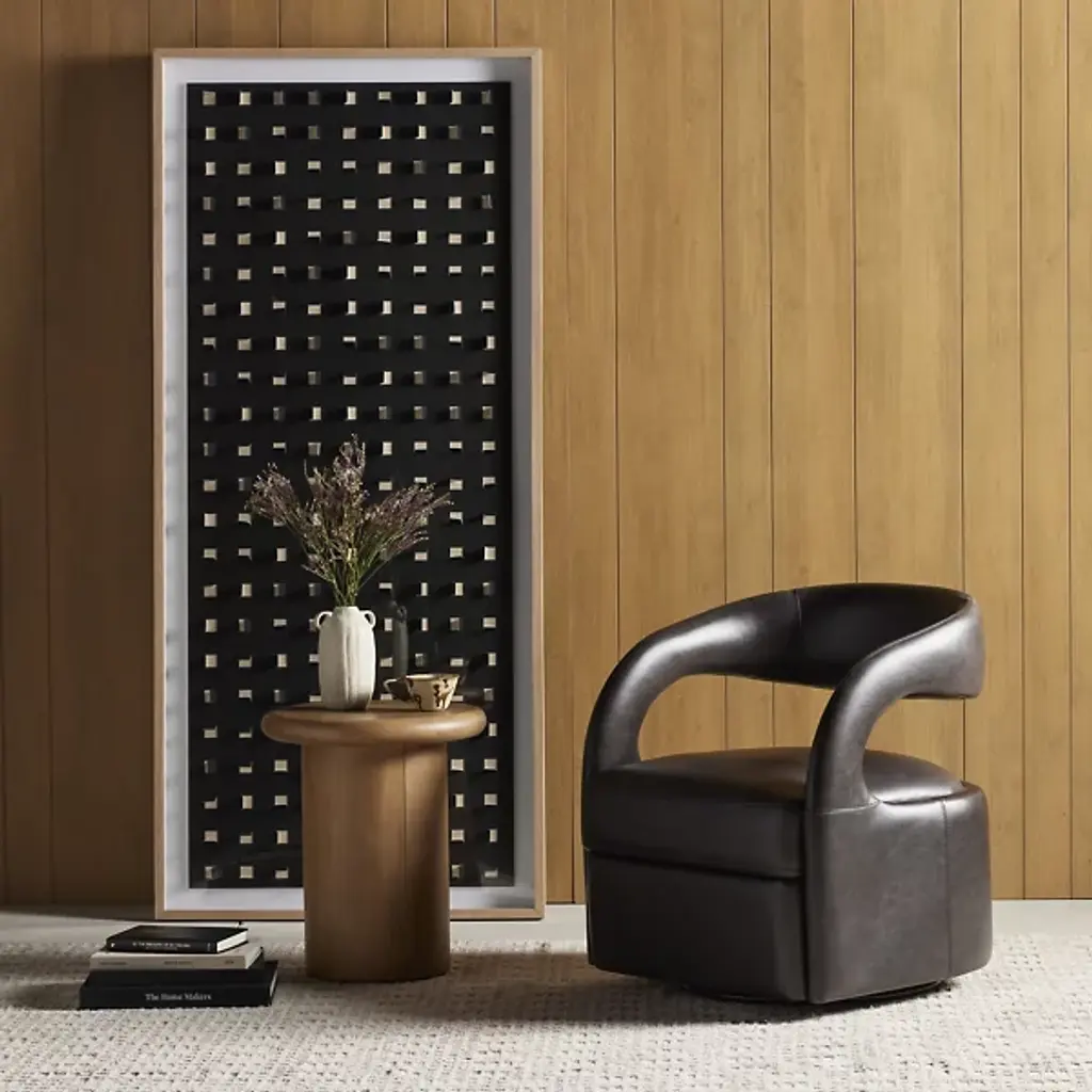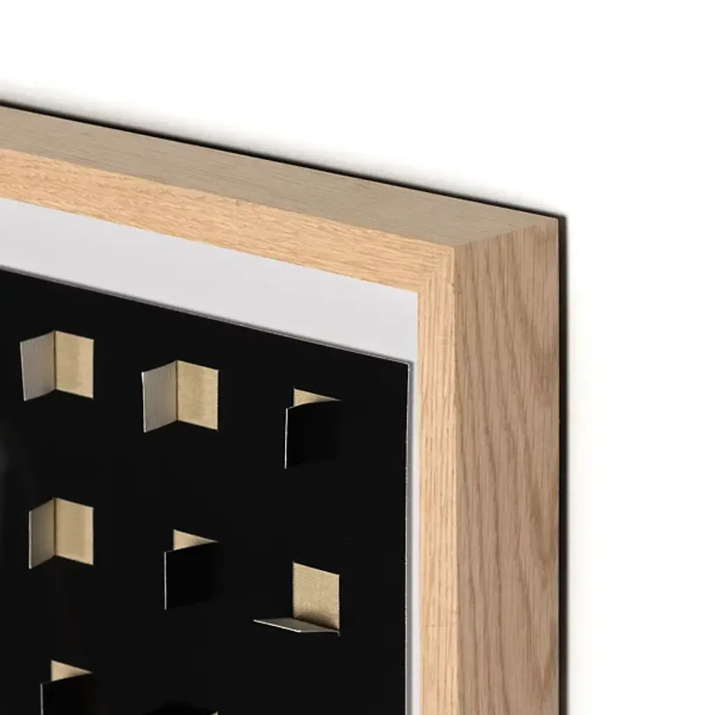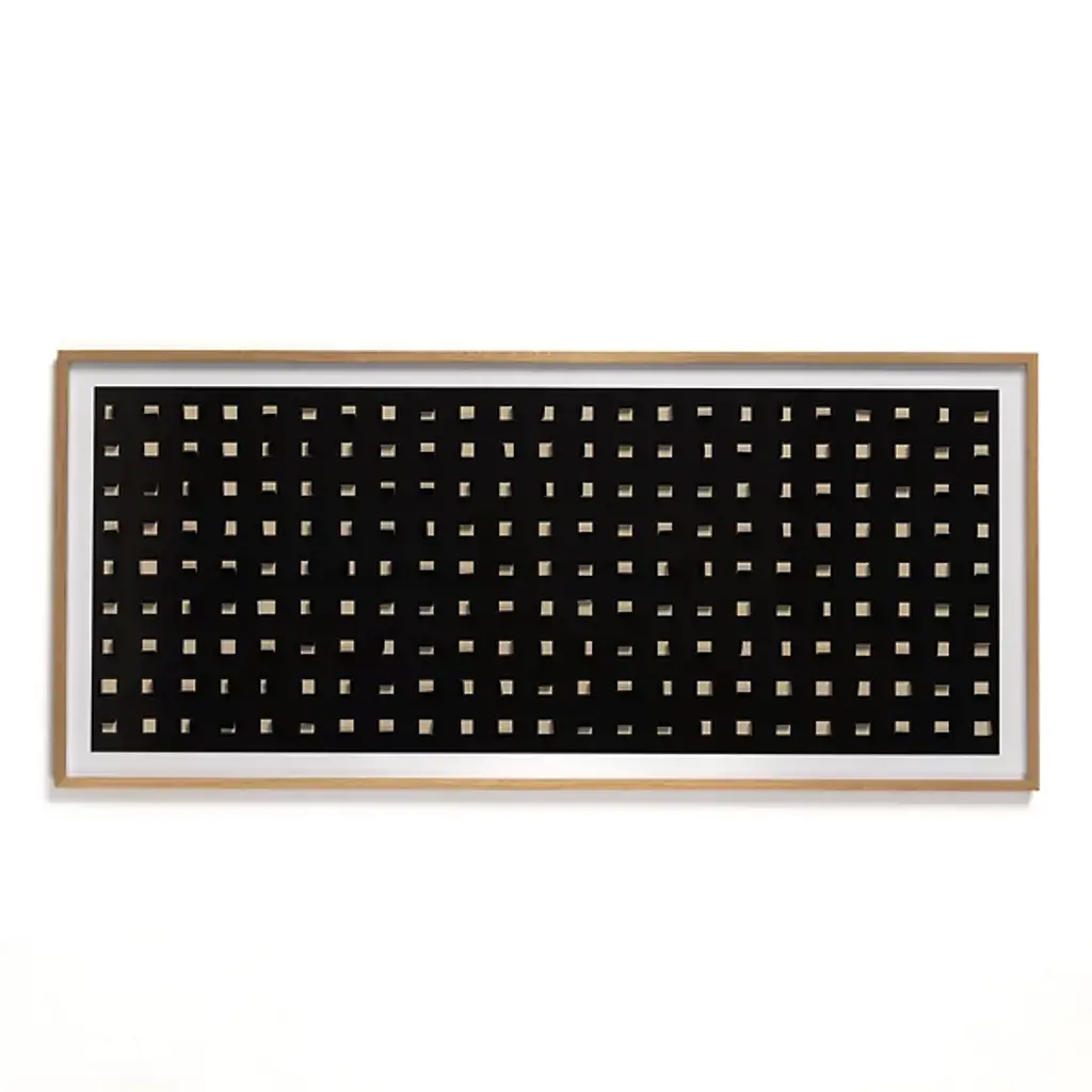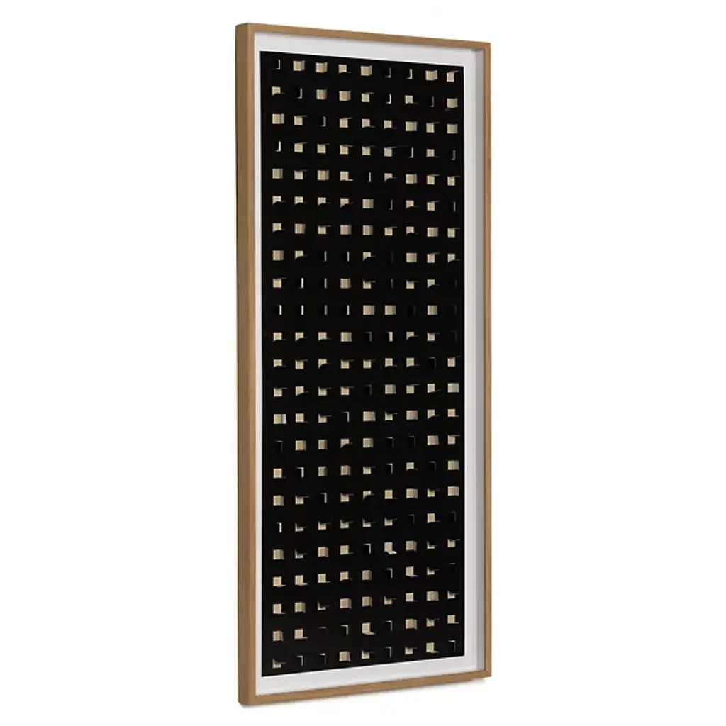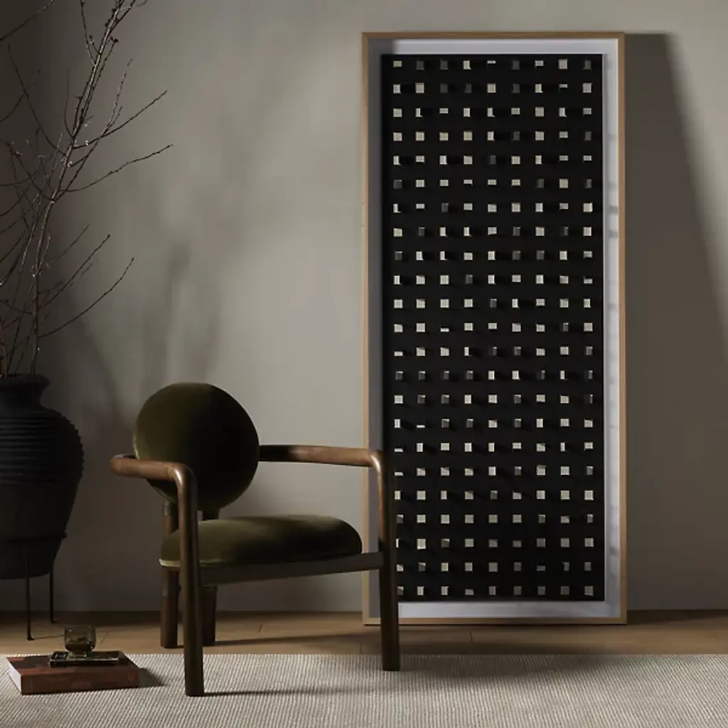 Explore refined decor with the captivating design of the See Through Black Oak Wall Art by FH Art Studio from Four Hands, expertly crafted with Textured Fine Art Paper and Tape, framed in Vertical Grain White Oak. The grid pattern, created by paper cutouts on a printed linen backer, introduces layers of color and texture to enhance any space. Designed by Four Hands Art Studio and handmade in Austin, Texas, this artwork seamlessly merges contemporary and artisanal modern styles, elevating your living environment with unique visual appeal.