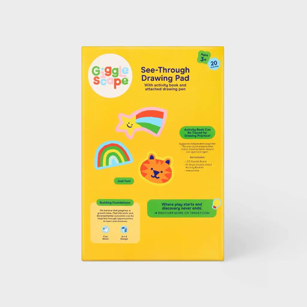 The See-Through Drawing Pad from Gigglescape™ provides a fun way to develop your little one's imagination. This see-through activity set includes an LCD doodle board, 10-sheet double-sided booklet and instructions plus an attached magnetic pen that lets them draw on the board with no mess. Designed for ages three and up, this plastic drawing pad helps build fine motor skills at home or on the go.Gigglescape™: Where play starts and discovery never ends.