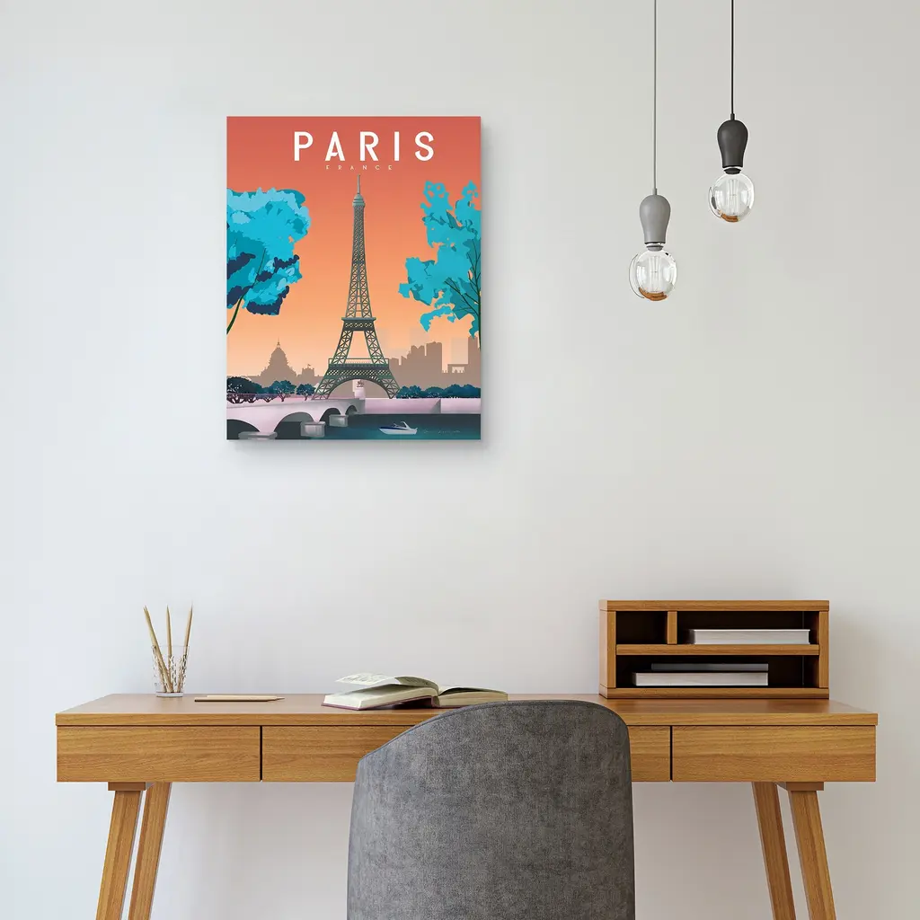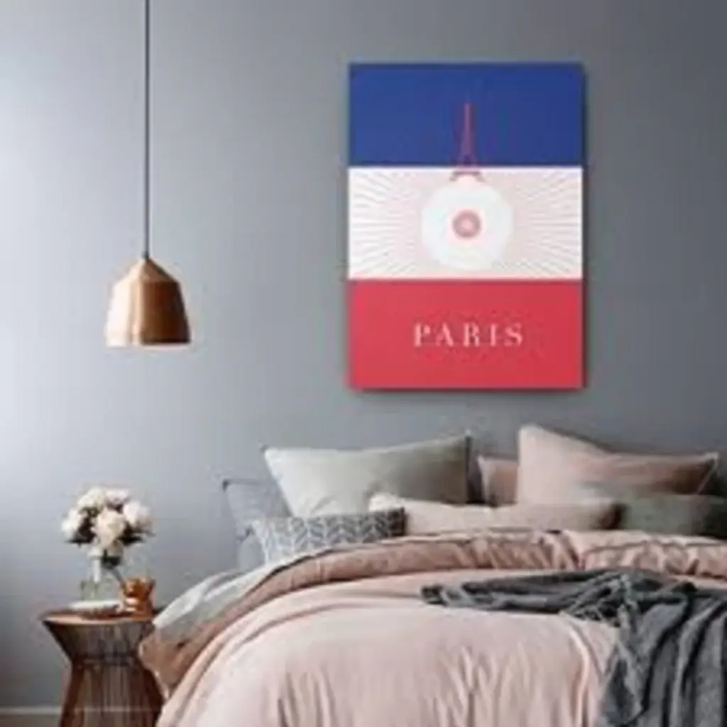Whether you have traveled to the romantic city of Paris, or are simply an admirer, See You Again in Paris Modern Canvas Wall Art is perfect for you. The Eiffel Tower, the word "Paris", and the French flag colors create an appealing piece of artwork for your wall. The canvas has been stretched onto a wooden frame, and it is intended for indoor use. Choose from the available sizes.- Original Design- Gallery quality cotton canvas and solid wood frame- Gallery wrapped canvas art- Saw tooth hangers installed- Wipe with damp cloth- Made in the USA