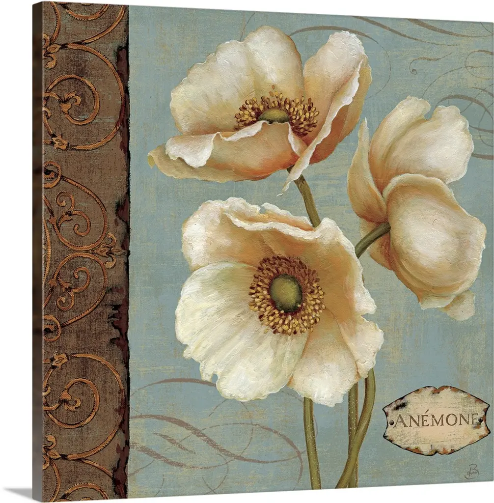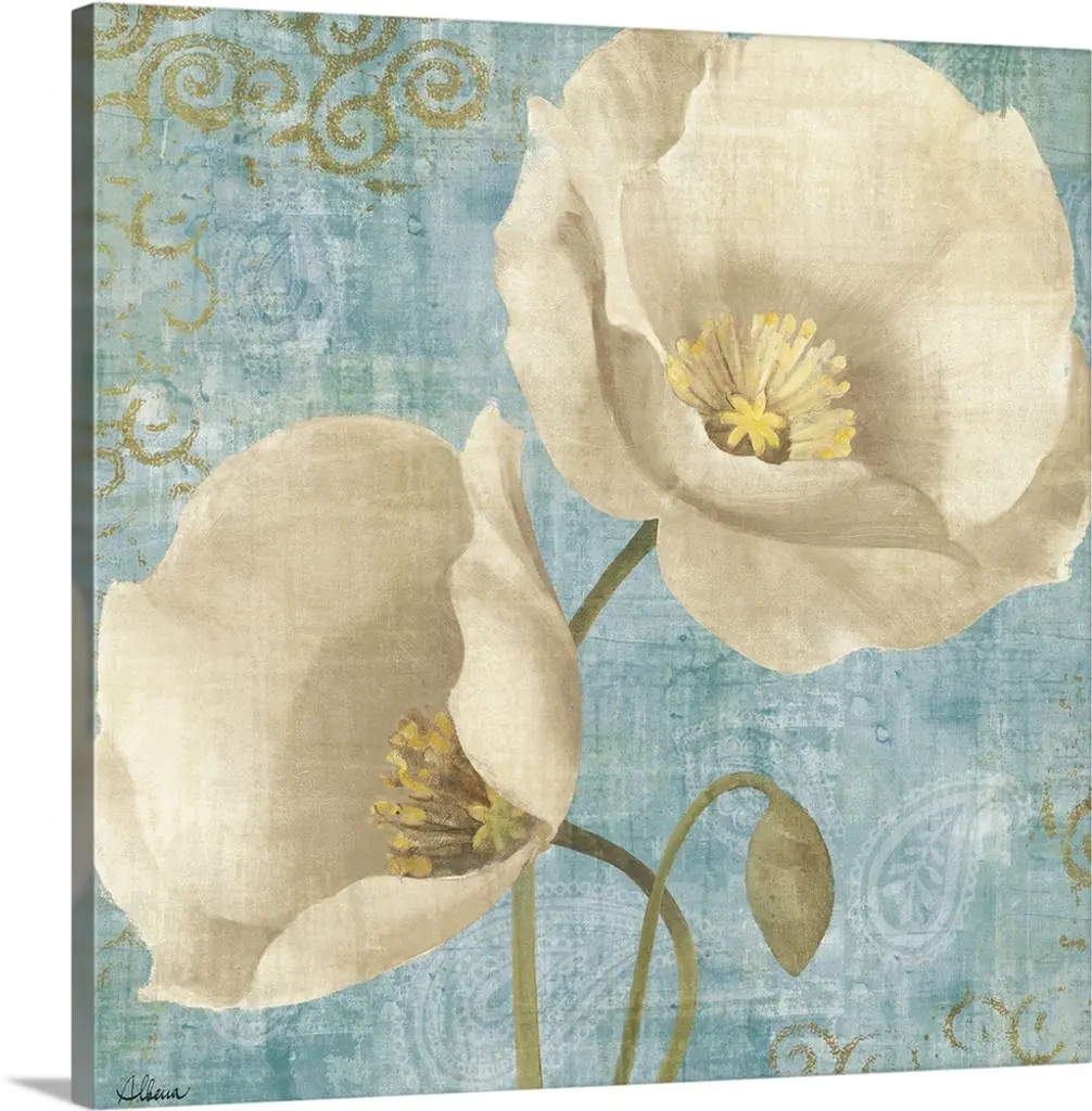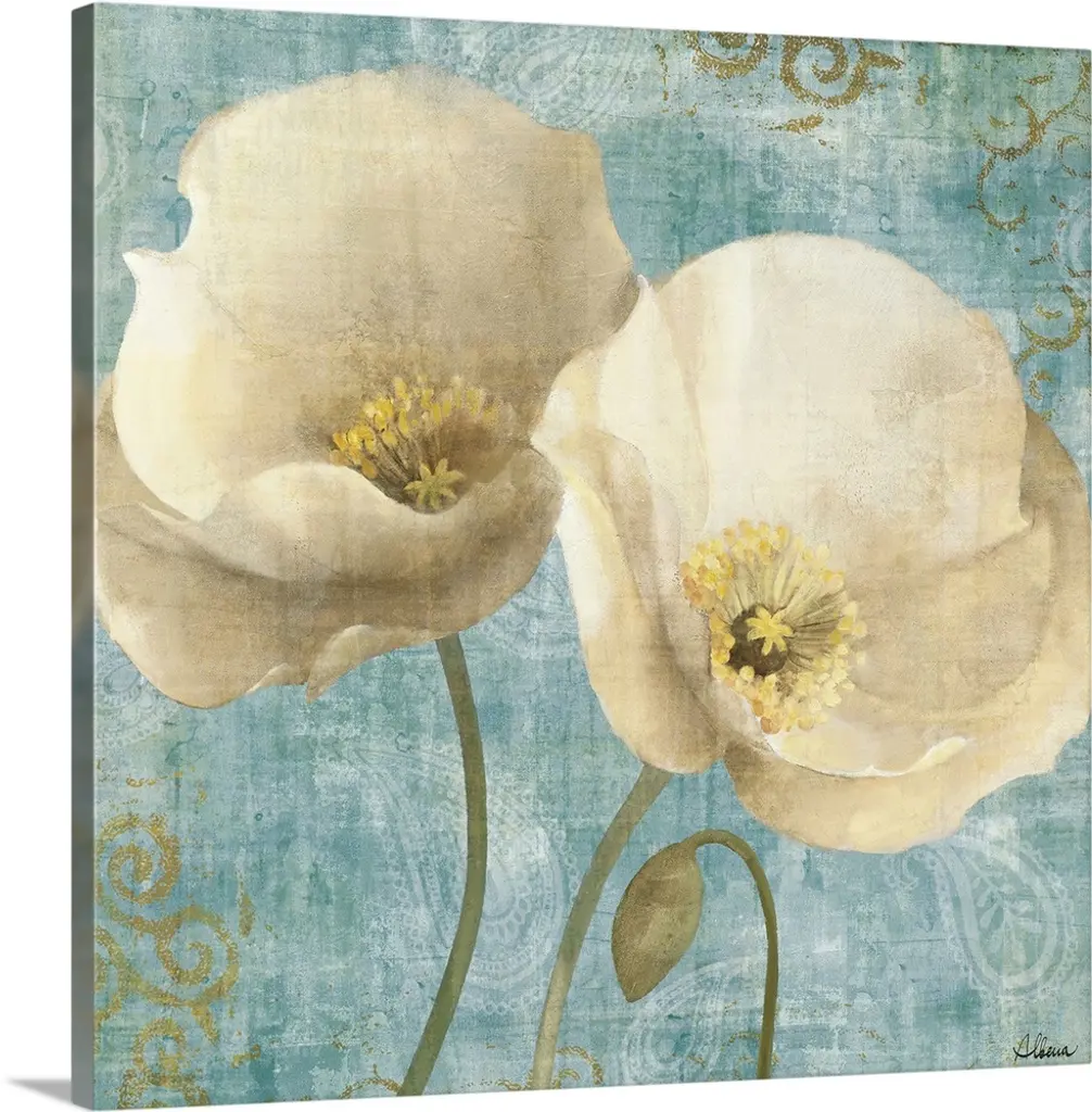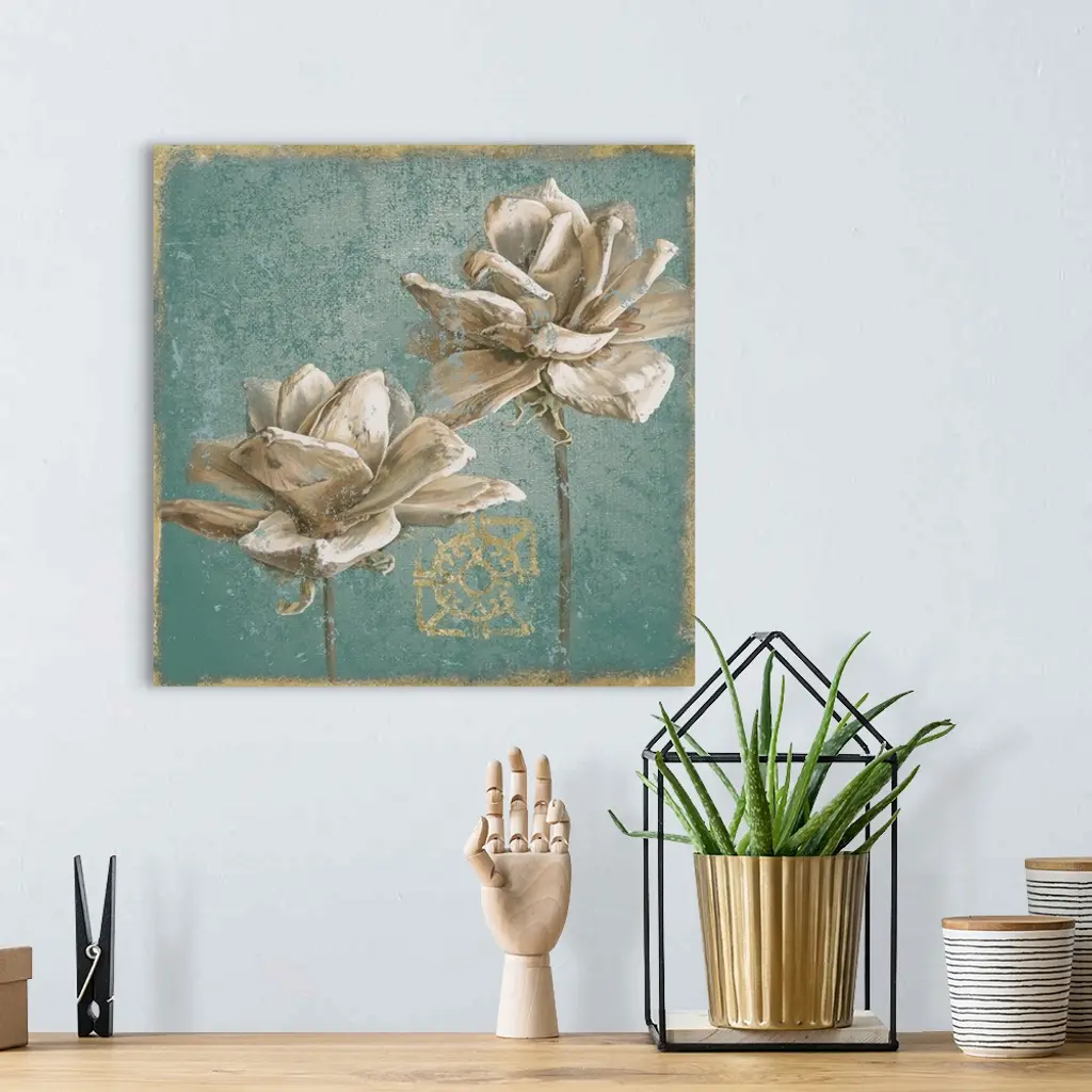 A square decorative artwork of two large white blooms with a distress overlay and gold accents.