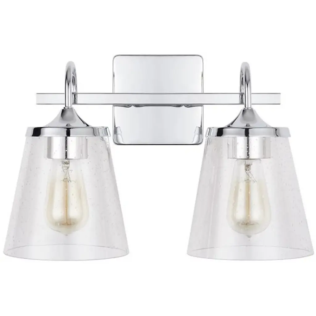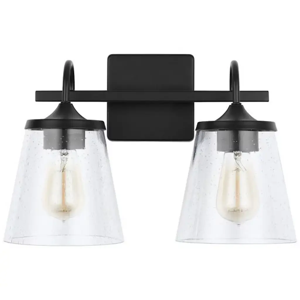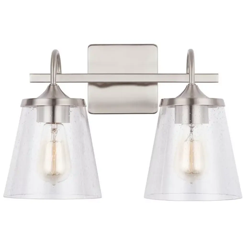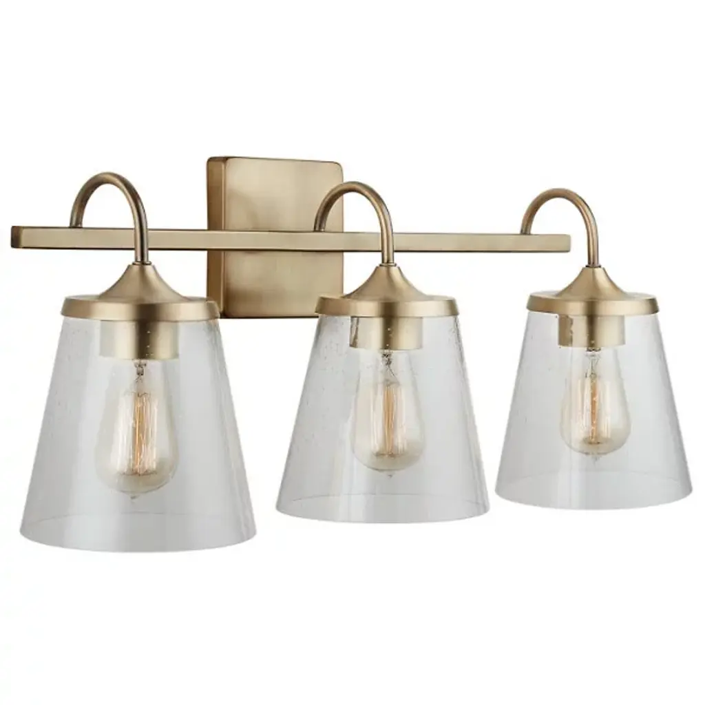 The Seeded Glass Bell Vanity Light by Capital Lighting has a tailored, elegant look. Anchored by a sleek, square backplate, a horizontal bar supports an evenly spaced arrangement of conical-shaped glass shades held by gracefully curved arms. Softly flared metal tops cap each glass shade and a visible bulb within filters through the textured surface around them to create a warm and welcoming environment. Simple yet striking, this bath bar adds an elevated touch to master and guest bathrooms alike.