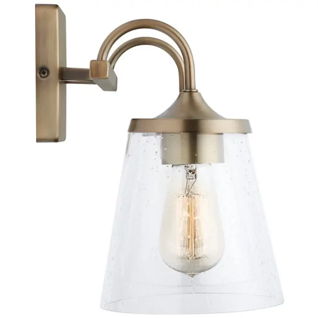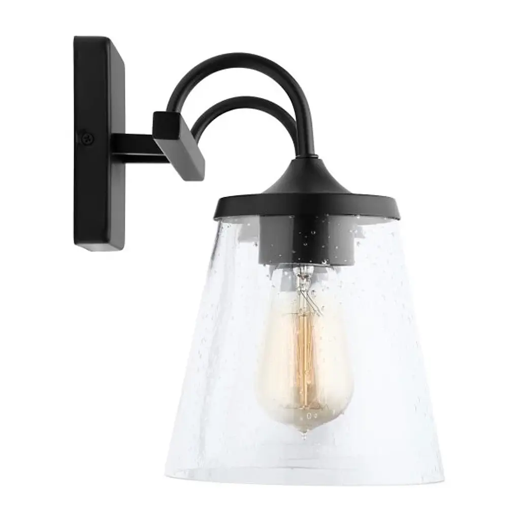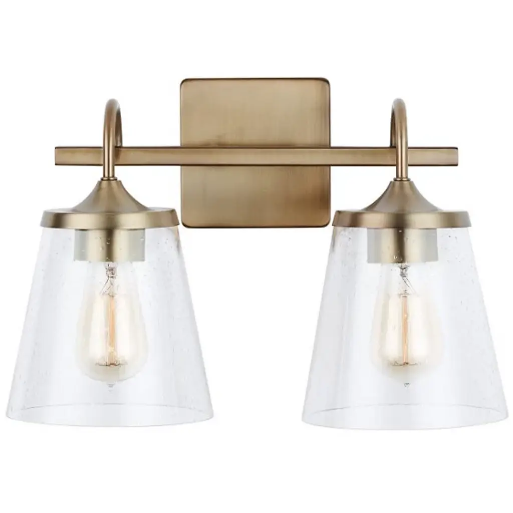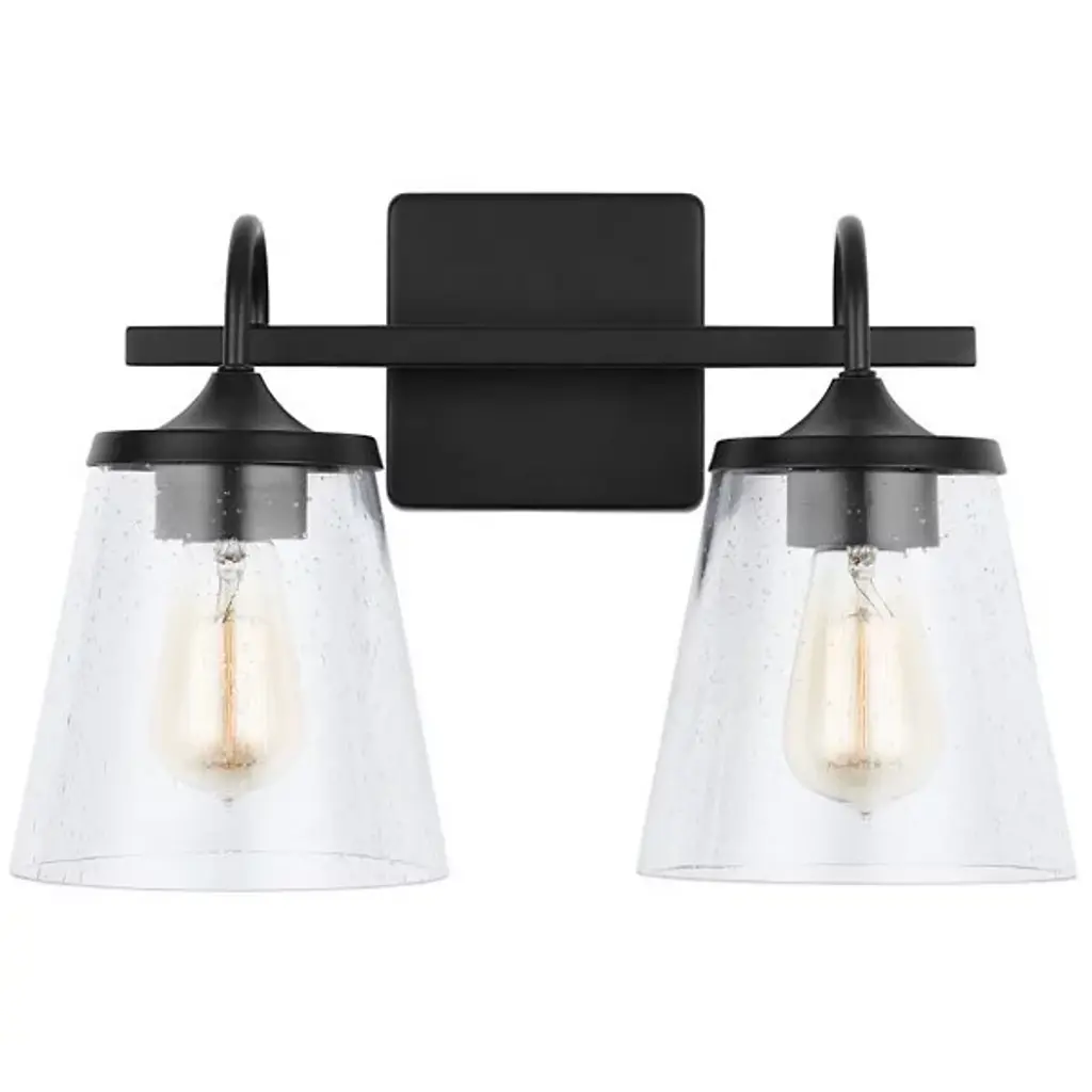 The Seeded Glass Bell Vanity Light by Capital Lighting has a tailored, elegant look. Anchored by a sleek, square backplate, a horizontal bar supports an evenly spaced arrangement of conical-shaped glass shades held by gracefully curved arms. Softly flared metal tops cap each glass shade and a visible bulb within filters through the textured surface around them to create a warm and welcoming environment. Simple yet striking, this bath bar adds an elevated touch to master and guest bathrooms alike.