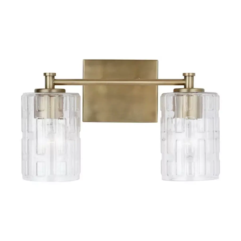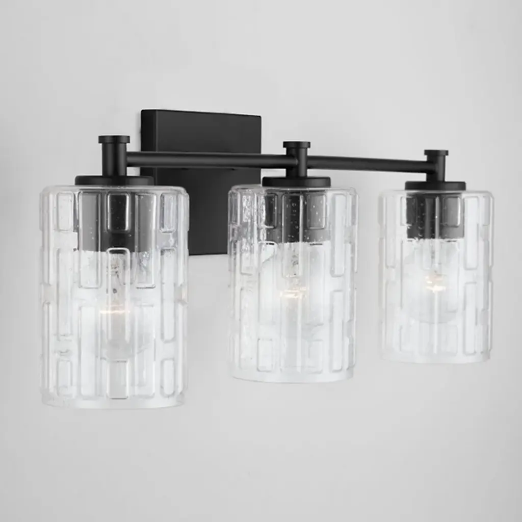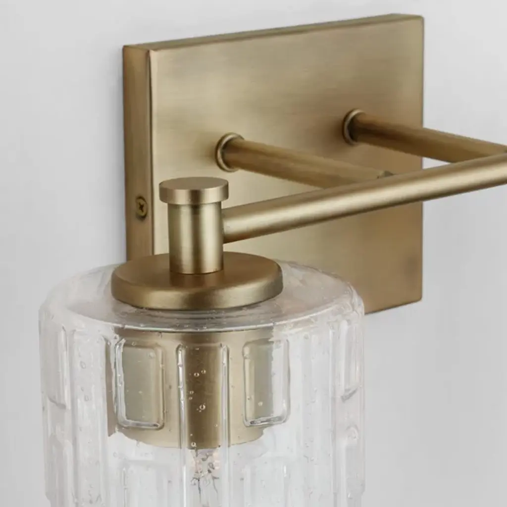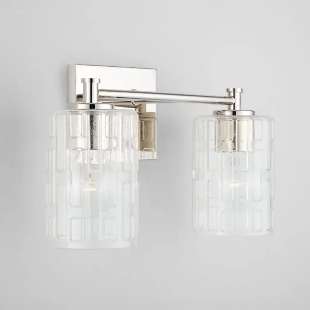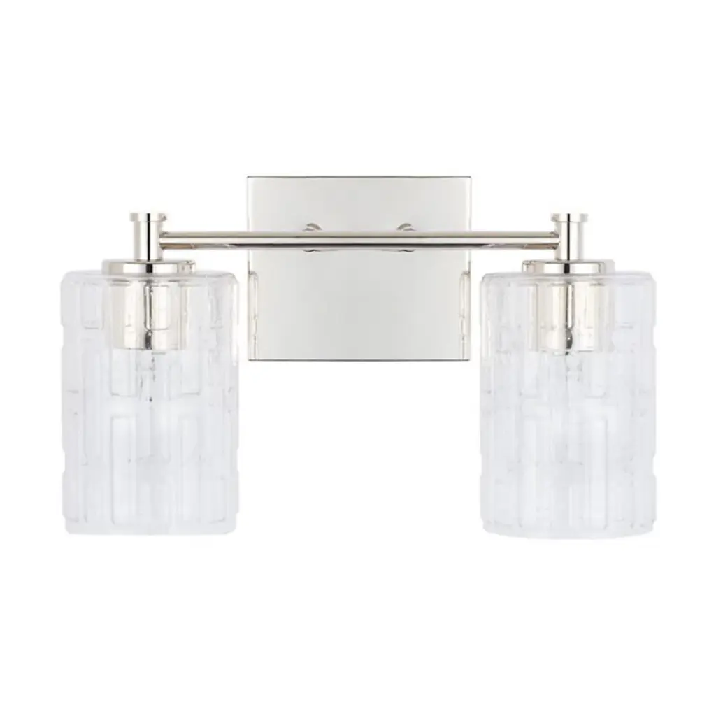 Elegant yet simple, the Seeded Impressed Glass Vanity Light from Capital Lighting enhances the ambiance of the bathroom spaces in your home. Connecting directly to the wall, a square backplate made of smooth metal extends a pair of brief arms that lead to a matching horizontal bar. A set of bulbs rest on this bar, gently enclosed with cylindrical shades of clear embossed glass. The patter on the surface of the glass comes to life as the bulbs express a clean and even layer of light.