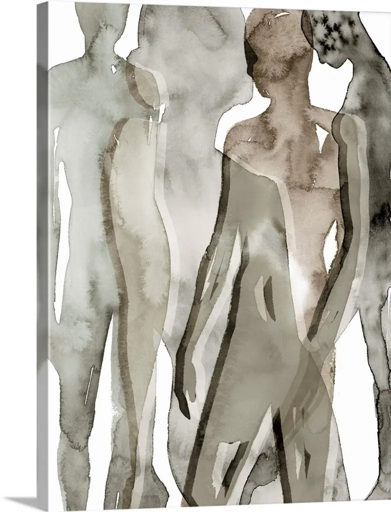 Contemporary abstract painting with small, thin lined figures separated brown, gray, and blue paint splatter.