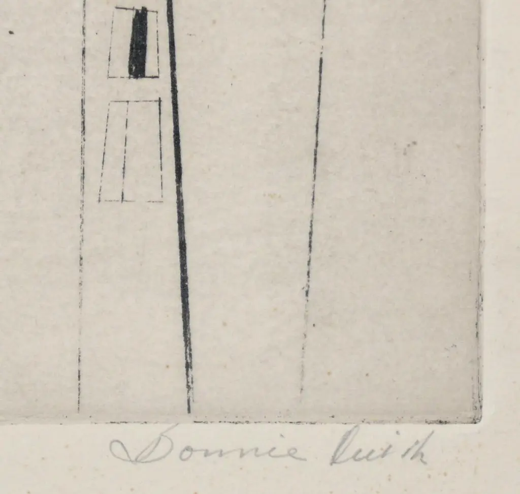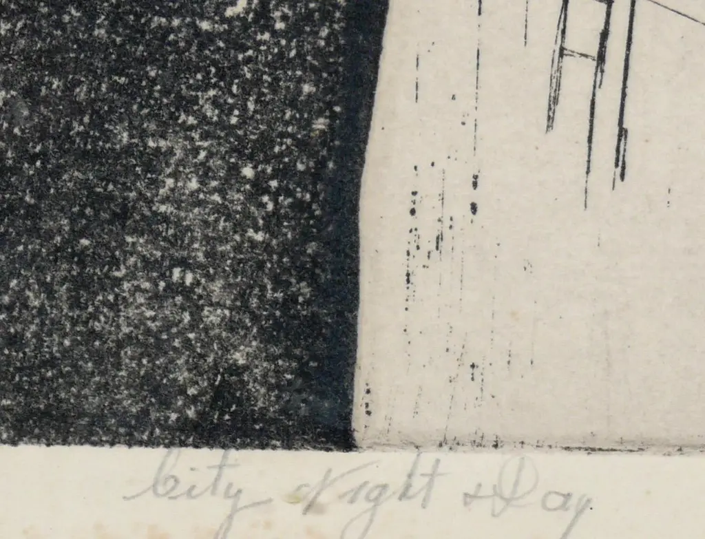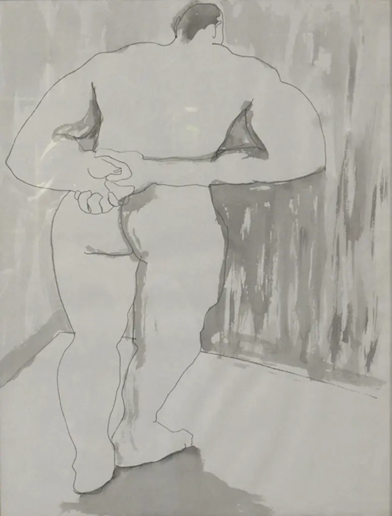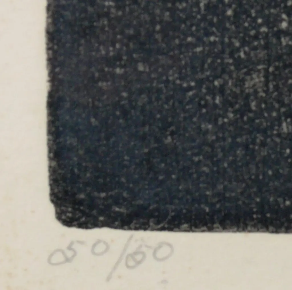 Selection of black and white Art, circa 1960s. From left to right, as seen in the first photo, they are: 1) Nude male watercolor. It measures 19" H x 15.25" W.2) Abstract lithograph or Etching, titled City Night and Day, signed Bonnie ?. It measures 24"H x 24.25"W.3) Japanese Calligraphy Painting. It measures 20.5"H x 30"W.They are all framed in clean lined black lacquered wood gallery frames.They are priced at $550 each.