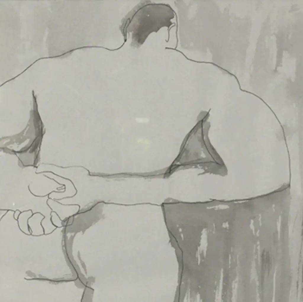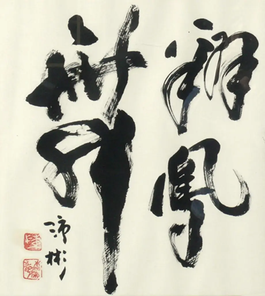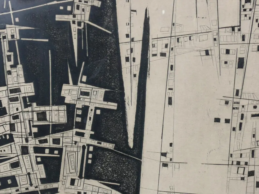 Selection of black and white Art, circa 1960s. From left to right, as seen in the first photo, they are: 1) Nude male watercolor. It measures 19" H x 15.25" W.2) Abstract lithograph or Etching, titled City Night and Day, signed Bonnie ?. It measures 24"H x 24.25"W.3) Japanese Calligraphy Painting. It measures 20.5"H x 30"W.They are all framed in clean lined black lacquered wood gallery frames.They are priced at $550 each.