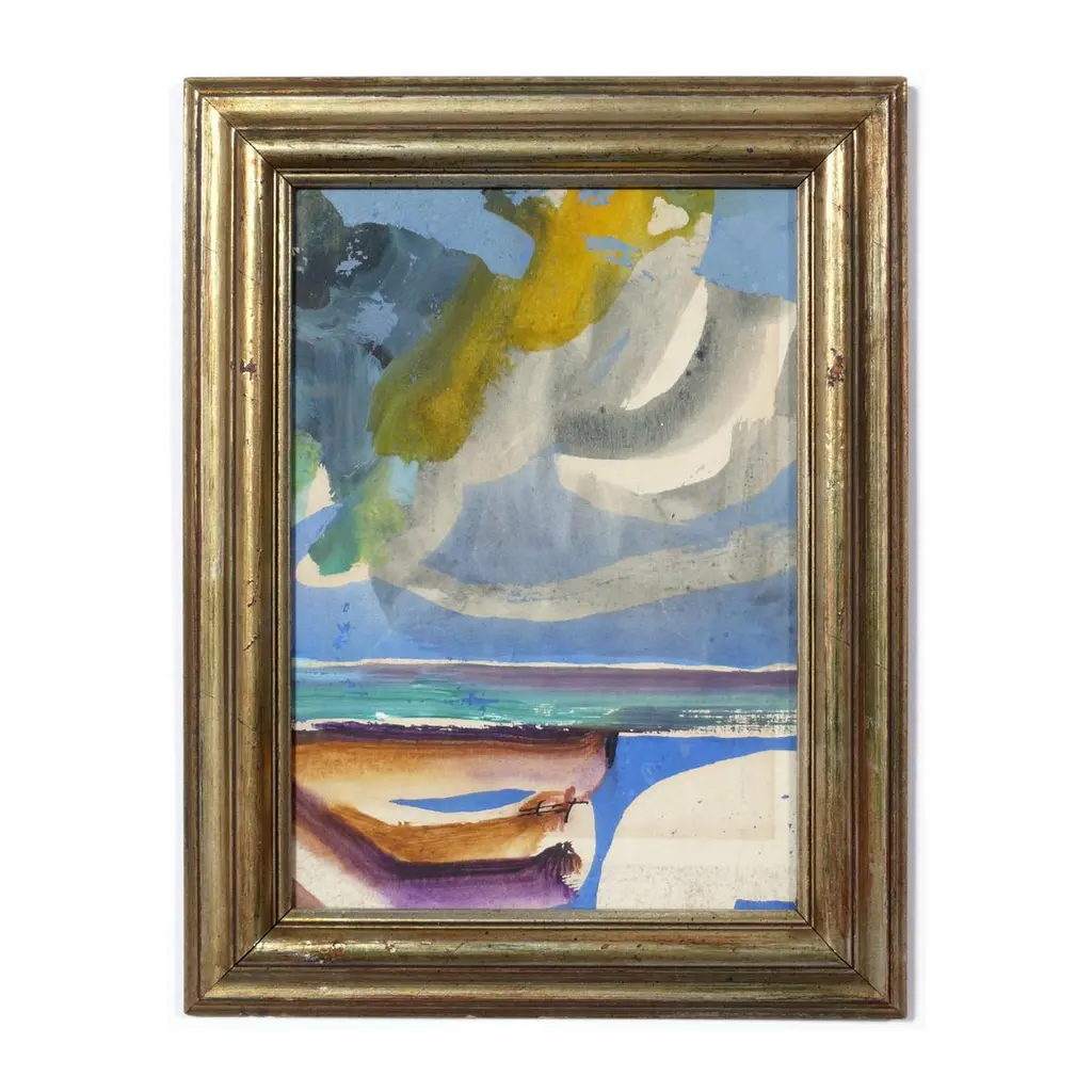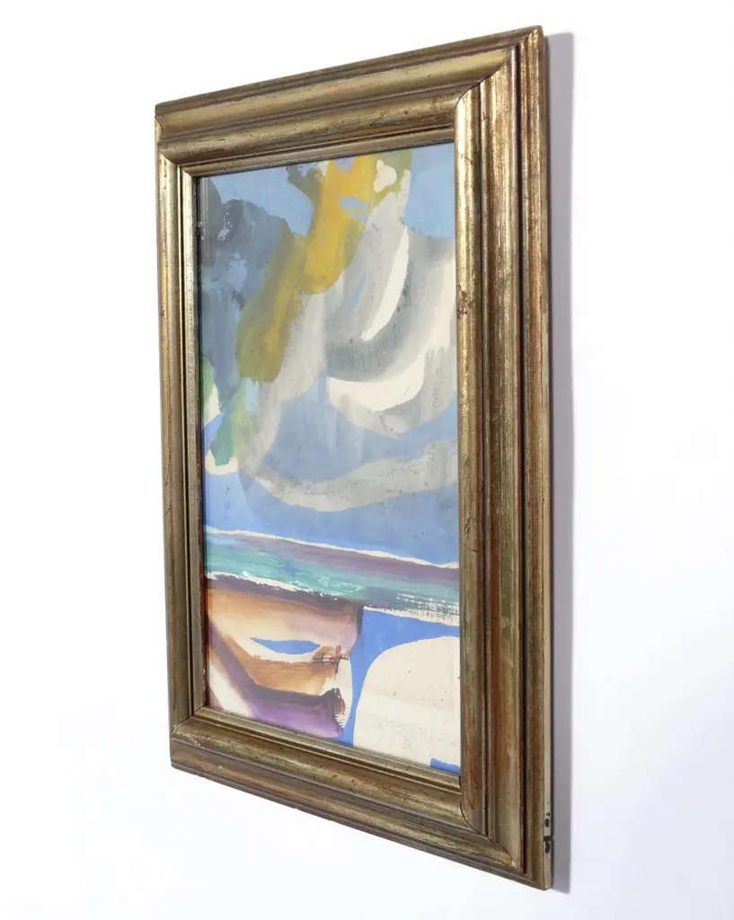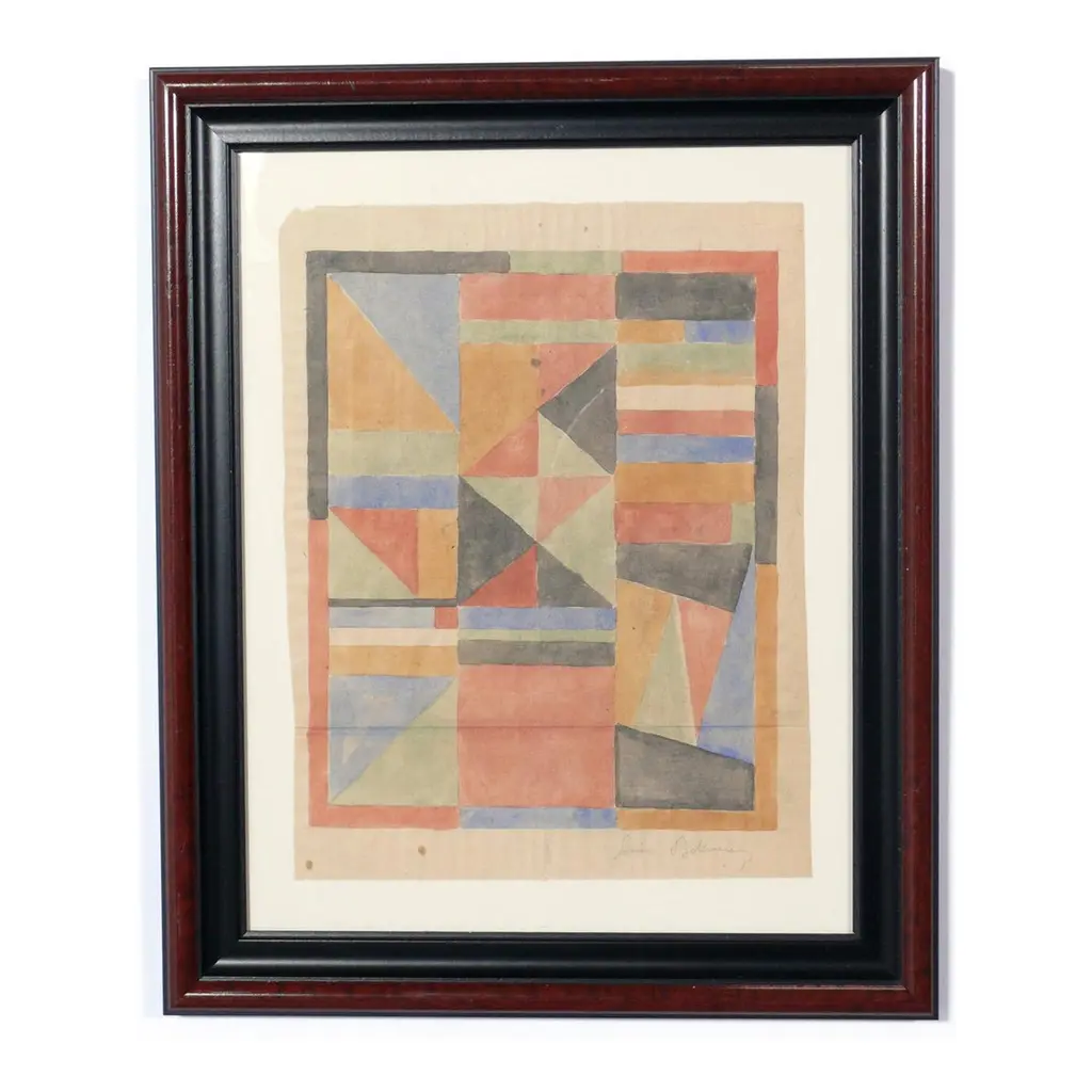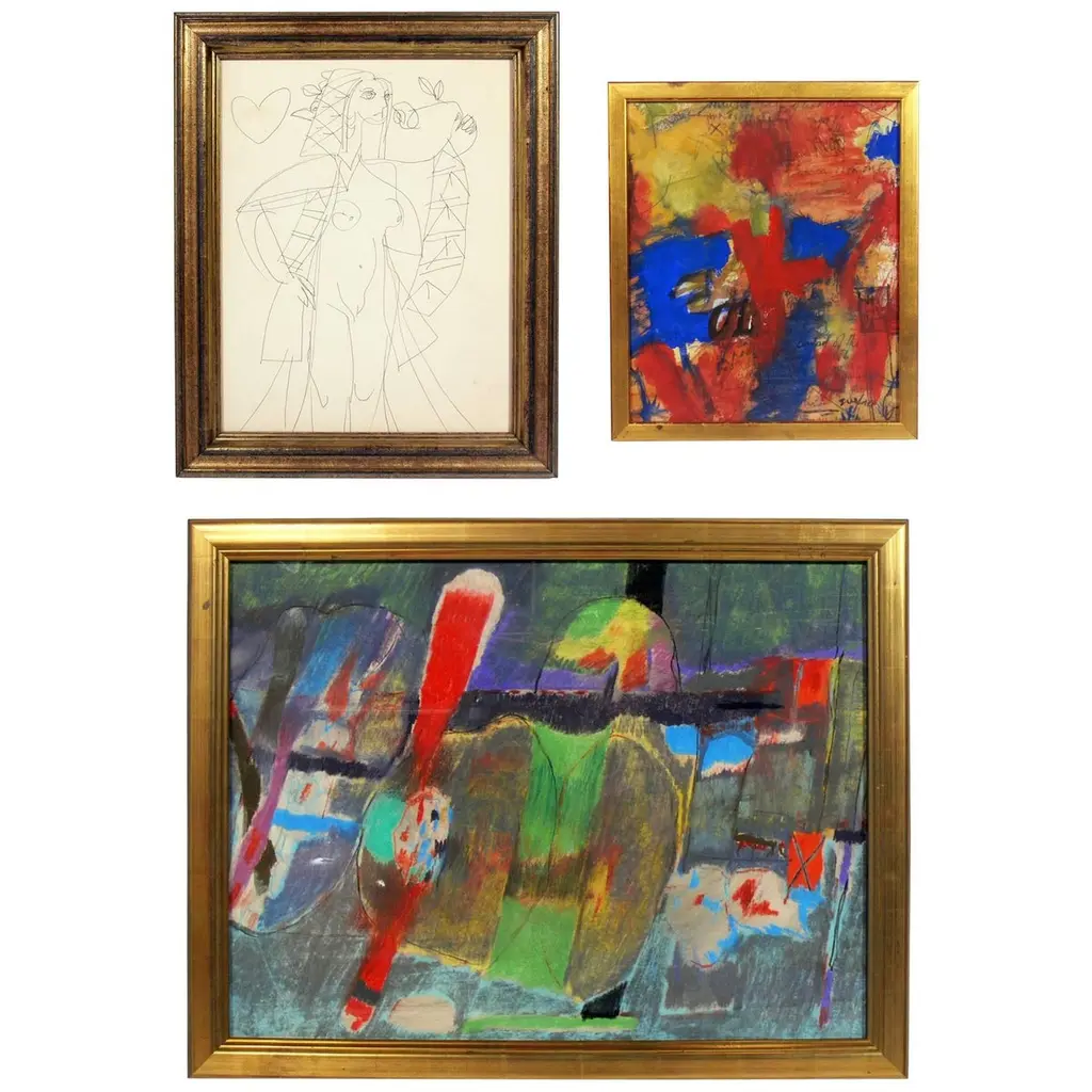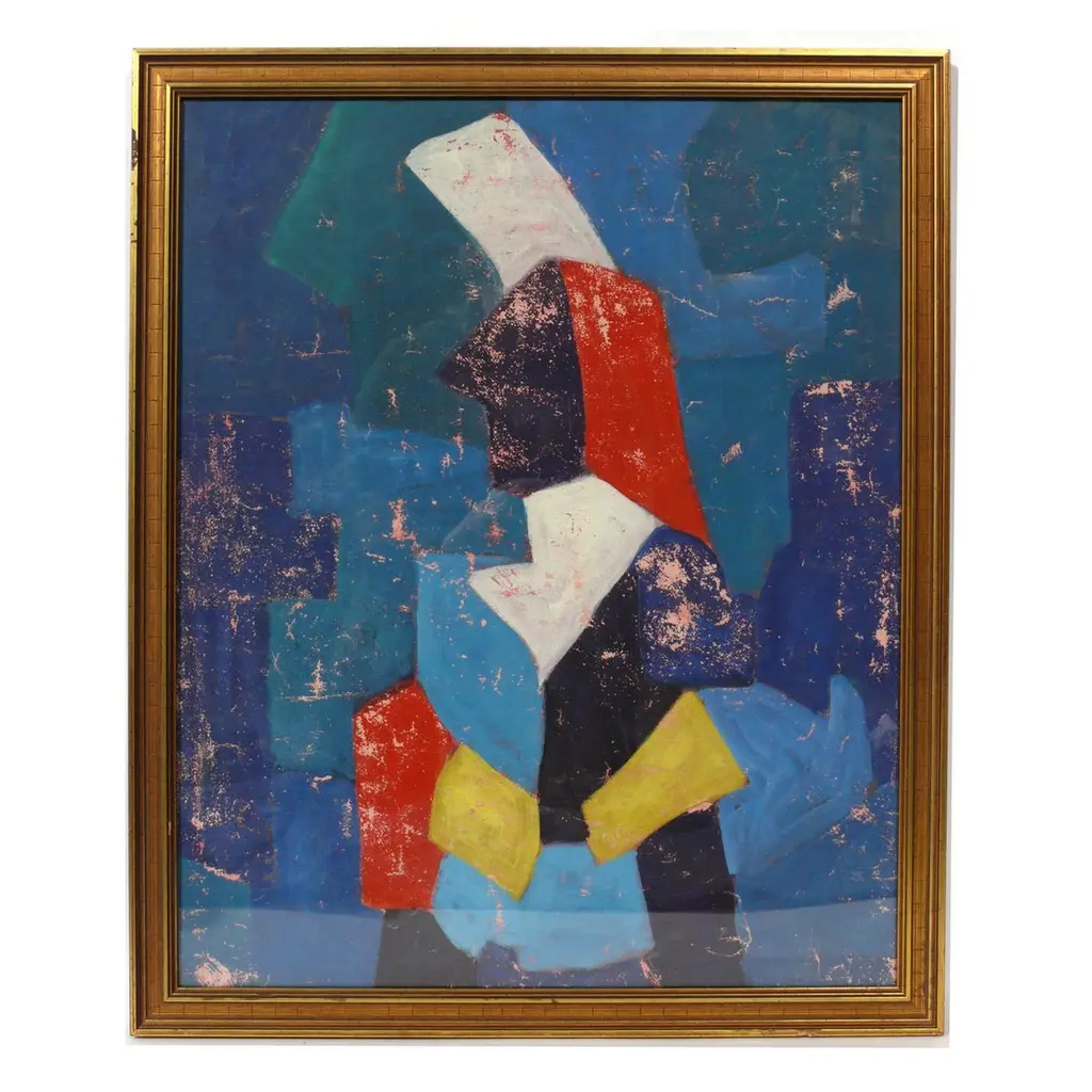 Selection of colorful modern art or gallery wall, circa 1940s-1970s. They are:Top row, left to right:1) Color Lithograph by Sonia Delaunay, French, circa 1950s. Pencil signed at lower right. It measures 16.5" H x 13.5" W.2) Cubist oil painting, probably American, circa 1940s. It has been framed in a vintage gilt frame. Various rubs and wear as seen in photos. It measures 22.75" H x 19" W.3) Naïve modernist portrait painting, American, circa 1950s. Retains original gilt frame. It measures 21.5" H x 19.5" W.Bottom row, left to right:4) Color lithograph by Jean Lurcat, French, circa 1950s. It has been professionally framed in a black lacquer gallery frame under UV resistant glass. It measures 15.5" H x 19.5" W.5) Colorful original painting of beach scene, American, circa 1950s. It has been professionally framed in a vintage silver leafed frame under UV resistant glass. It measures 13.25" H x 10" W.6) Color lithograph by Jean Lurcat, French, circa 1950s. It has been professionally framed in a black lacquer gallery frame under UV resistant glass. It measures 15.5" H x 19.5" W.They are priced at $475 each.