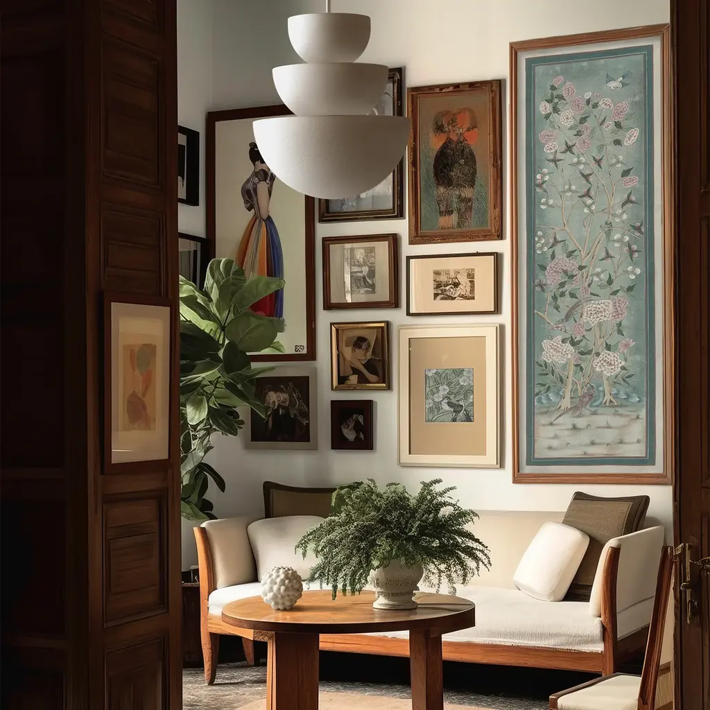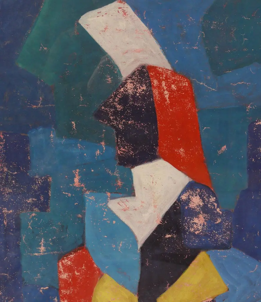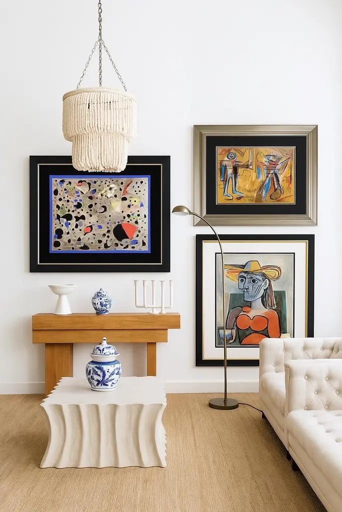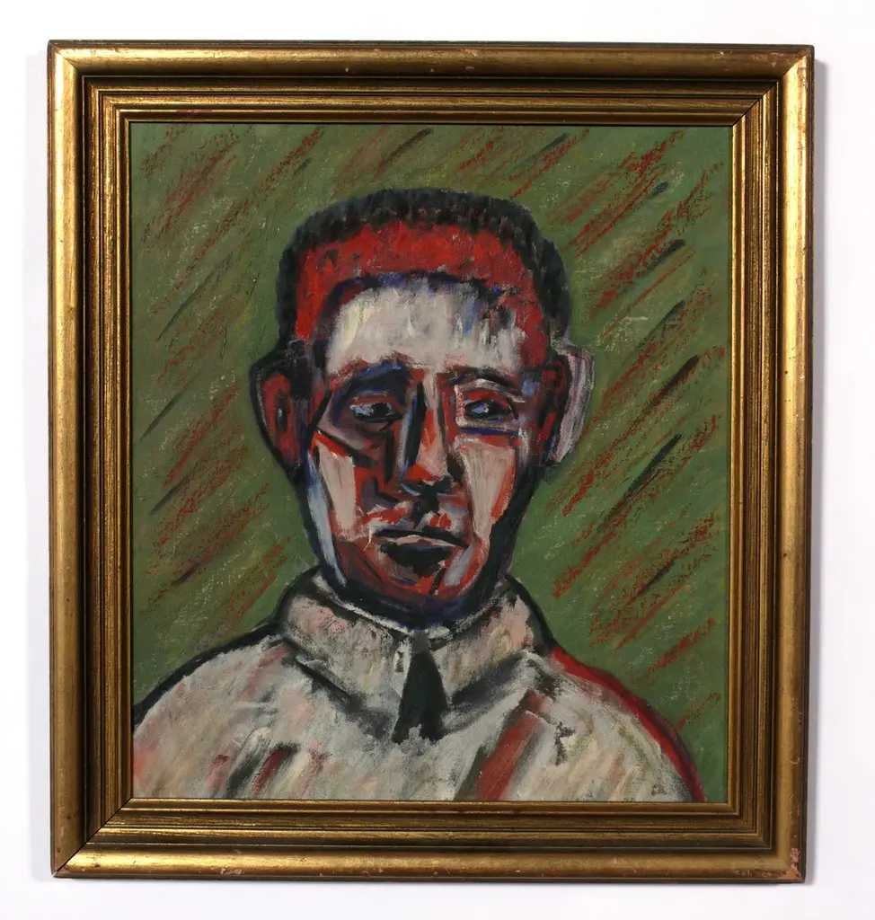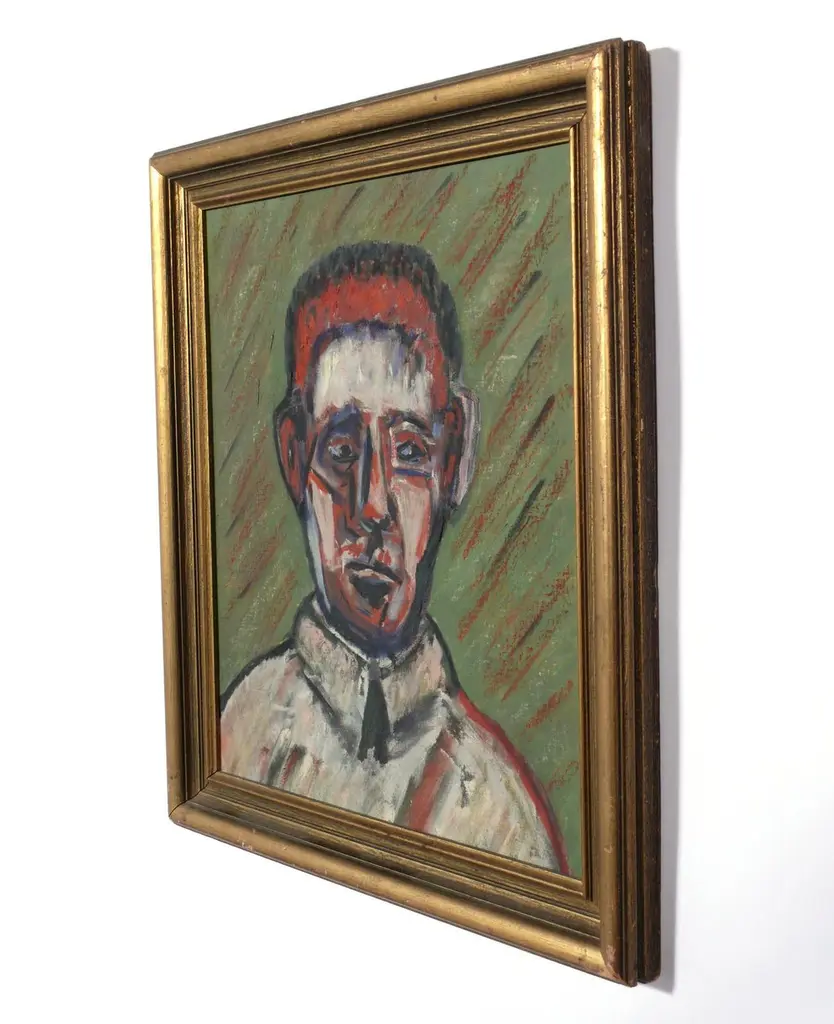 Selection of colorful modern art or gallery wall, circa 1940s-1970s. They are:Top row, left to right:1) Color Lithograph by Sonia Delaunay, French, circa 1950s. Pencil signed at lower right. It measures 16.5" H x 13.5" W.2) Cubist oil painting, probably American, circa 1940s. It has been framed in a vintage gilt frame. Various rubs and wear as seen in photos. It measures 22.75" H x 19" W.3) Naïve modernist portrait painting, American, circa 1950s. Retains original gilt frame. It measures 21.5" H x 19.5" W.Bottom row, left to right:4) Color lithograph by Jean Lurcat, French, circa 1950s. It has been professionally framed in a black lacquer gallery frame under UV resistant glass. It measures 15.5" H x 19.5" W.5) Colorful original painting of beach scene, American, circa 1950s. It has been professionally framed in a vintage silver leafed frame under UV resistant glass. It measures 13.25" H x 10" W.6) Color lithograph by Jean Lurcat, French, circa 1950s. It has been professionally framed in a black lacquer gallery frame under UV resistant glass. It measures 15.5" H x 19.5" W.They are priced at $475 each.