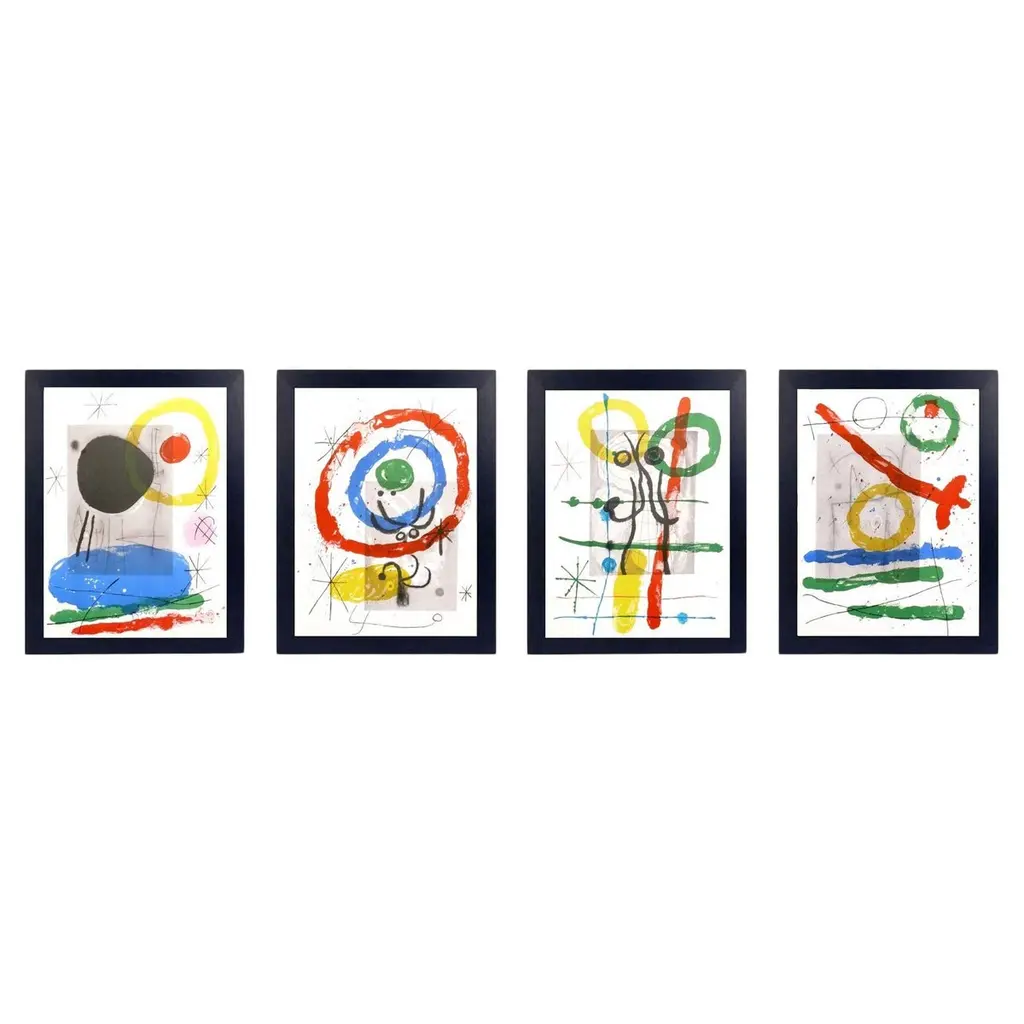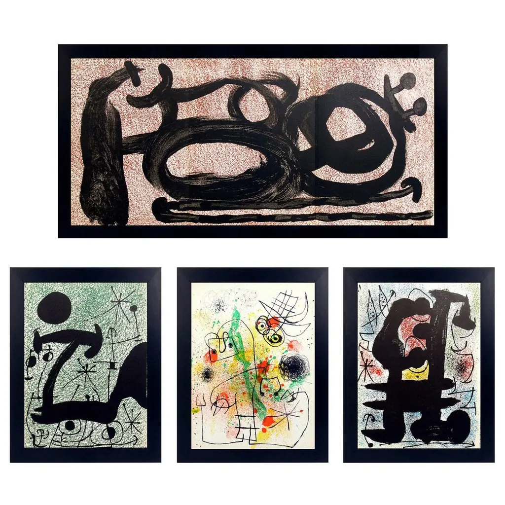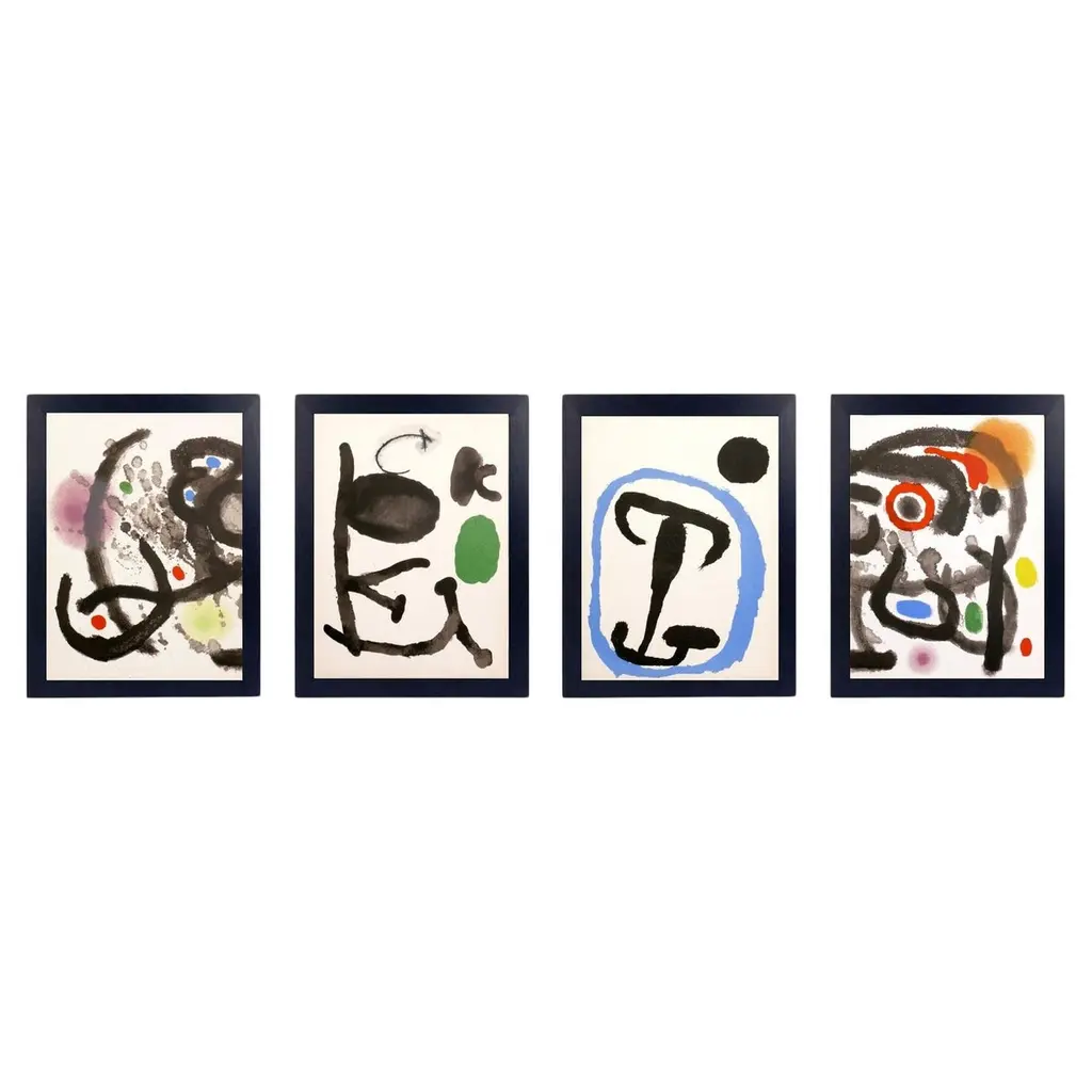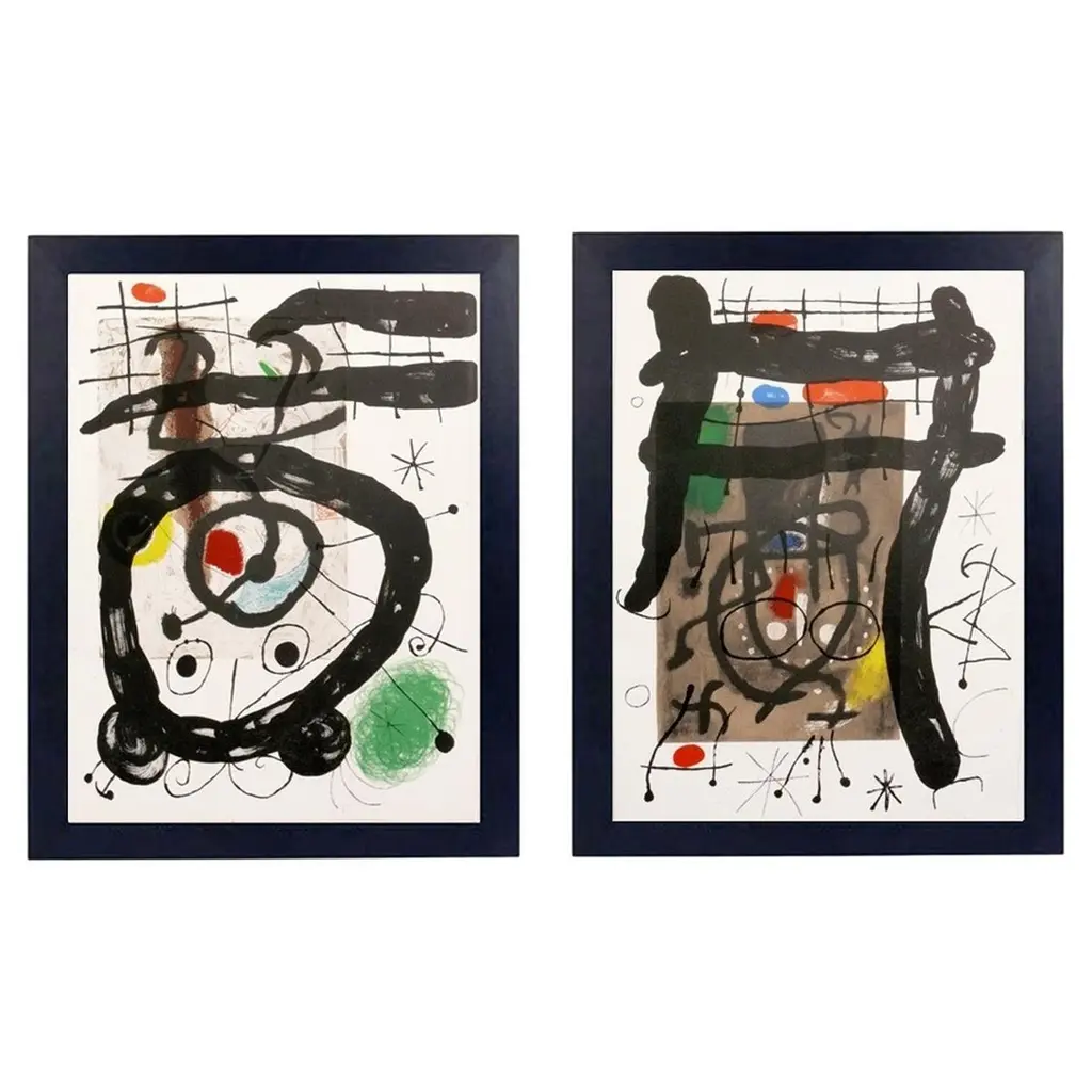 Selection of Joan Miro color lithographs, French, circa 1960s. They are from the limited edition folio “Derriere le Miroir”, published by the legendary Galerie Maeght, circa 1960s. Please see our other 1stdibs listings for more Joan Miro works from the same estate. They have been recently framed in clean lined black lacquered wood gallery frames under UV resistant glass. They are priced at $650 each.