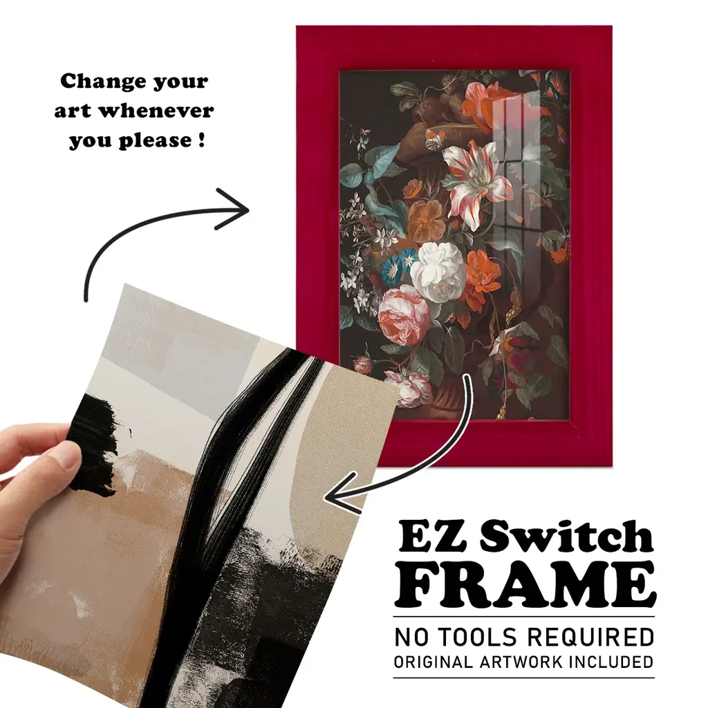 Selective Arrangement I -EZ SWITCH Framed Print w/glass-Cherry Red A delightful, framed print. Featuring a solid wood frame with real wood glass. This premium print is giclee quality. In addition, every frame features a removable back and table top stand. This allows you to change your art in the future or to just stand the art on a table for a new look. We are sure you'll enjoy our new series of EZ SWITCH Framed Art. Solid Wood Frame Real Glass Removable / Replaceable Art Built in Tabletop Stand Sizes range from 4x6 up to 12x15 - buy just one or pair them up as sets as you see fit.