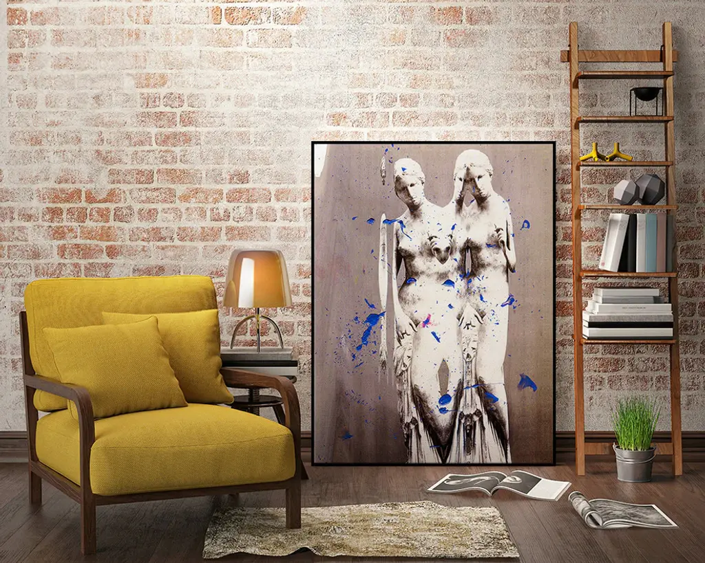 Your ready to hang artwork is printed on canvas then stretched and mounted to a 2-inch thick - hand stained black wood frame. Arrives at your door complete with an easy to use self-leveling hangking kit.