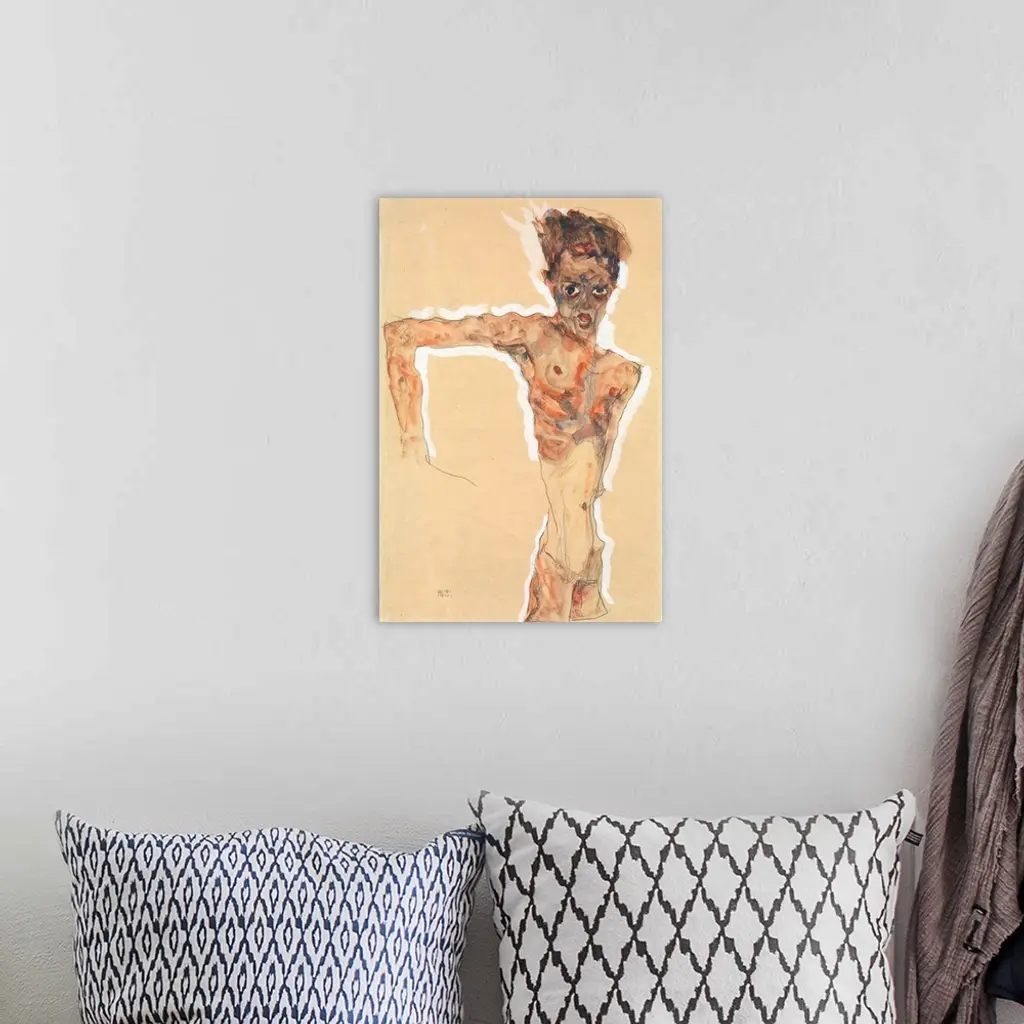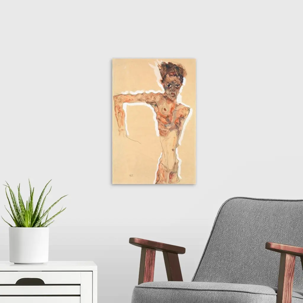 Egon Schiele's career was short, intense, and amazingly productive. Before succumbing to influenza in 1918 at the age of twenty-eight, he created over three hundred oil paintings and several thousand works on paper. The human figure provided Schiele with his most potent subject matter for both paintings and drawings. The self-portraits of his large series of watercolors and paintings produced between 1910 and 1918-of which this one is a prime example-are searing, psychologically complex images. The emaciated, tortured figure of the artist, bony and angular, bristles with an inner tension made visible by the agitated pencil line and painted white surrounding aura. Schiele stares wildly, his large, dark eyes glaring menacingly, his mouth open, and his shock of hair standing on end. In a pose suggestive of the crucified Christ, his arm is thrust out awkwardly and bent sharply at the elbow. Color is limited to shades of brown, with only certain areas of the body (mouth, nipples, navel, and genitals) tinted red.