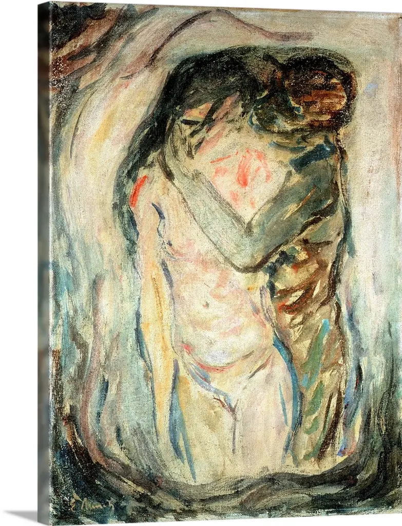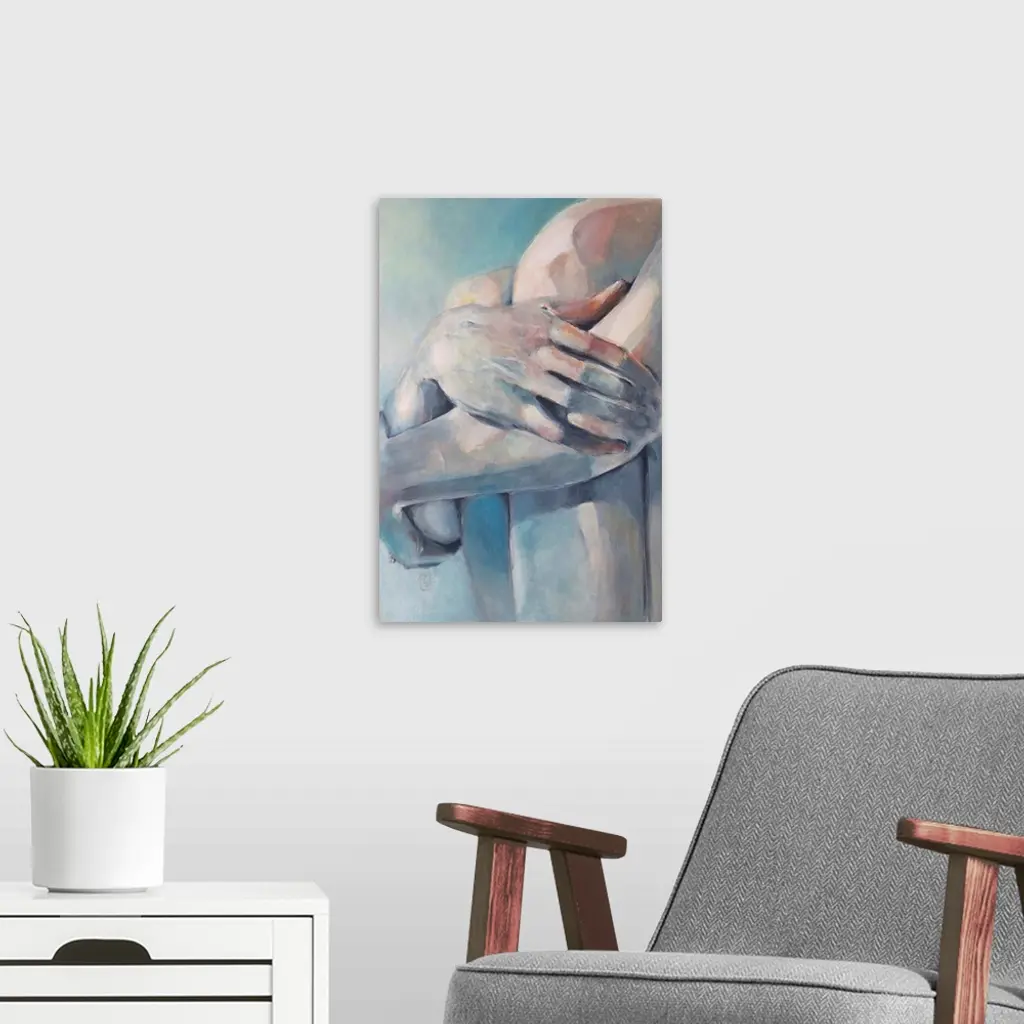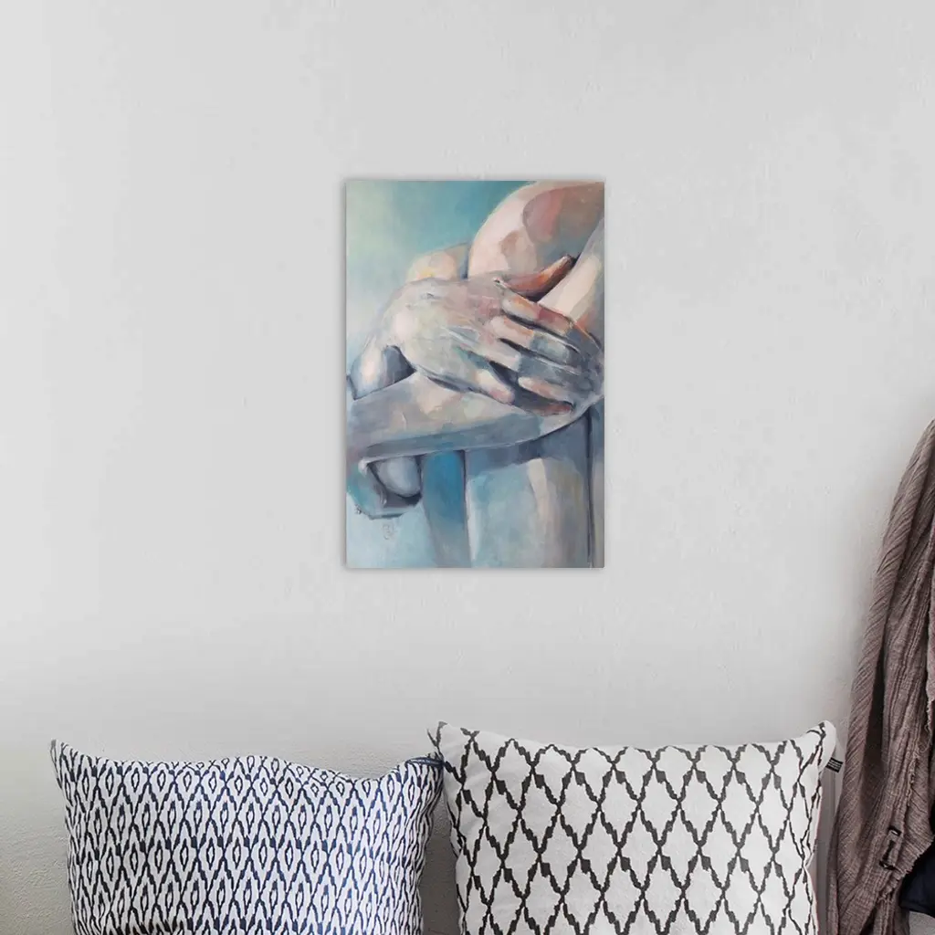 A quiet moment of reflection is shaped by bright blues and pale oranges in this contemporary artwork.