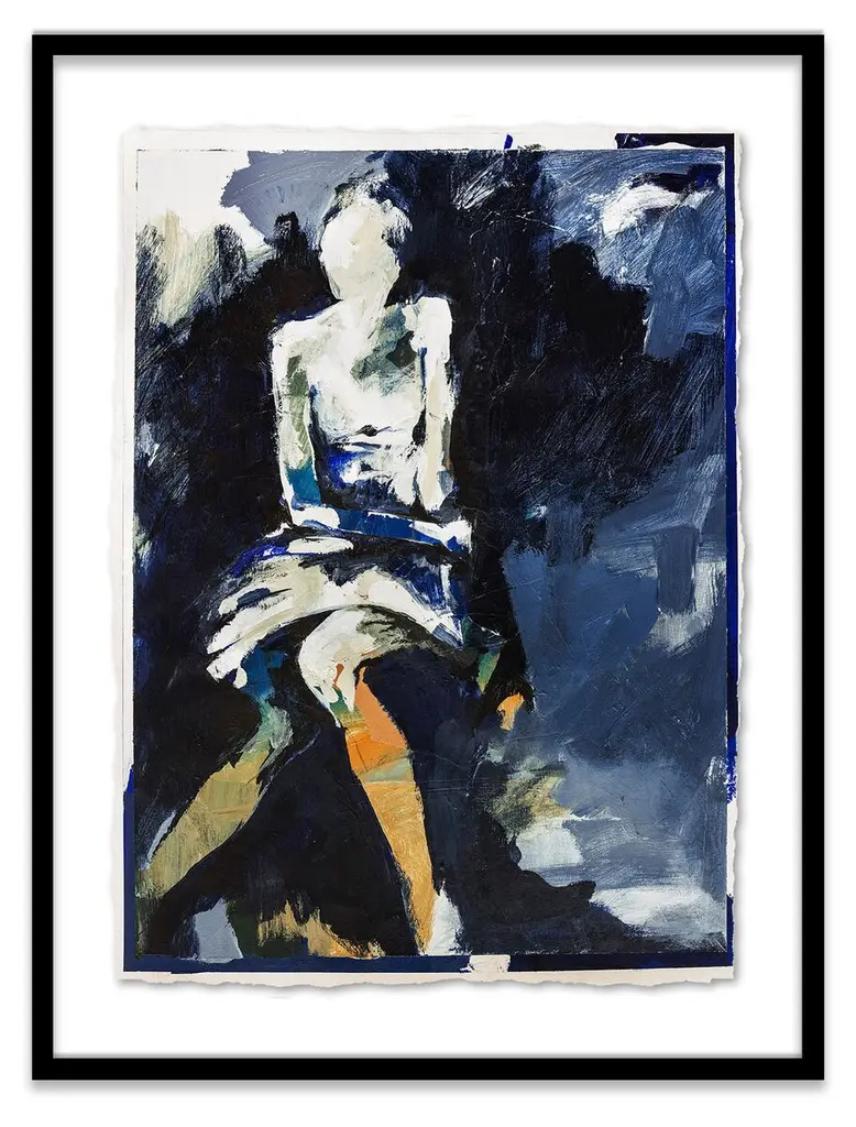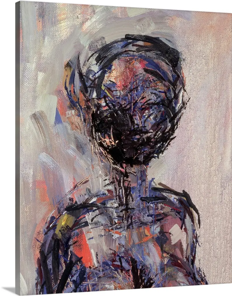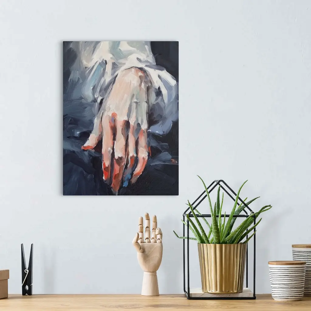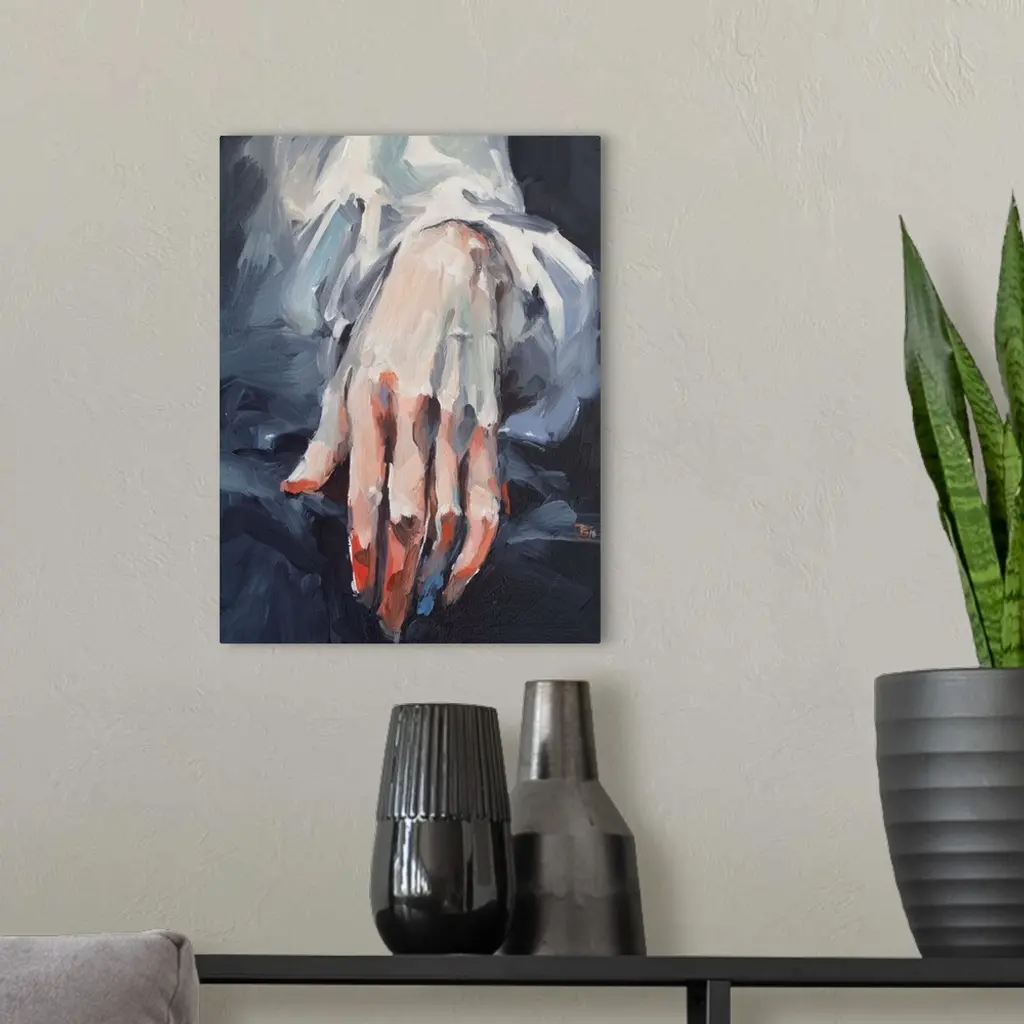 Complementary colors and broad brush strokes add to the suspense of this contemporary close-up of a hand. This is one of two artworks.