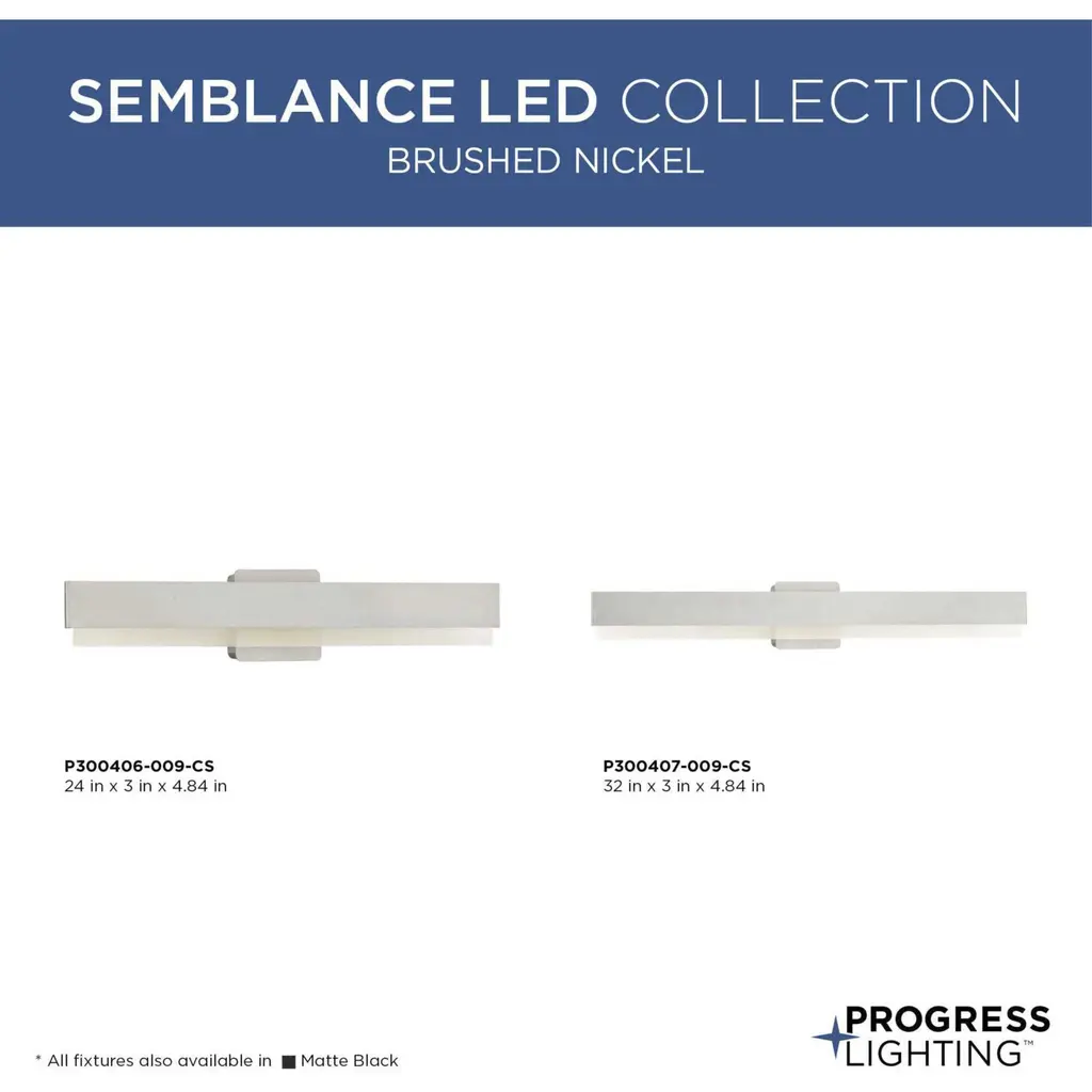 Add contemporary style to bathrooms with the Semblance Collection LED Large Linear Vanity light. This versatile design is ideal for any bathroom in contemporary or modern commercial or residential settings. Progress Lighting products are designed for exceptional quality, reliability, and functionality. Anchored by a sleek, square backplate, a handsome rectilinear metal bar holds an acrylic diffuser along its length, creating edge-lit illumination. Finished in soft brushed nickel. Color selectable technology offers a choice of 3000K, 4000K or 5000K at a flip of a switch to perfectly illuminate surroundings with multi-directional, energy-efficient light. This versatile design is ideal for any bathroom in contemporary or modern commercial or residential settings. Progress Lighting products are designed for exceptional quality, reliability, and functionality.