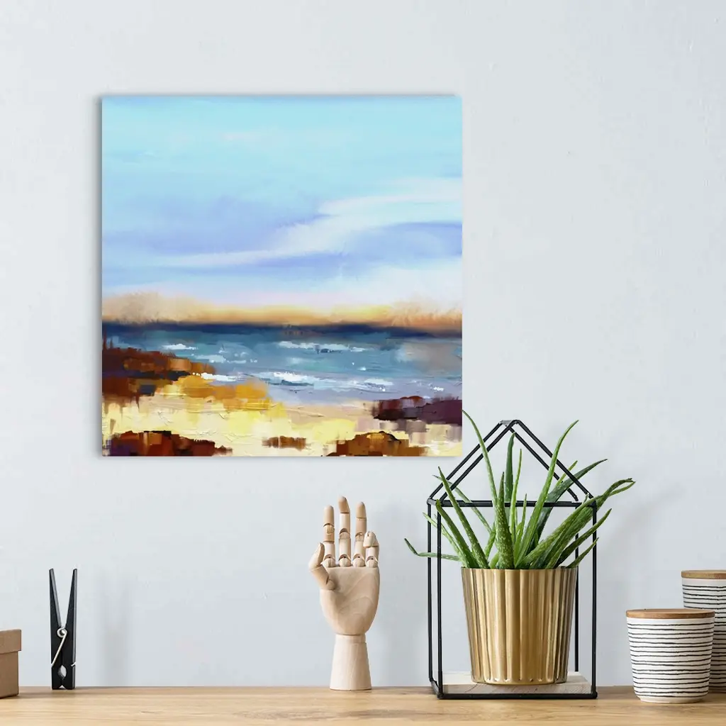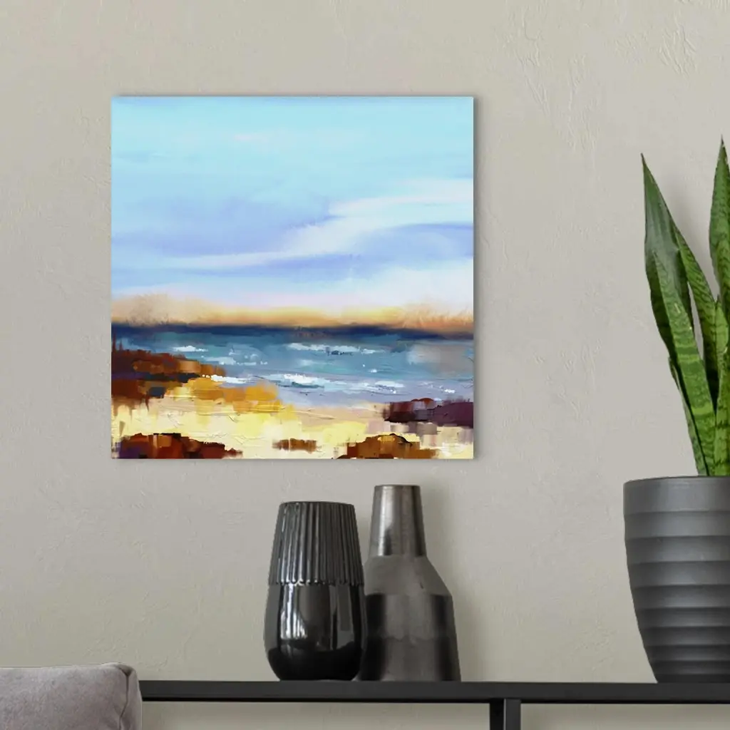 Originally an abstract oil painting seascape on canvas. Semi- abstract image of sea and beach with waves, rocks and blue sky. Summer season nature background.