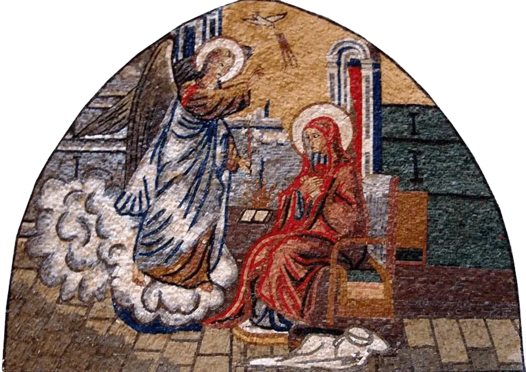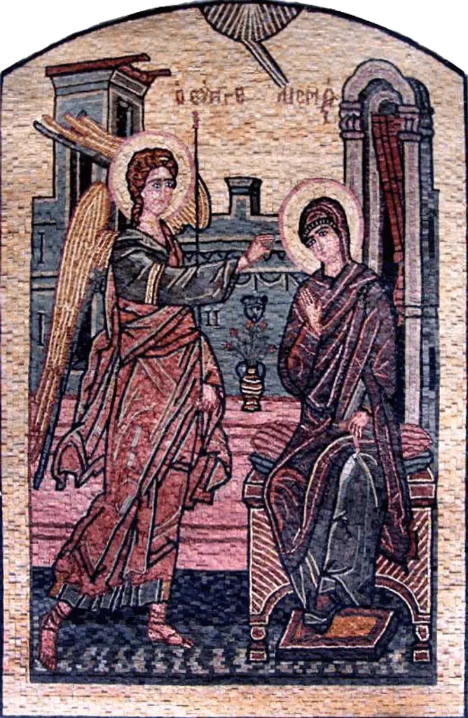 Introducing our exquisite Semi Arch Shaped Icon Mosaic, a stunning representation of artistry and devotion crafted for your sacred space. This hand-made marble mosaic offers not just a piece of décor but a symbol of faith, meticulously designed to bring tranquility and spiritual contemplation into your home or place of worship.Each Semi Arch Shaped Icon Mosaic is composed of all-natural stones and hand-cut tiles, showcasing the remarkable craftsmanship that goes into every creation. The meticulous attention to detail ensures that every piece is unique, embodying the beauty and depth of Christian art. This particular mosaic portrays the moment of Annunciation, a significant event wherein the archangel Gabriel reveals to Mary, the mother of Jesus, that she will conceive the Son of God.Measuring perfectly for prominent display, the Semi Arch Shaped Icon Mosaic serves as a stunning focal point in any room. Whether placed in a living room, chapel, or prayer corner, it invites reflection and reverence. The rich textures and warm hues of the natural stones create an inviting atmosphere, enhancing the overall aesthetic of your space.Elevate your spiritual practice or gift it to a loved one with this exceptional artwork that transcends mere decoration; it is a piece of history and faith wrapped in one. Perfect for those who appreciate the beauty of religious art and the significance it carries, the Semi Arch Shaped Icon Mosaic will be a cherished addition to any collection.Experience the splendid elegance of this handcrafted masterpiece and let the Semi Arch Shaped Icon Mosaic enrich your surroundings and inspire your faith.