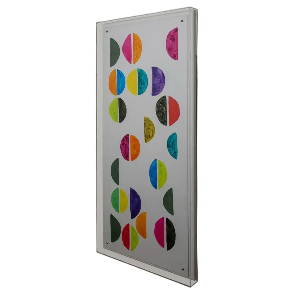 We love the bright shadowbox panels celebrating color in our artwork series named "Semicircles". It is a colorful and expressive pair embracing the bold half circles against a white background with expressions of color in our artwork. Each panel is individually sold. The image is a giclee. The art is mounted under an acrylic shadowbox frame and attached to an upholstered interior board covered in a cotton/linen fabric. Measurement: panels are 48"H x 22"W x 2.5"D each. Materials: acrylic shadowbox frame, interior board, paper.