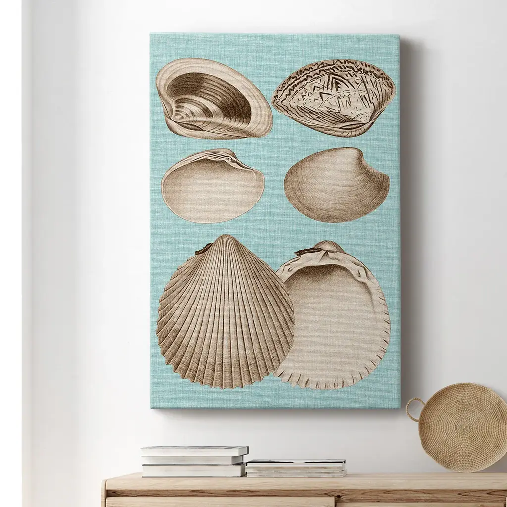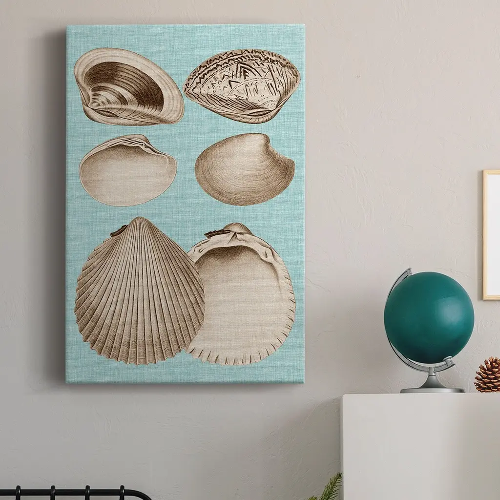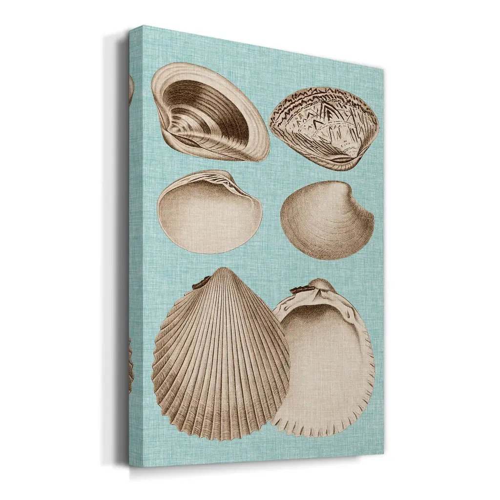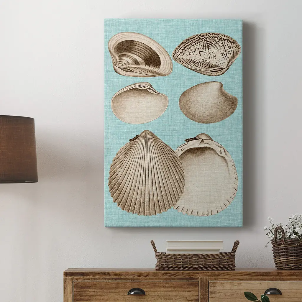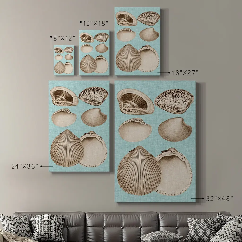 Sepia & Aqua Shells IX Premium Gallery Wrapped Canvas - Ready to Hang A premium hand stretched gallery wrapped canvas print created to last. Featuring a beveled a solid wood stretcher bar, each piece comes ready to hand 6 SIZES AVAILABLE 8''X12'' - Overall Size 12''X18'' - Overall Size 18''X27'' - Overall Size 24''x36'' - Overall Size 32''x48'' - Overall Size 40''x60'' - Overall Size Each piece is made to order. Built to Last Each piece comes ready to hang Solid wood stretcher Fade and Water resistant Made domestically