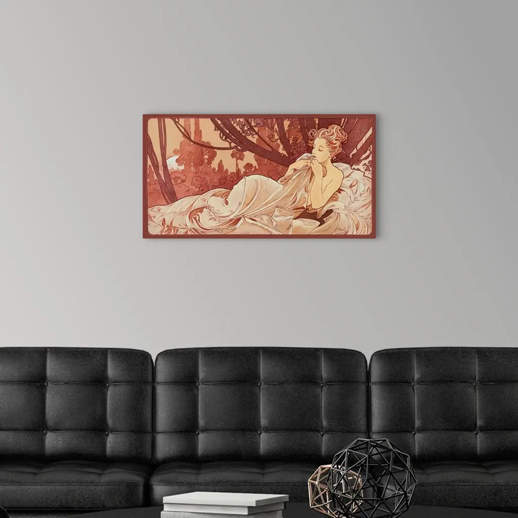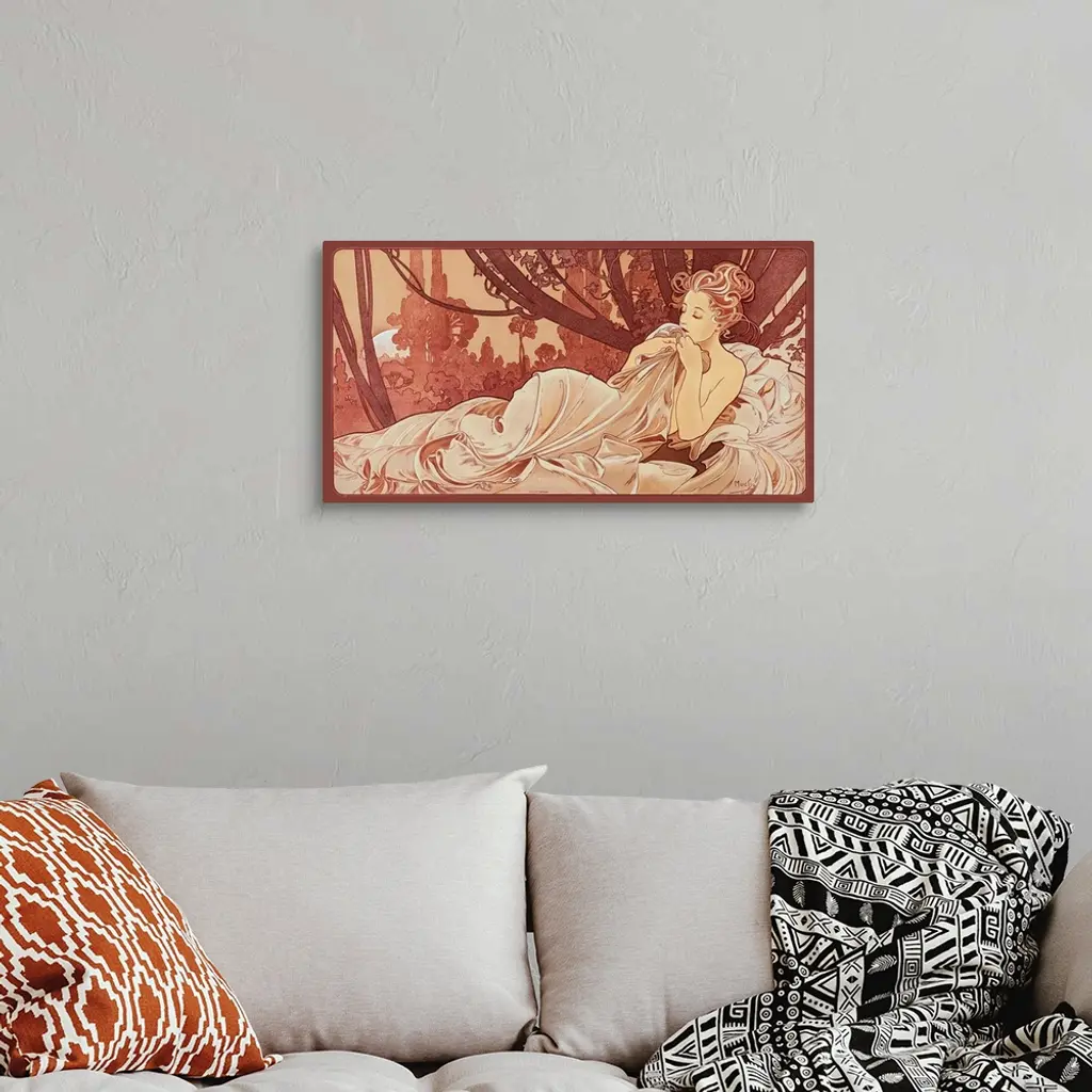 Sepia toned artwork of a woman draped in a silky cloth while lying on a bed.