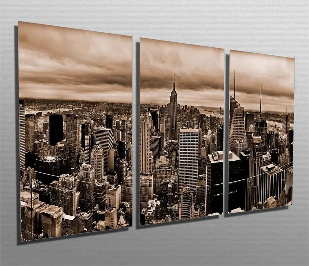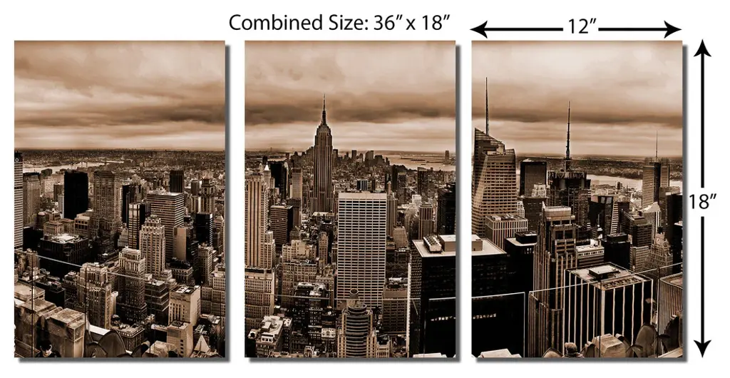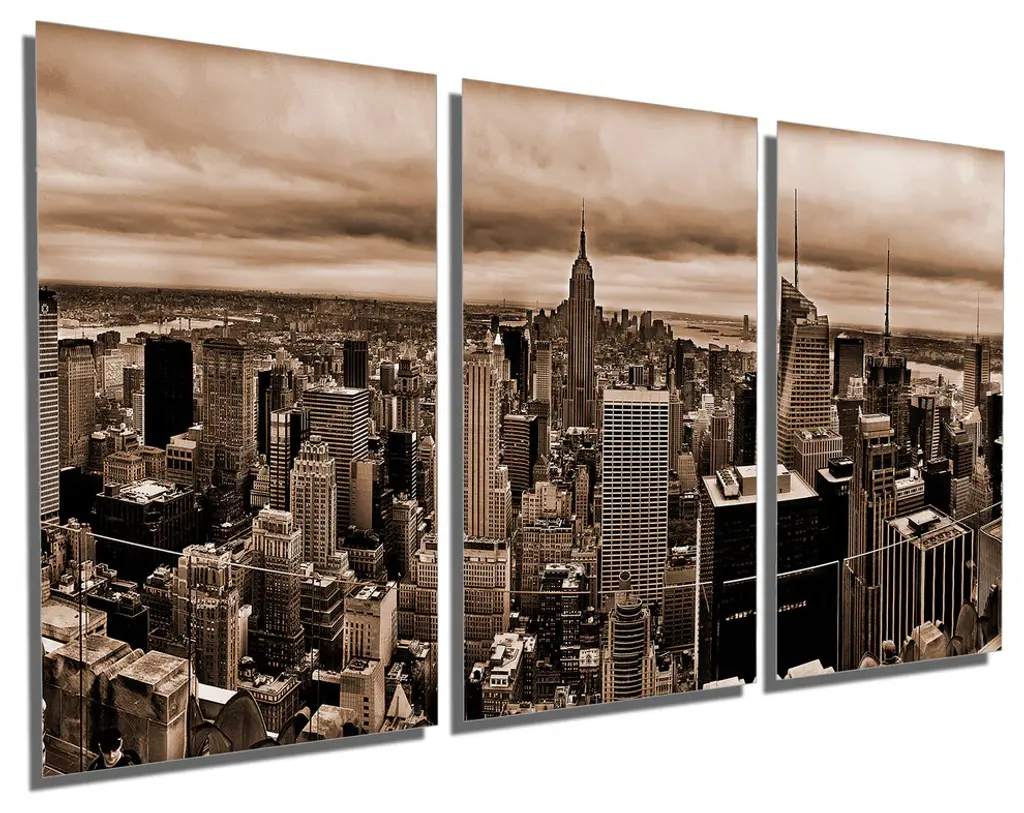 36"œ x 18"œ total size. Ready To Hang! (3 pieces - 12"œ x 18"œ each). 3 Panel Split (Triptych) Beautiful New York City skyline in sepia. Modern metal wall art for home or office wall decor & interior design. Printed on Luxurious, HD aluminum glossy metal panels. Multi panel art.. HD aluminum panels. Metal print wall art. Includes Shadow Wall Mount on the back.• Aluminum Metal Wall Art• Made in USA• Ready to hang - No assembly required• Shadow mount hardware on the back• 0.045"œ thick HD Aluminum Panels• Scratch resistant, glossy finish• Superb color clarity, luxurious prints• Epson printing process• For indoor or moisture rich environment use• Easy to clean. Gently wipe with microfiber cloth.