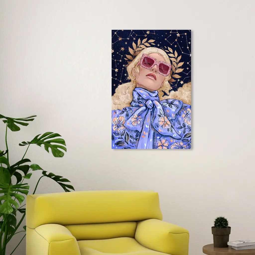Sepia tone close-up photograph of model wearing round sunglasses. Printed onto smooth plexiglass this vibrant artwork has a sleek, glossy finish and is part of our curated collaboration with Cobra Art.