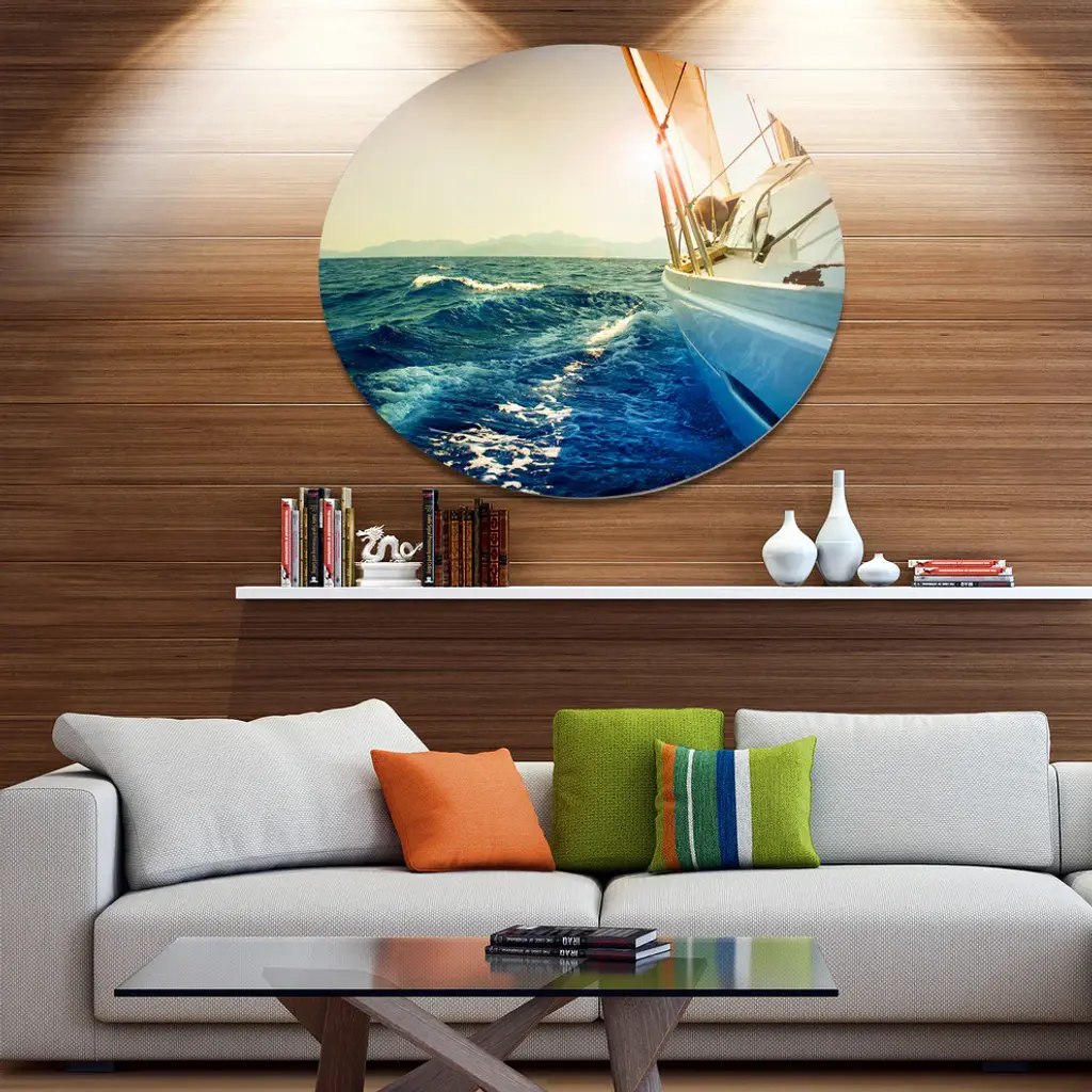 Bring Contemporary Abstraction to your home with this large Circle Metal wall art. This Sepia-toned Yacht Sailing in Sea Metal Artwork makes it the focal point of any room or office. - White Gloss Coating ensures colors are extra vibrant with light reflection.- Aluminum grade Sheet Metal with 1 inch mounting frame on the back giving the illusion that the artwork is floating on the wall..- Mounting Brackets are included along with instructions.- High Quality Digital images are created directly into a glossy aluminum panel producing a stunning and captivating print into the glossy finish of the metal.- Water, Fire and Scratch resistant HD Aluminum panels.- Looks better than any photo paper and guaranteed to last at least 20 years- Easy to clean with a microfiber cloth. Colors are far superior to regular Canvas Art. - Easy to Hang