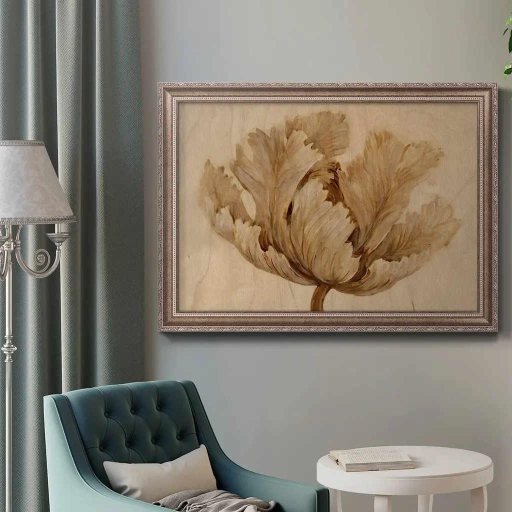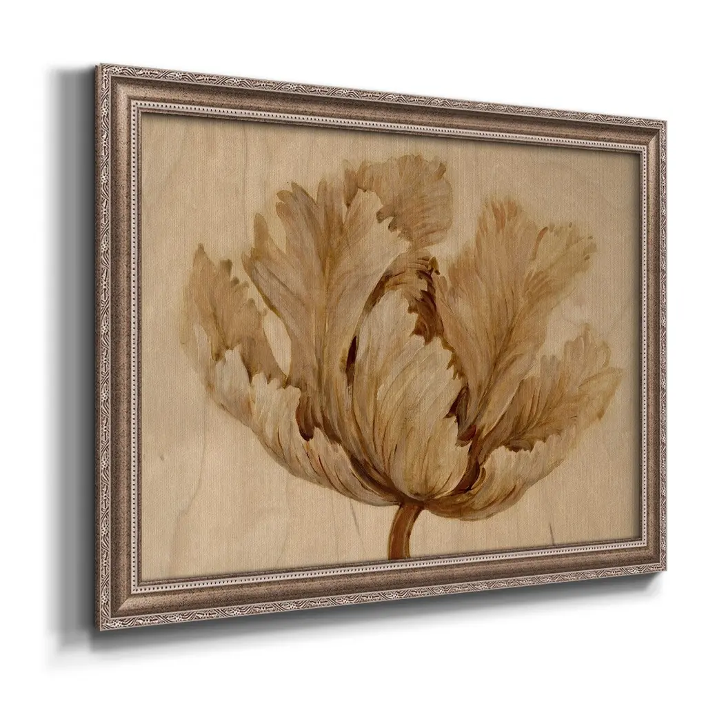 Sepia Tulip on Birch I Premium Framed Canvas- Ready to Hang A Premium Framed Canvas created to last. Framed in distressed wood and available in an array of sizes and colors Featuring a beveled a solid wood stretcher bar, each piece comes ready to hand 3 SIZES AVAILABLE 16''X20'' - Overall Size 18'X27'' - Overall Size 24''x36'' - Overall Size Each piece is made to order. Each piece comes with hanging hardware. Made in the USA Ready to Hang Giclee Paper Print Acrylic Glass Beveled Matt Board