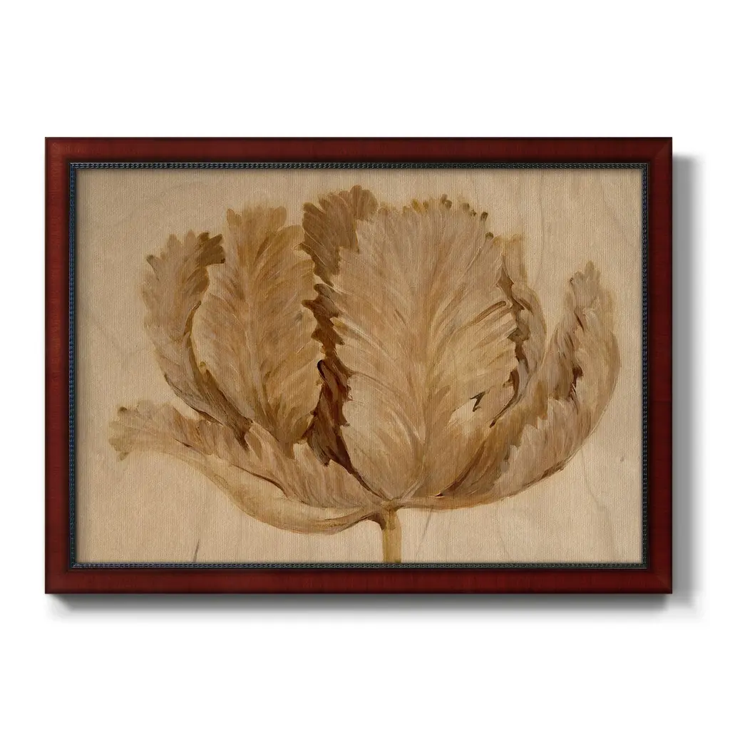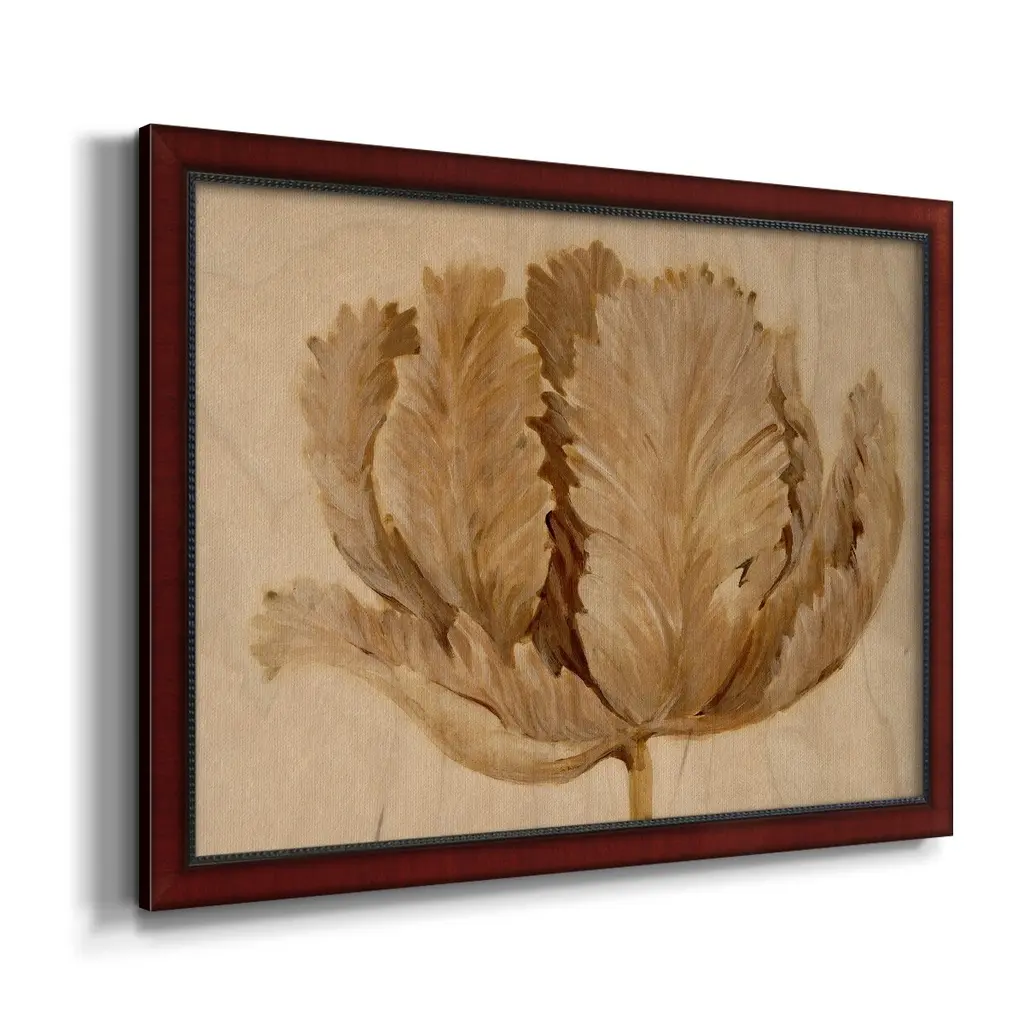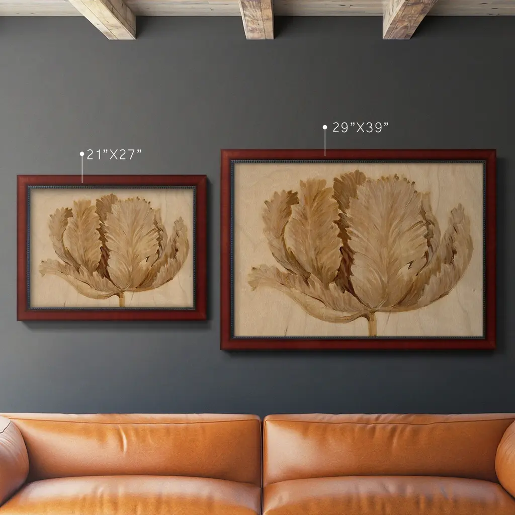 Sepia Tulip on Birch II Premium Framed Canvas- Ready to Hang A Premium Framed Canvas created to last. Framed in distressed wood and available in an array of sizes and colors Featuring a beveled a solid wood stretcher bar, each piece comes ready to hand 3 SIZES AVAILABLE 16''X20'' - Overall Size 18'X27'' - Overall Size 24''x36'' - Overall Size Each piece is made to order. Each piece comes with hanging hardware. Made in the USA Ready to Hang Giclee Paper Print Acrylic Glass Beveled Matt Board