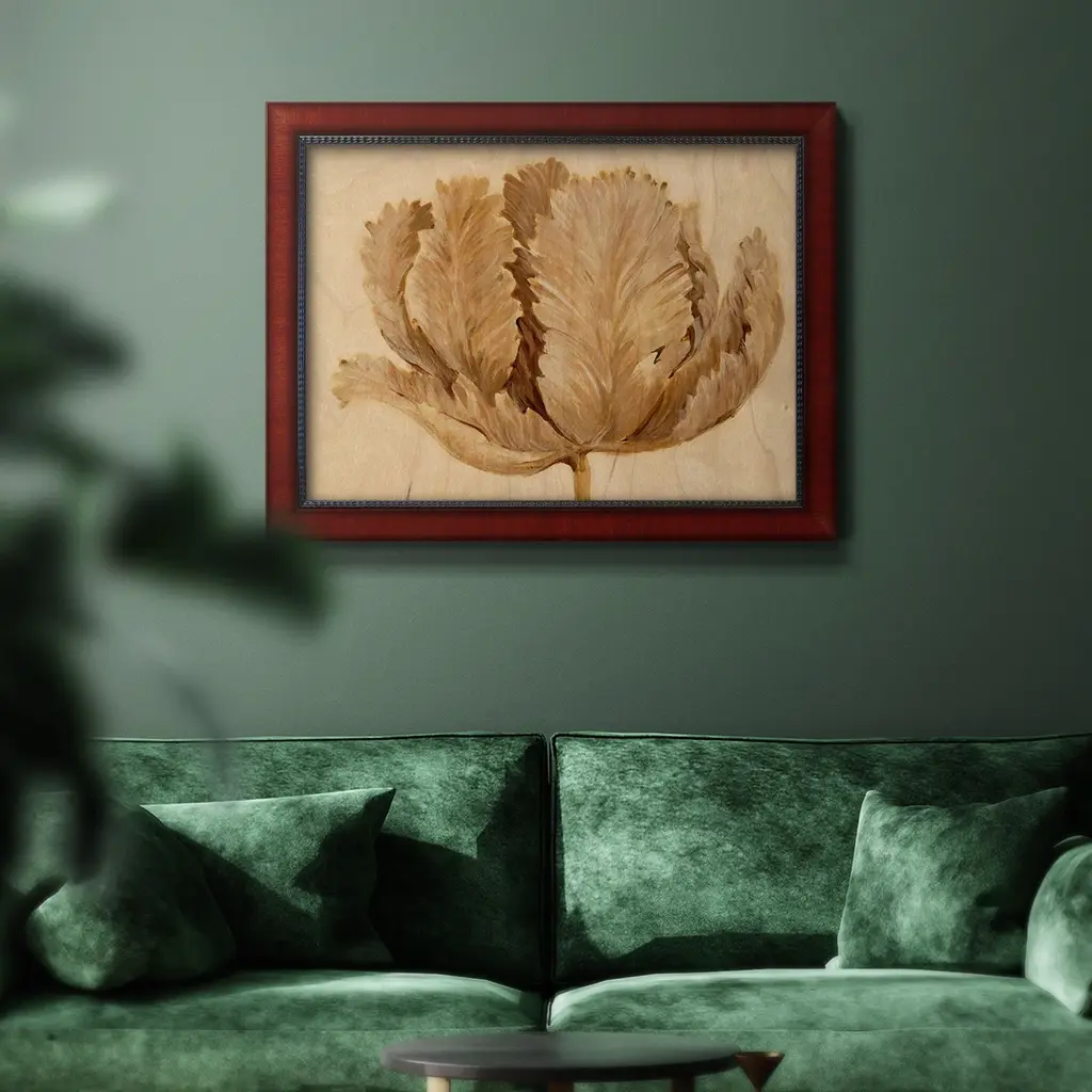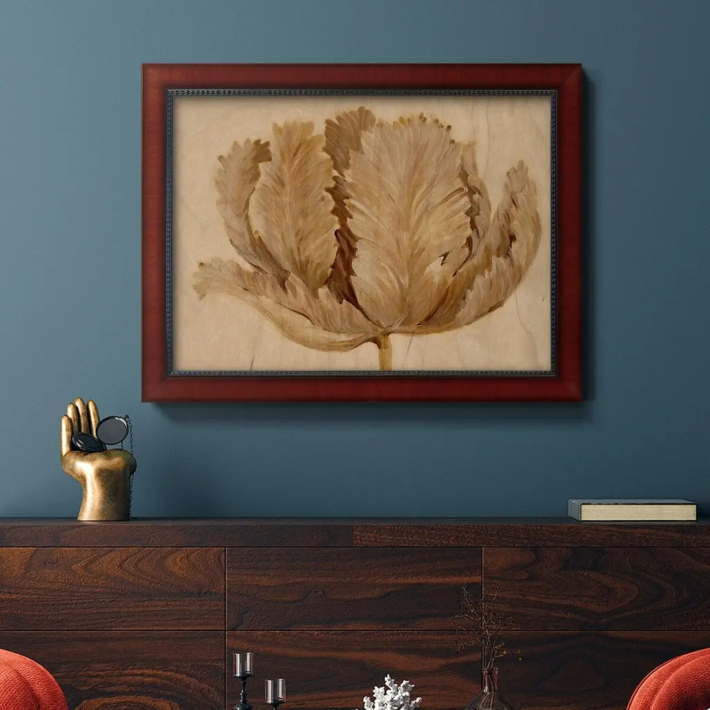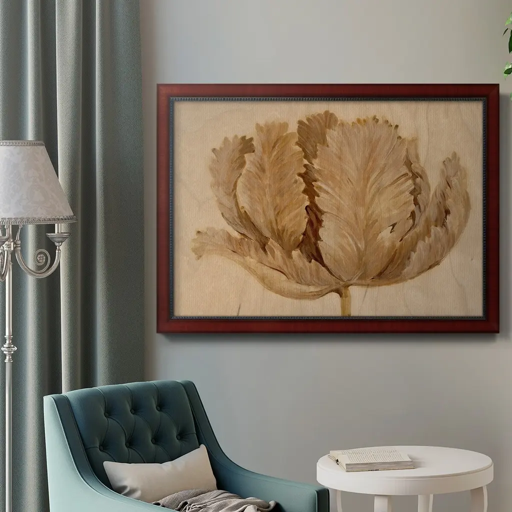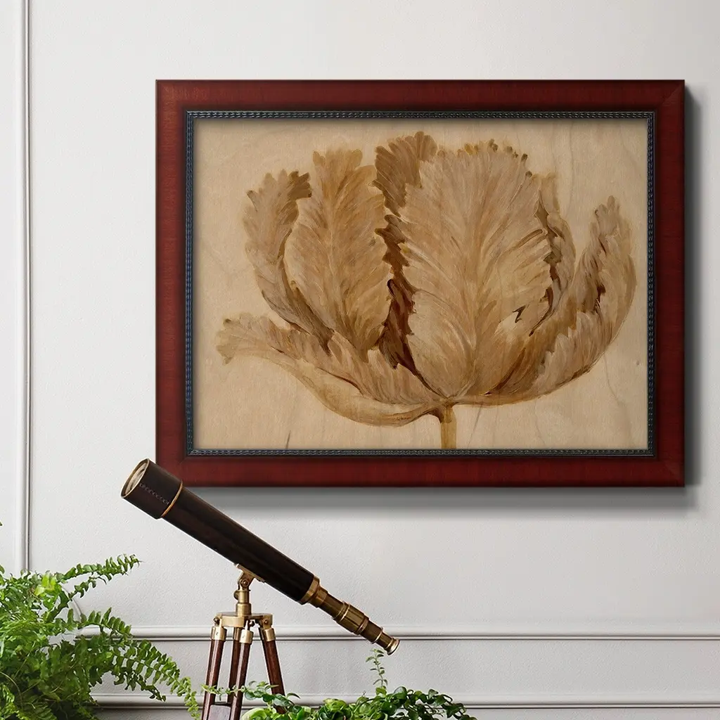Sepia Tulip on Birch II Premium Framed Canvas- Ready to Hang A Premium Framed Canvas created to last. Framed in distressed wood and available in an array of sizes and colors Featuring a beveled a solid wood stretcher bar, each piece comes ready to hand 3 SIZES AVAILABLE 16''X20'' - Overall Size 18'X27'' - Overall Size 24''x36'' - Overall Size Each piece is made to order. Each piece comes with hanging hardware. Made in the USA Ready to Hang Giclee Paper Print Acrylic Glass Beveled Matt Board