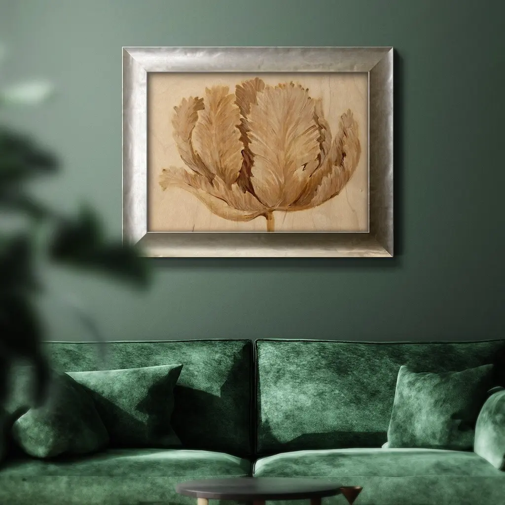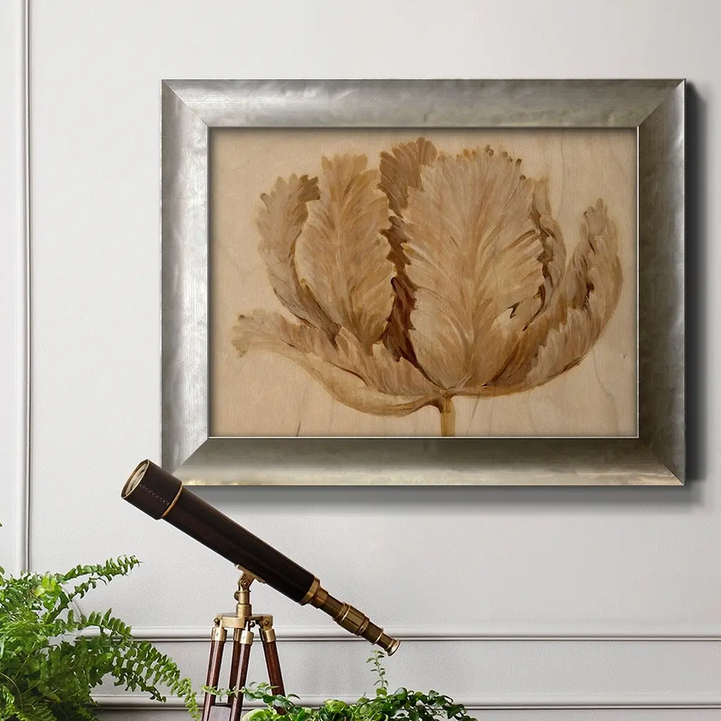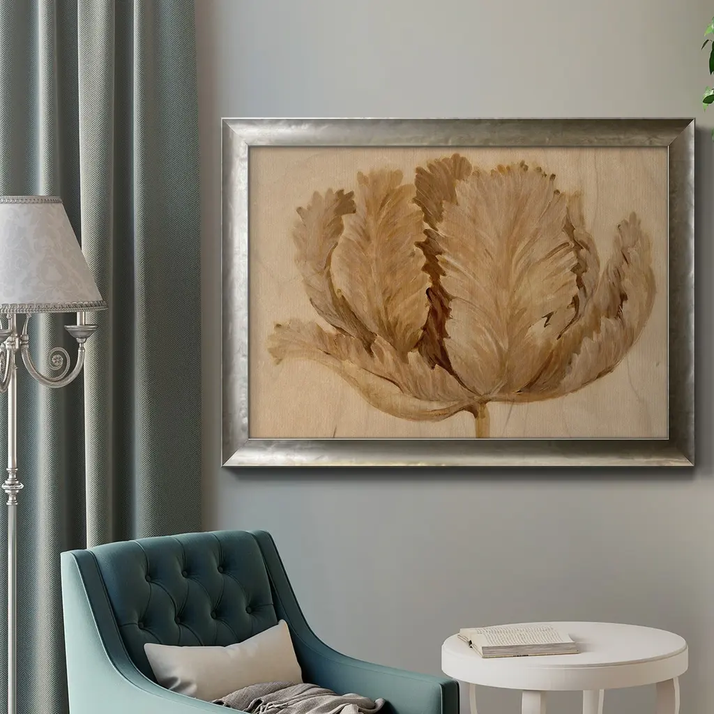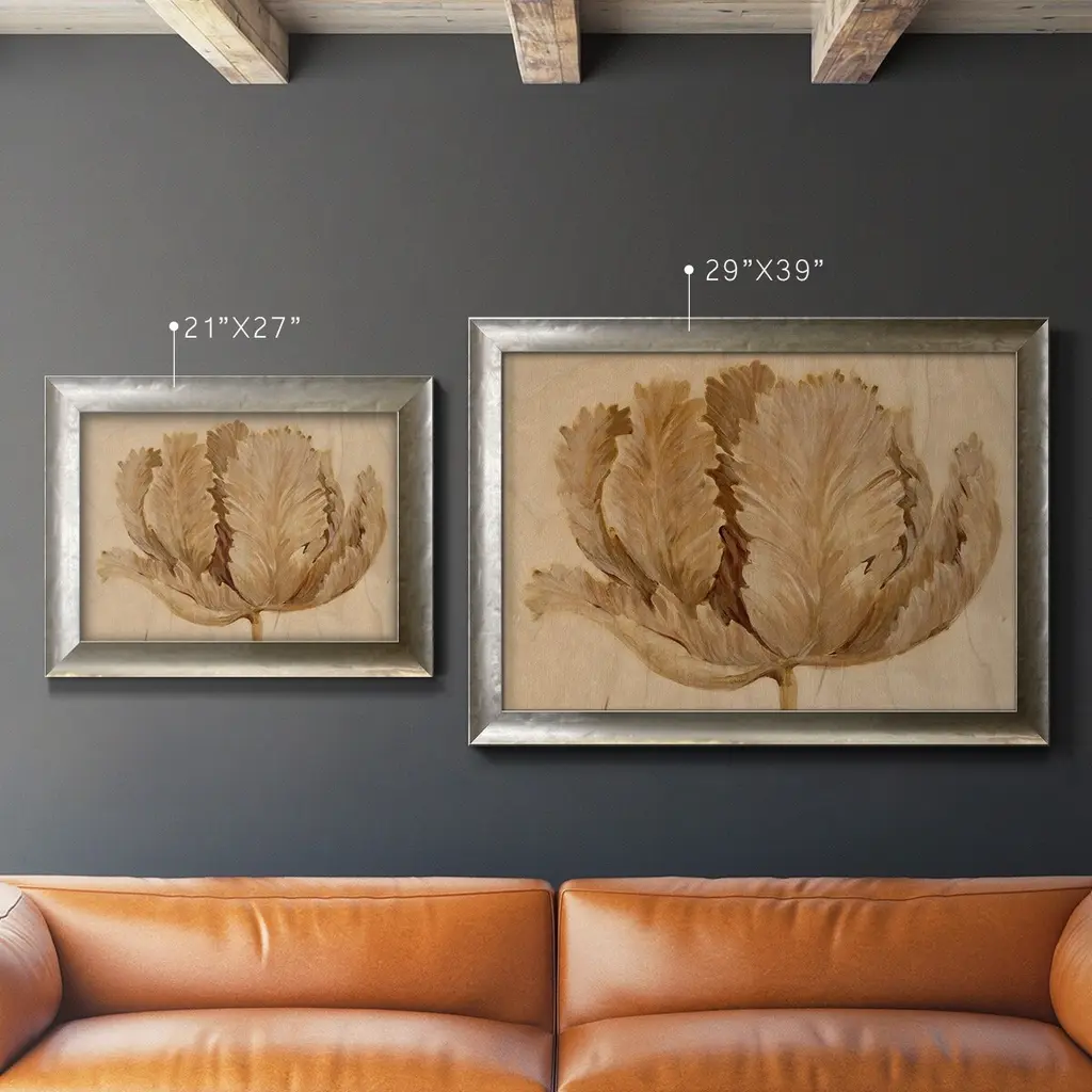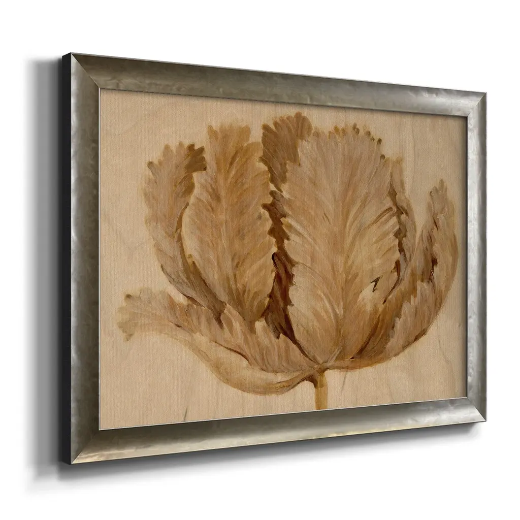 Sepia Tulip on Birch II Premium Framed Canvas- Ready to Hang A Premium Framed Canvas created to last. Framed in distressed wood and available in an array of sizes and colors Featuring a beveled a solid wood stretcher bar, each piece comes ready to hand 3 SIZES AVAILABLE 16''X20'' - Overall Size 18'X27'' - Overall Size 24''x36'' - Overall Size Each piece is made to order. Each piece comes with hanging hardware. Made in the USA Ready to Hang Giclee Paper Print Acrylic Glass Beveled Matt Board
