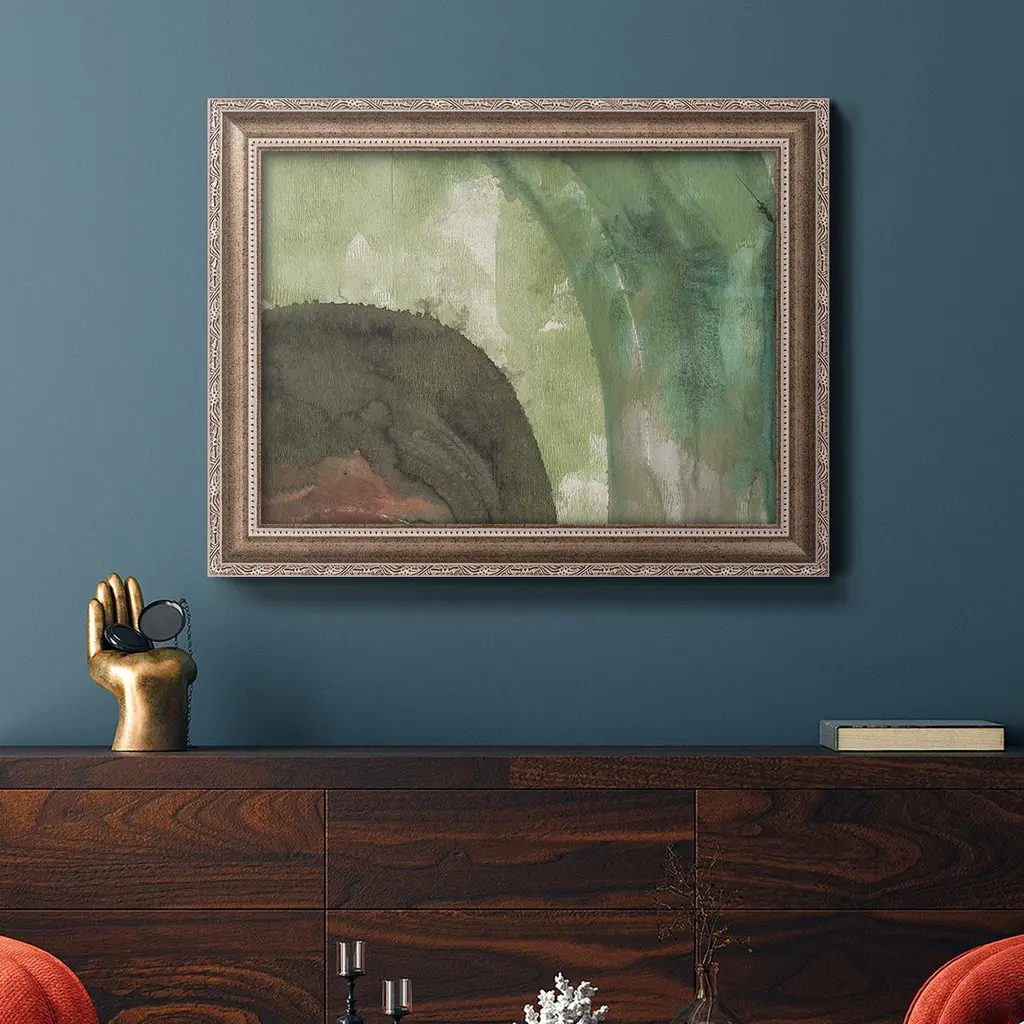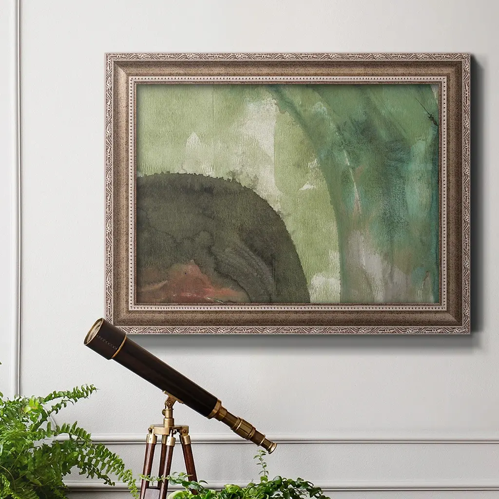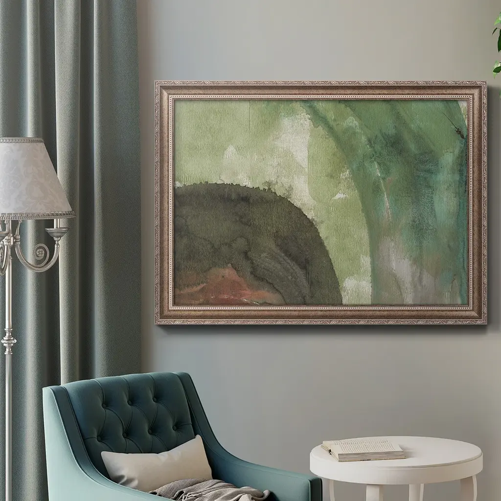 Serene Green I Premium Framed Canvas- Ready to Hang A Premium Framed Canvas created to last. Framed in distressed wood and available in an array of sizes and colors Featuring a beveled a solid wood stretcher bar, each piece comes ready to hand 3 SIZES AVAILABLE 16''X20'' - Overall Size 18'X27'' - Overall Size 24''x36'' - Overall Size Each piece is made to order. Each piece comes with hanging hardware. Made in the USA Ready to Hang Giclee Paper Print Acrylic Glass Beveled Matt Board
