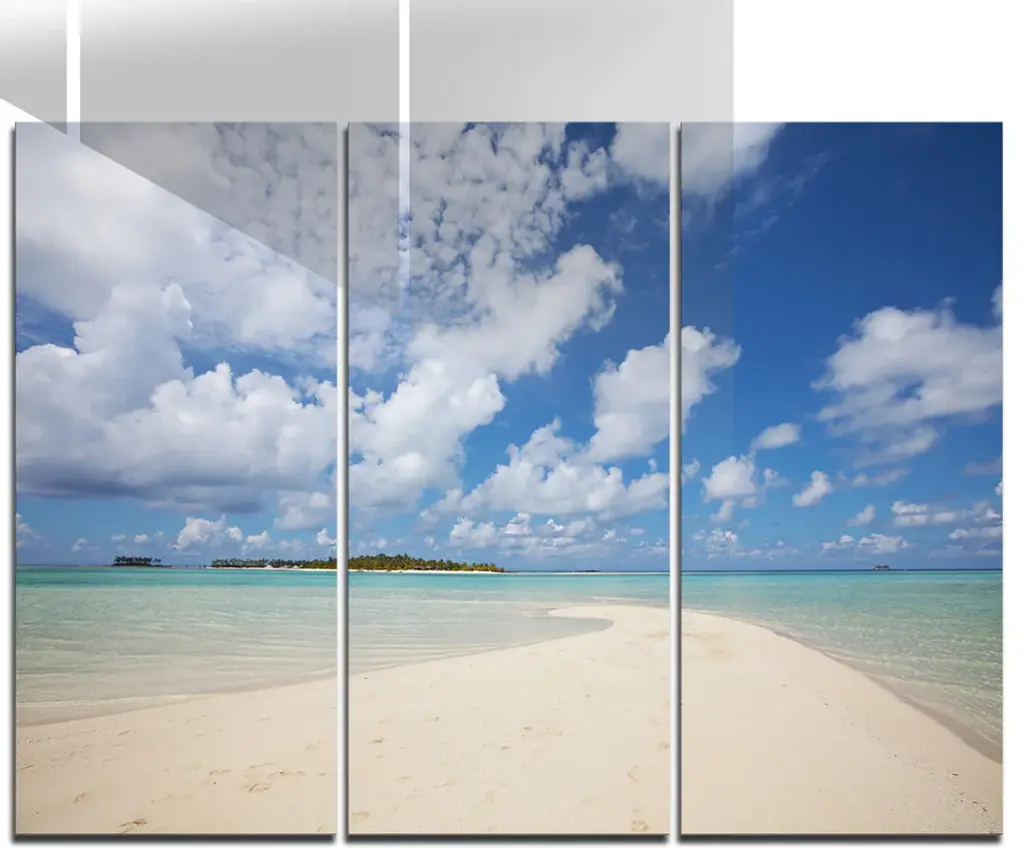 Bring Contemporary Abstraction to your home with this large 36W x 28H Metal Wall Art. This Serene Maldives Beach under Clouds Metal Artwork makes it the focal point of any room or office. - White Gloss Coating ensures colors are extra vibrant with light reflection.- Aluminum grade Sheet Metal with 1 inch mounting frame on the back giving the illusion that the artwork is floating on the wall..- Mounting Brackets are included along with instructions.- High Quality Digital images are created directly into a glossy aluminum panel producing a stunning and captivating print into the glossy finish of the metal.- Water, Fire and Scratch resistant HD Aluminum panels.- Looks better than any photo paper and guaranteed to last at least 20 years- Easy to clean with a microfiber cloth. Colors are far superior to regular Canvas Art. - Easy to Hang