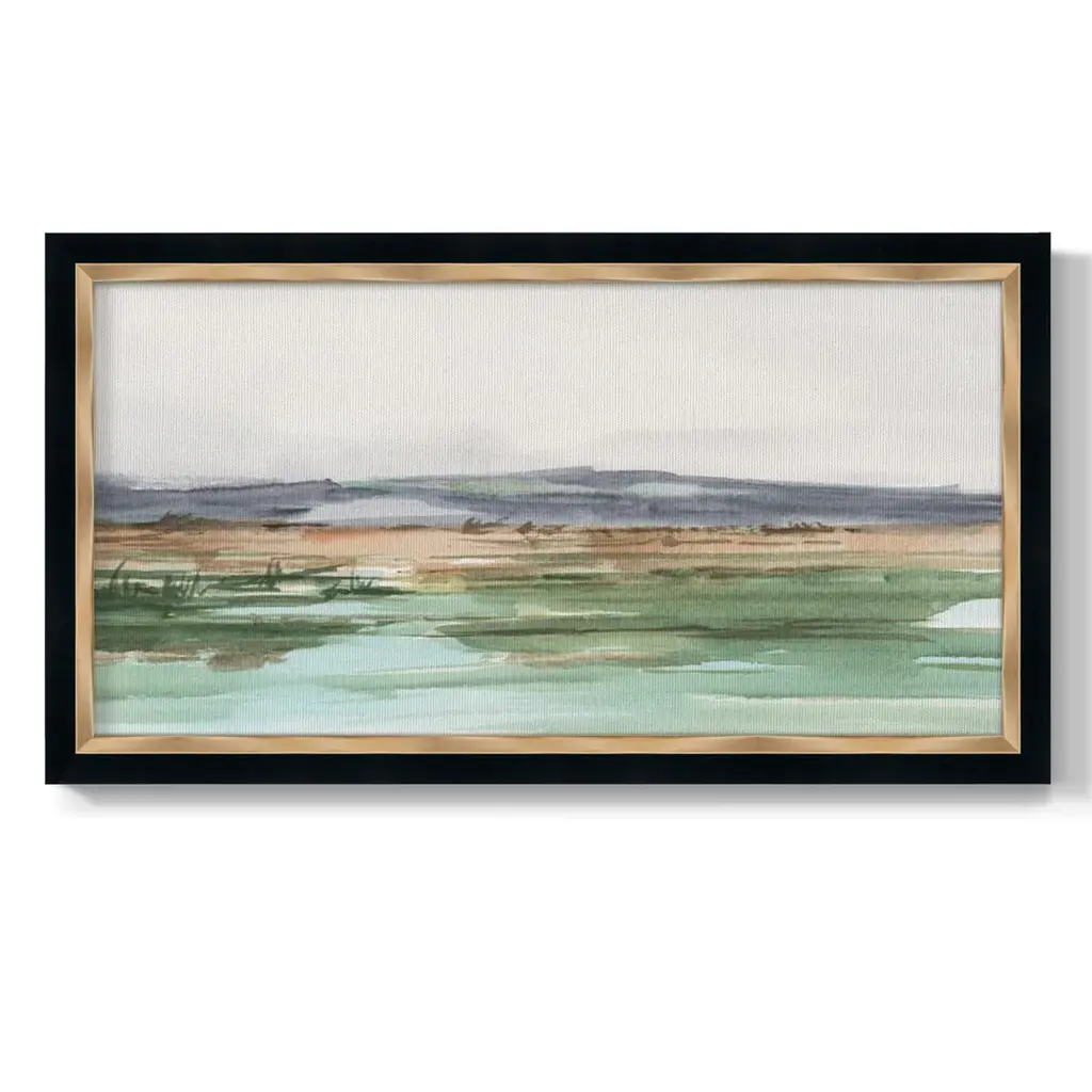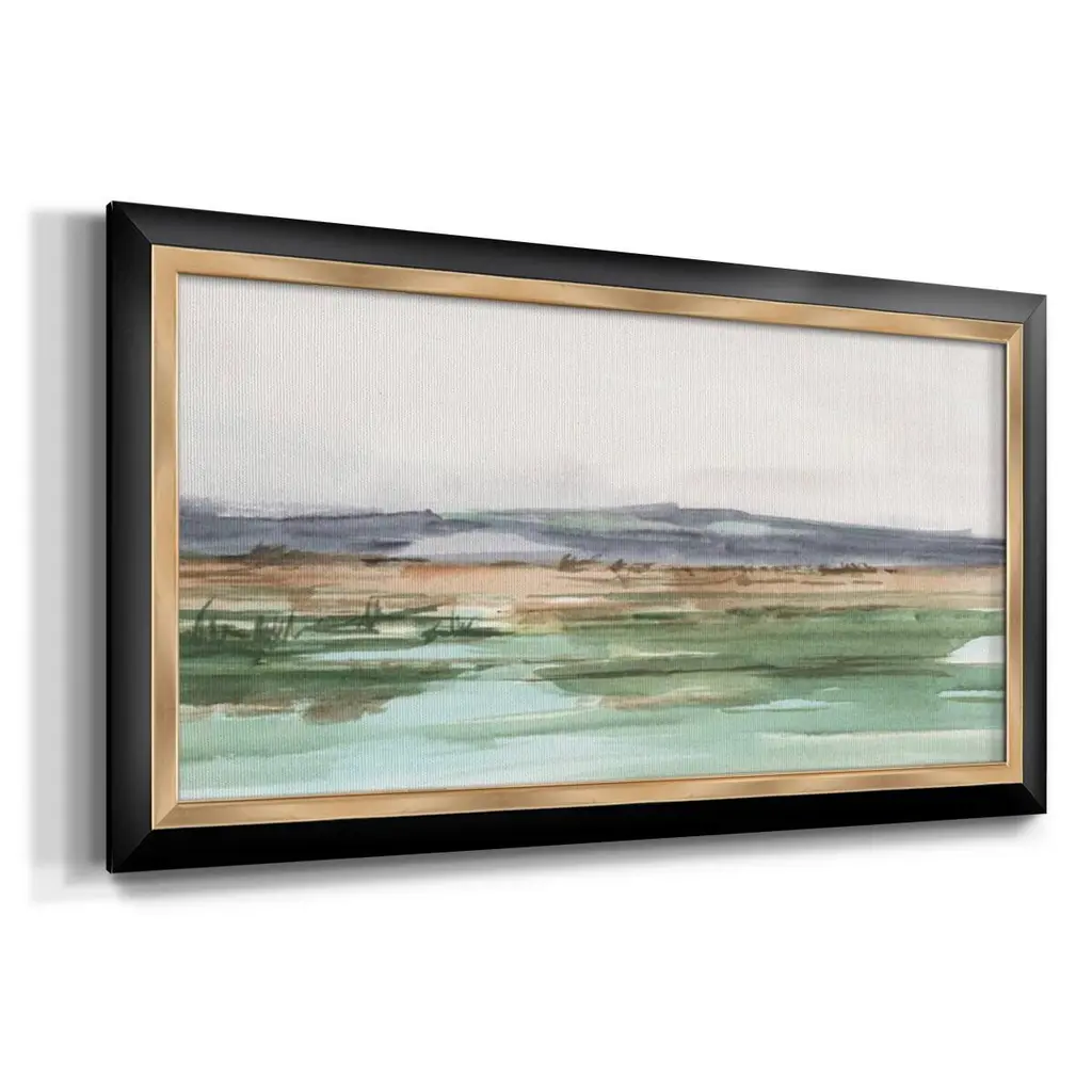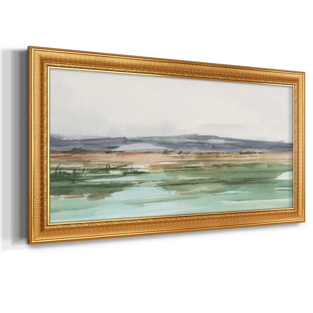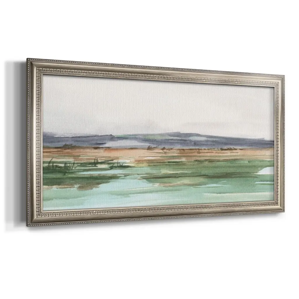 Serene Mountain View I Premium Framed Canvas- Ready to Hang A Premium Framed Canvas created to last. Framed in distressed wood and available in an array of sizes and colors Featuring a beveled a solid wood stretcher bar, each piece comes ready to hand 3 SIZES AVAILABLE 21''X37'' - Overall Size 25''X45'' - Overall Size 29''x53'' - Overall Size Each piece is made to order. Each piece comes with hanging hardware. Made in the USA Ready to Hang Giclee Paper Print Acrylic Glass Beveled Matt Board
