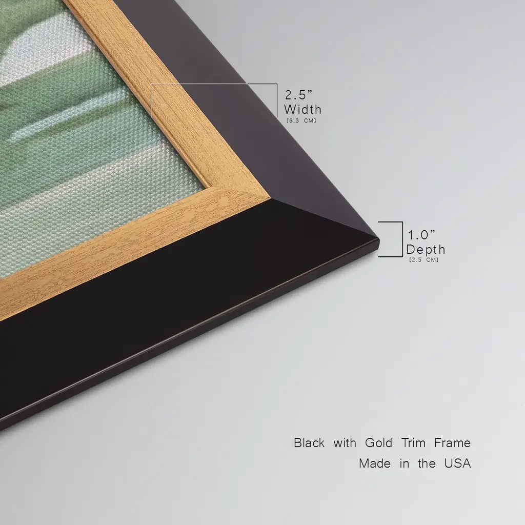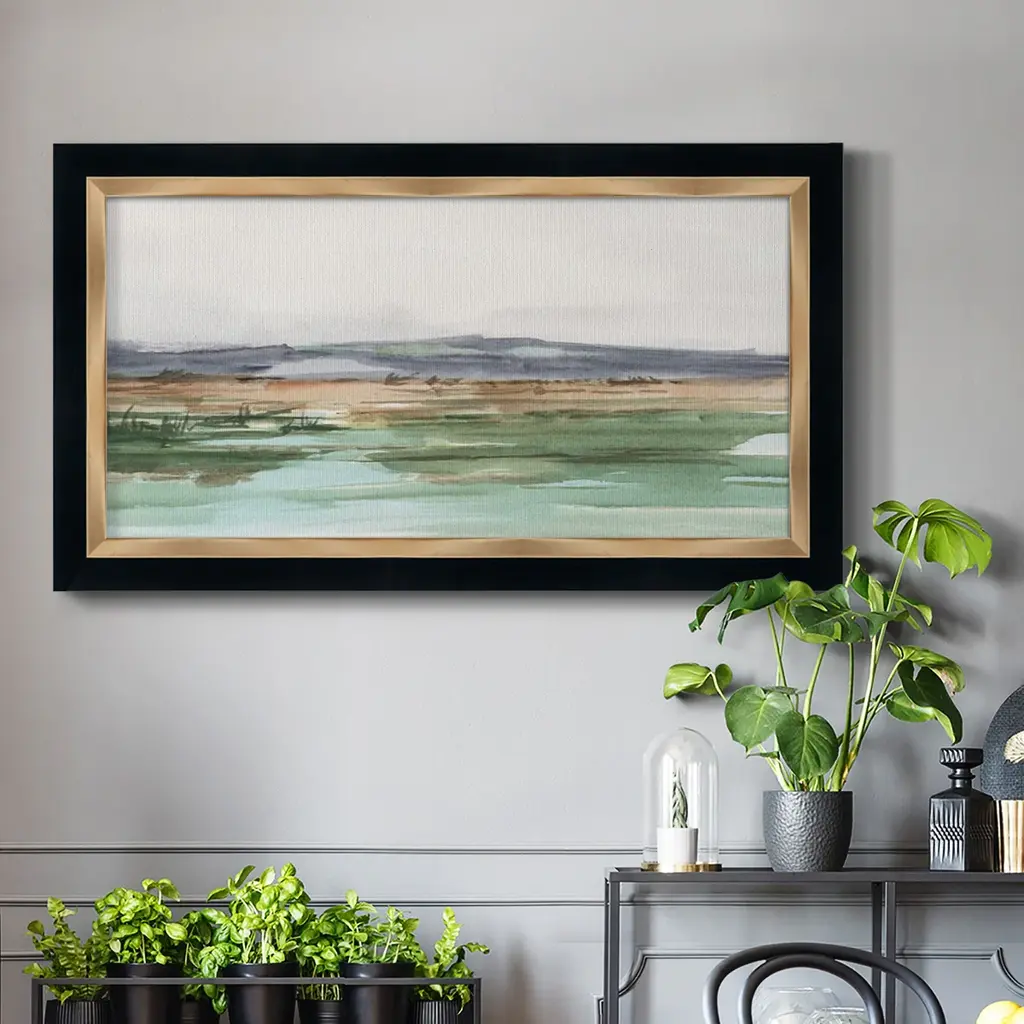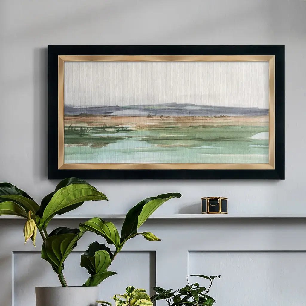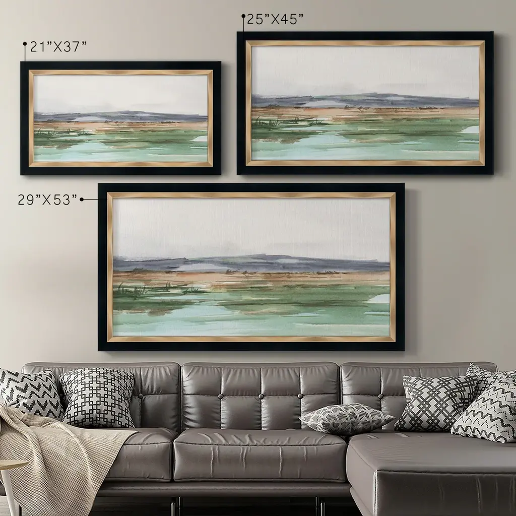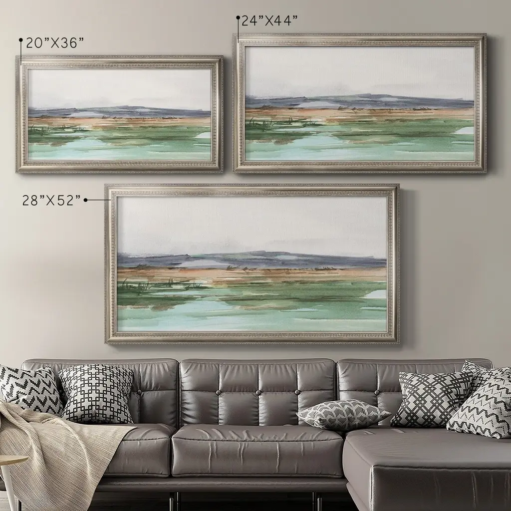 Serene Mountain View I Premium Framed Canvas- Ready to Hang A Premium Framed Canvas created to last. Framed in distressed wood and available in an array of sizes and colors Featuring a beveled a solid wood stretcher bar, each piece comes ready to hand 3 SIZES AVAILABLE 21''X37'' - Overall Size 25''X45'' - Overall Size 29''x53'' - Overall Size Each piece is made to order. Each piece comes with hanging hardware. Made in the USA Ready to Hang Giclee Paper Print Acrylic Glass Beveled Matt Board