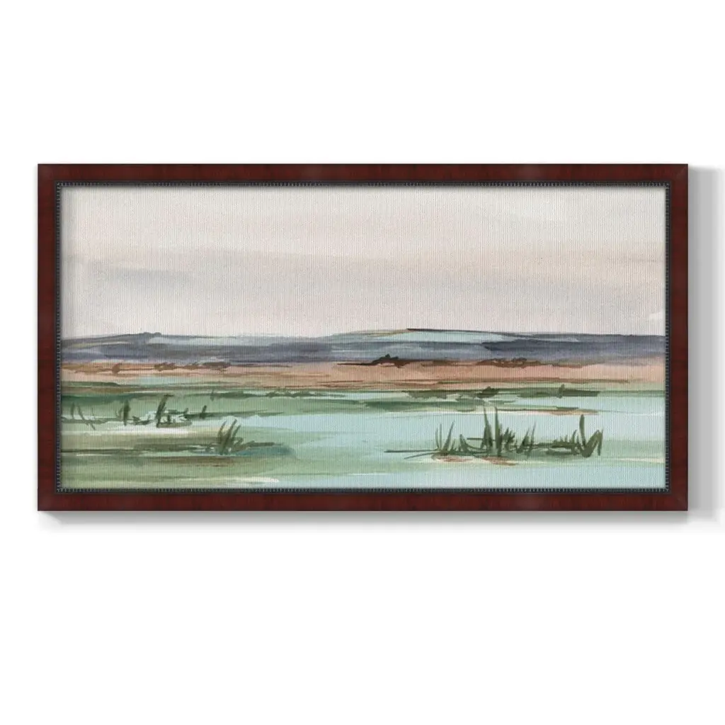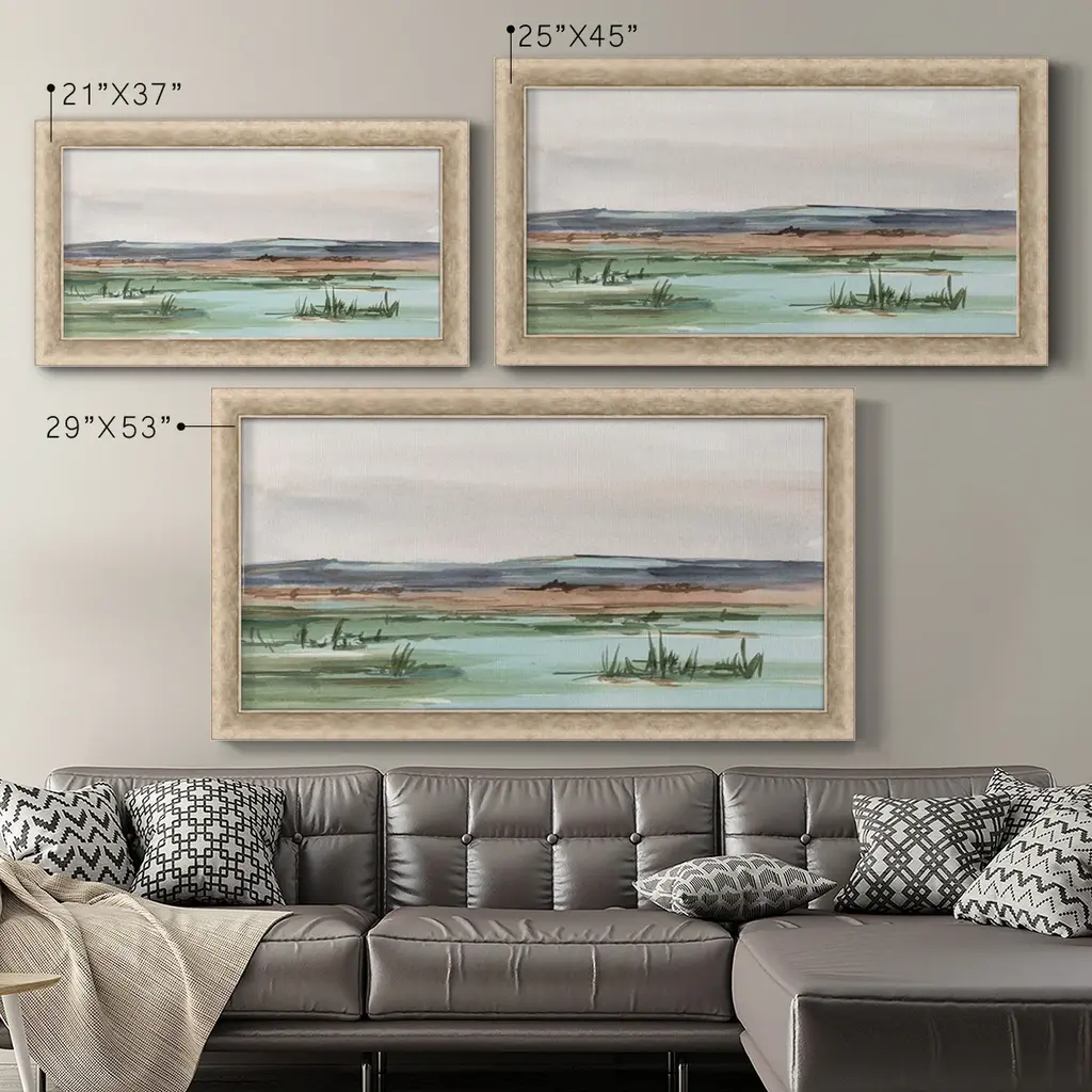 Serene Mountain View II Premium Framed Canvas- Ready to Hang A Premium Framed Canvas created to last. Framed in distressed wood and available in an array of sizes and colors Featuring a beveled a solid wood stretcher bar, each piece comes ready to hand 3 SIZES AVAILABLE 21''X37'' - Overall Size 25''X45'' - Overall Size 29''x53'' - Overall Size Each piece is made to order. Each piece comes with hanging hardware. Made in the USA Ready to Hang Giclee Paper Print Acrylic Glass Beveled Matt Board