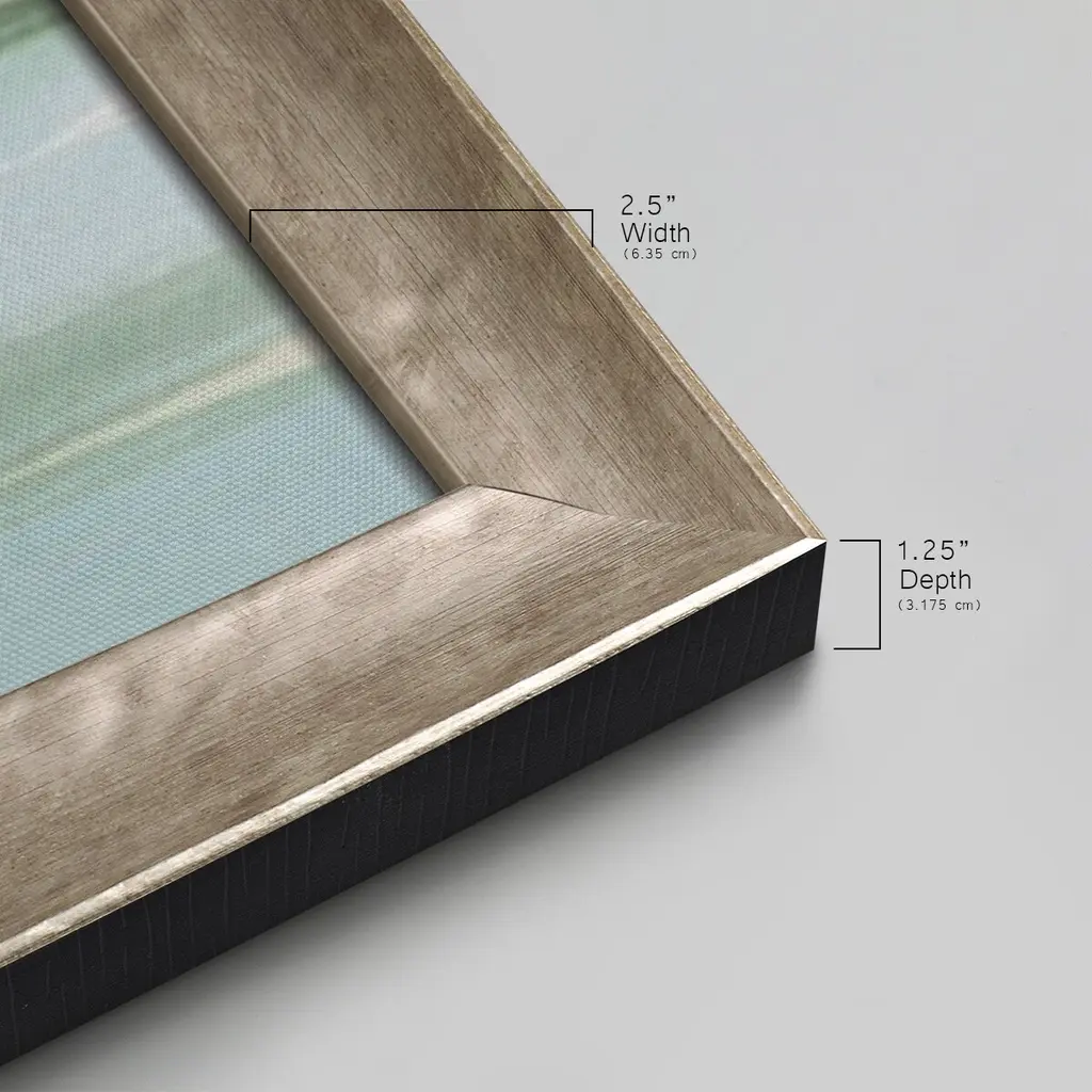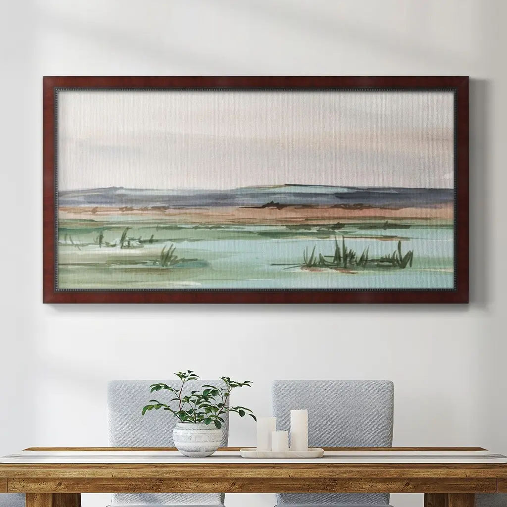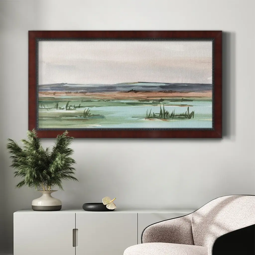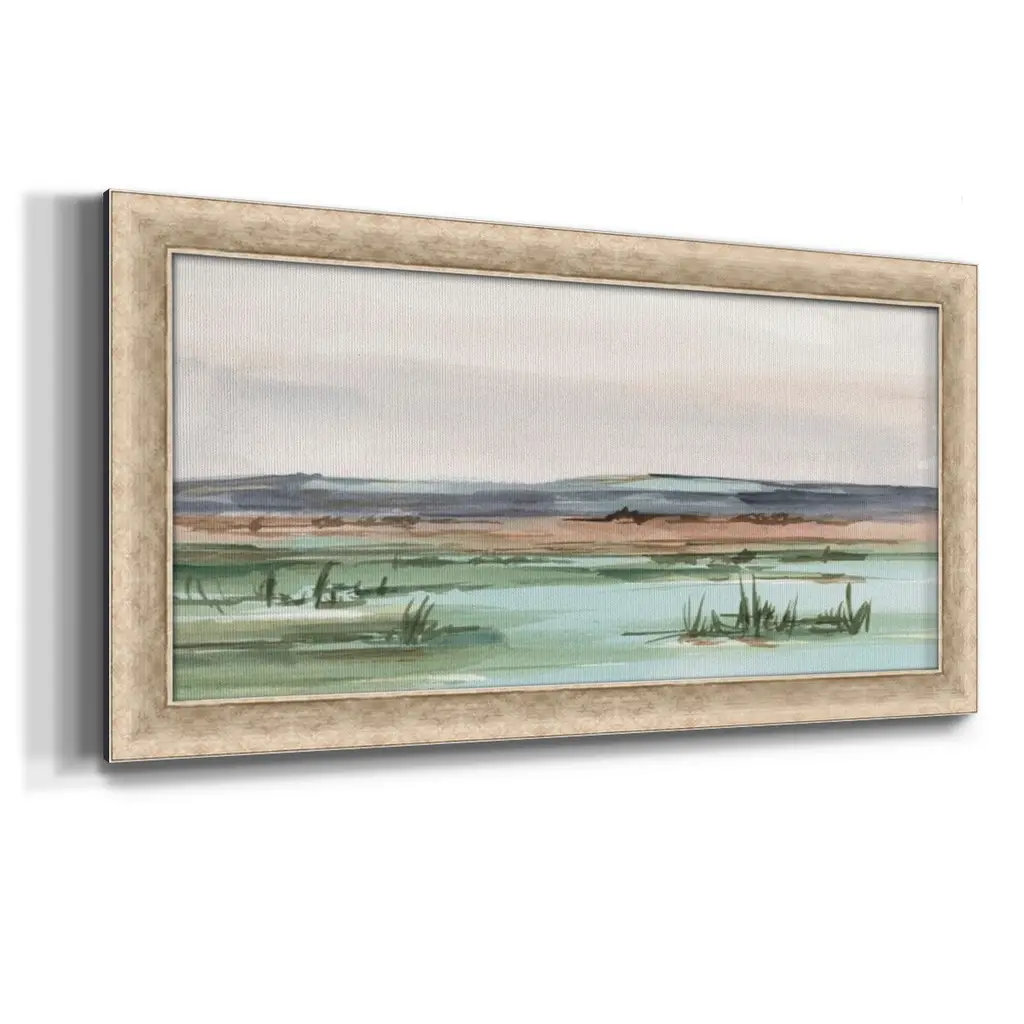 Serene Mountain View II Premium Framed Canvas- Ready to Hang A Premium Framed Canvas created to last. Framed in distressed wood and available in an array of sizes and colors Featuring a beveled a solid wood stretcher bar, each piece comes ready to hand 3 SIZES AVAILABLE 21''X37'' - Overall Size 25''X45'' - Overall Size 29''x53'' - Overall Size Each piece is made to order. Each piece comes with hanging hardware. Made in the USA Ready to Hang Giclee Paper Print Acrylic Glass Beveled Matt Board