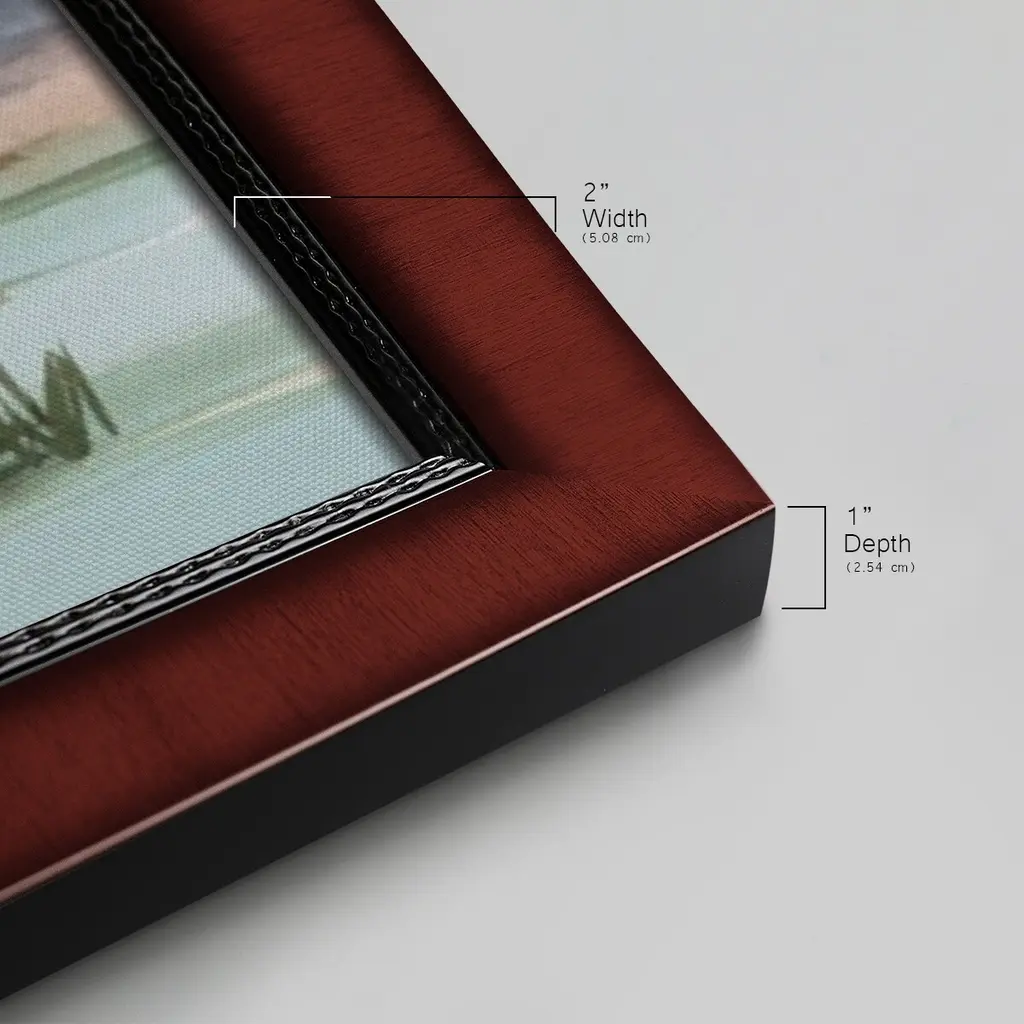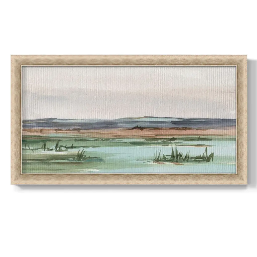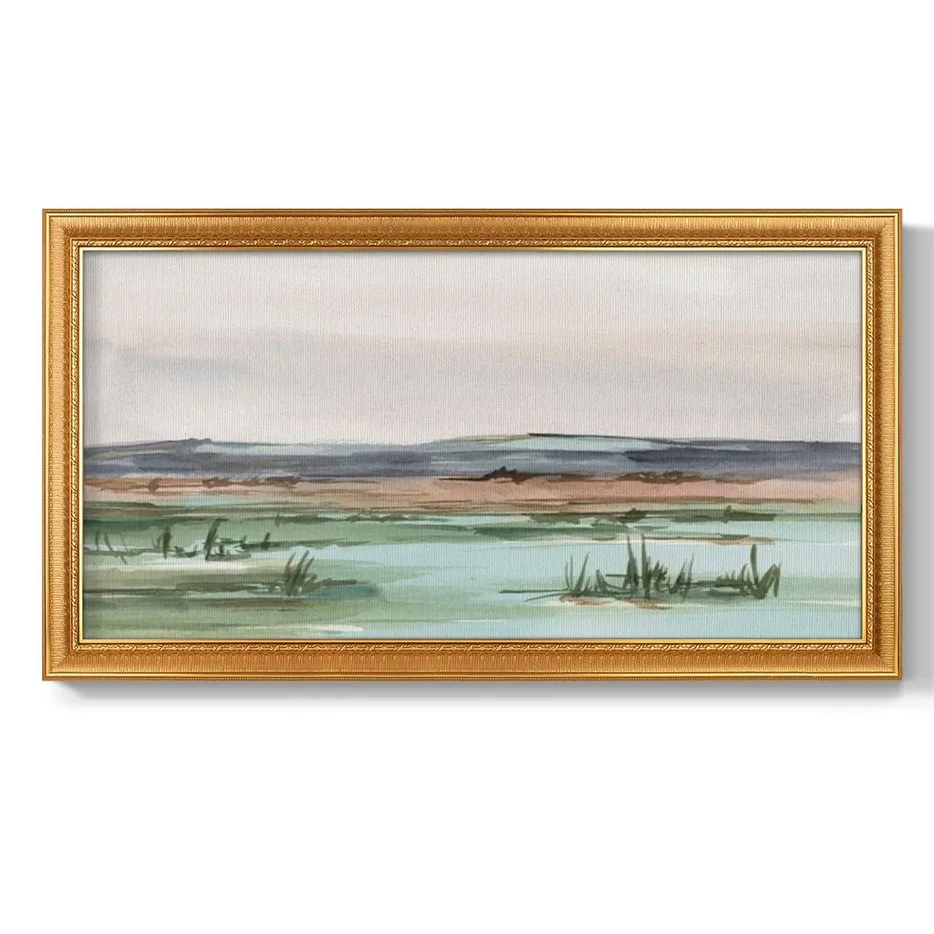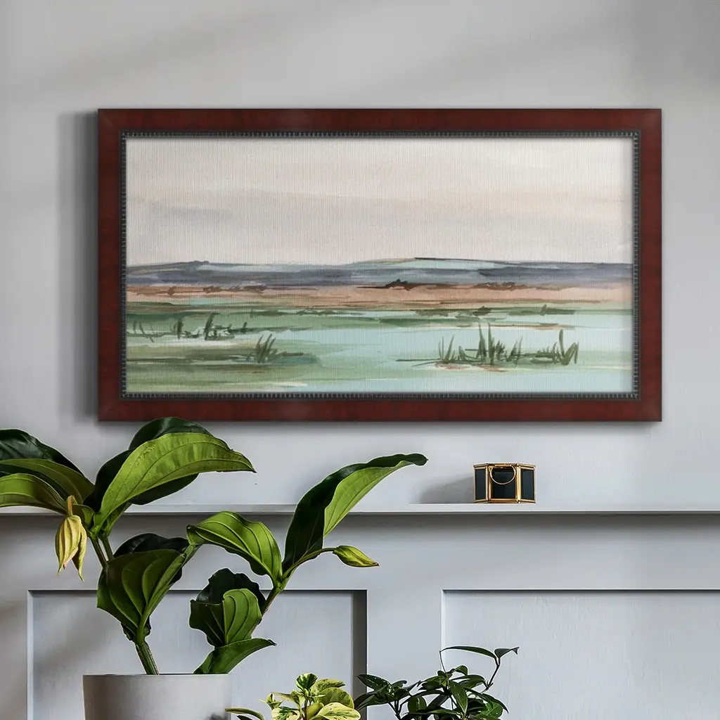 Serene Mountain View II Premium Framed Canvas- Ready to Hang A Premium Framed Canvas created to last. Framed in distressed wood and available in an array of sizes and colors Featuring a beveled a solid wood stretcher bar, each piece comes ready to hand 3 SIZES AVAILABLE 21''X37'' - Overall Size 25''X45'' - Overall Size 29''x53'' - Overall Size Each piece is made to order. Each piece comes with hanging hardware. Made in the USA Ready to Hang Giclee Paper Print Acrylic Glass Beveled Matt Board