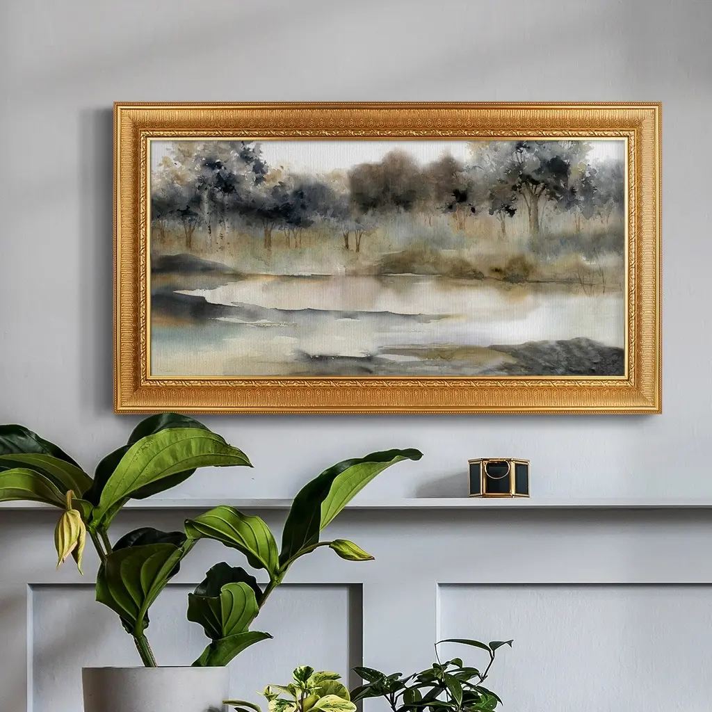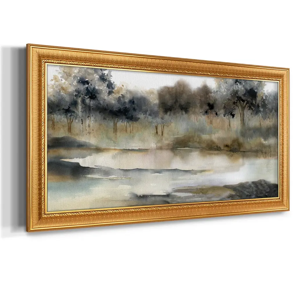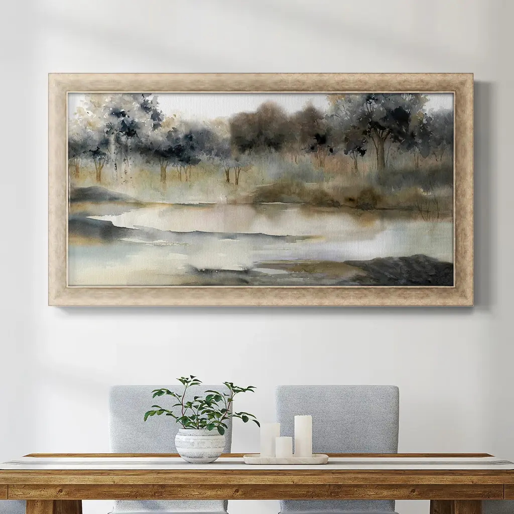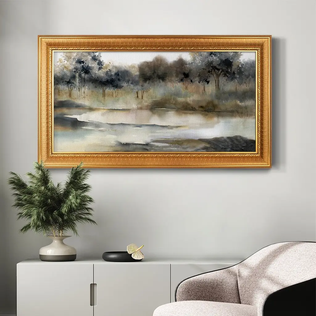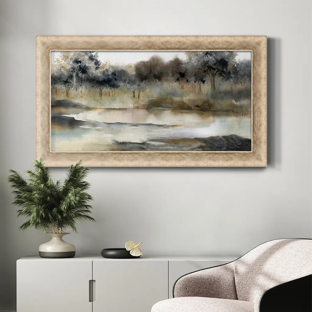 Serene River Premium Framed Canvas- Ready to Hang A Premium Framed Canvas created to last. Framed in distressed wood and available in an array of sizes and colors Featuring a beveled a solid wood stretcher bar, each piece comes ready to hand 3 SIZES AVAILABLE 21''X37'' - Overall Size 25''X45'' - Overall Size 29''x53'' - Overall Size Each piece is made to order. Each piece comes with hanging hardware. Made in the USA Ready to Hang Giclee Paper Print Acrylic Glass Beveled Matt Board