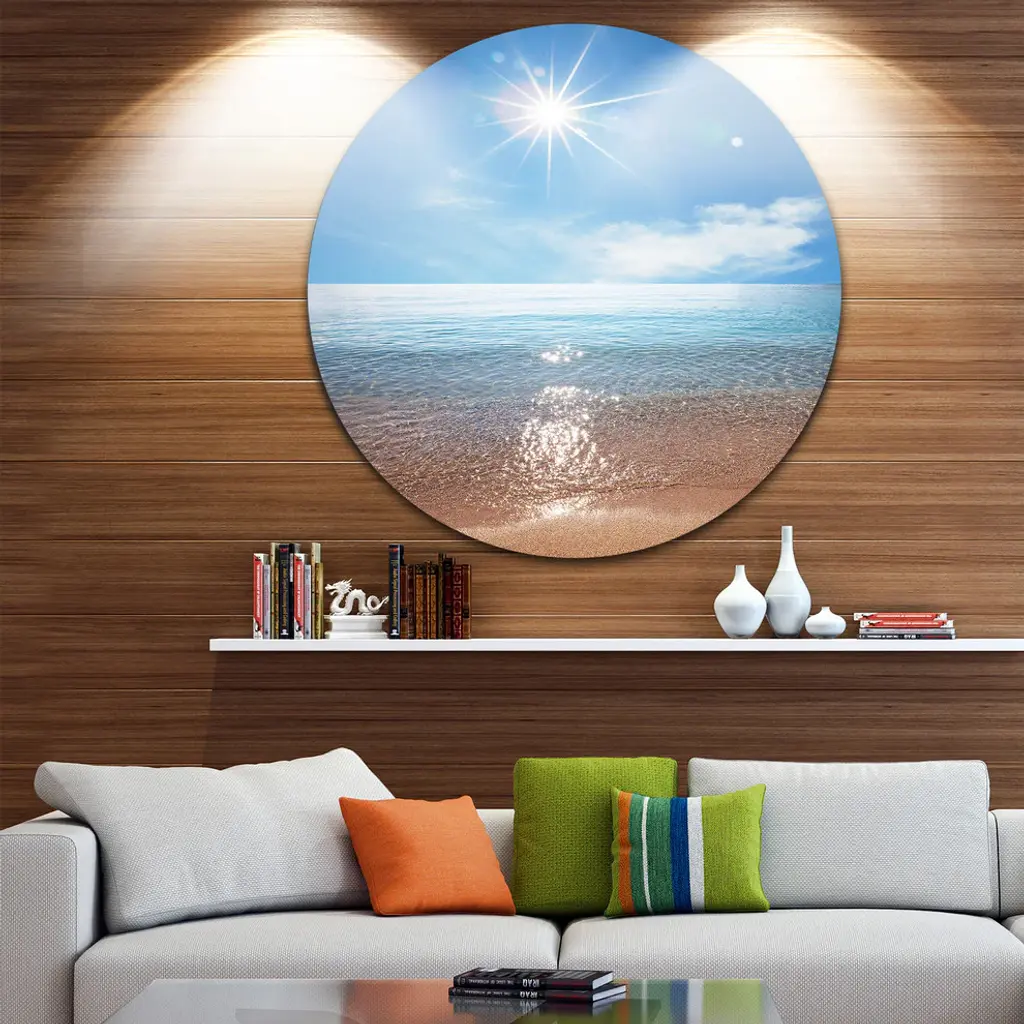 Serene Seascape With Bright Sun, Modern Beach Disc Metal Artwork, 11"