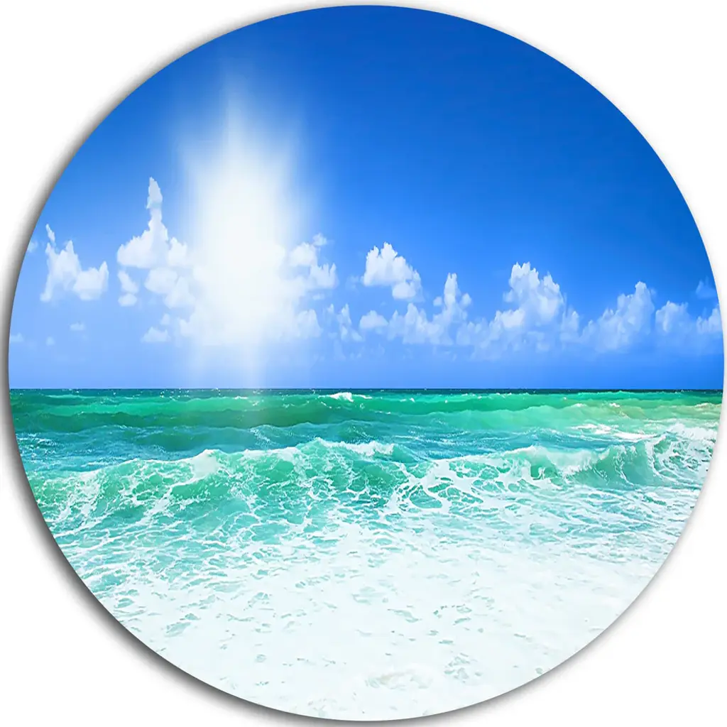Bring Contemporary Abstraction to your home with this large Circle Metal wall art. This Serene Seascape with Bright Sun Metal Artwork makes it the focal point of any room or office. - White Gloss Coating ensures colors are extra vibrant with light reflection.- Aluminum grade Sheet Metal with 1 inch mounting frame on the back giving the illusion that the artwork is floating on the wall..- Mounting Brackets are included along with instructions.- High Quality Digital images are created directly into a glossy aluminum panel producing a stunning and captivating print into the glossy finish of the metal.- Water, Fire and Scratch resistant HD Aluminum panels.- Looks better than any photo paper and guaranteed to last at least 20 years- Easy to clean with a microfiber cloth. Colors are far superior to regular Canvas Art. - Easy to Hang