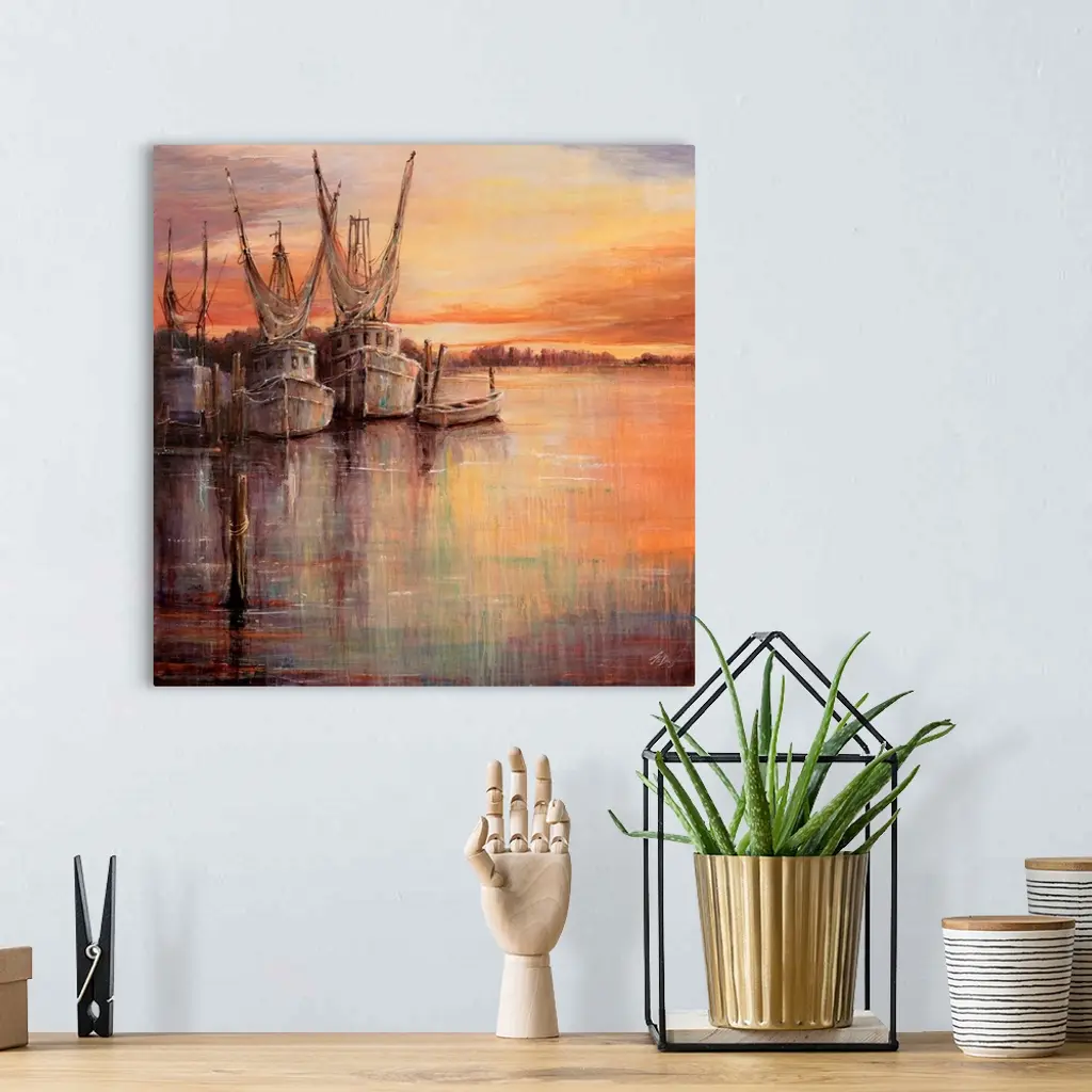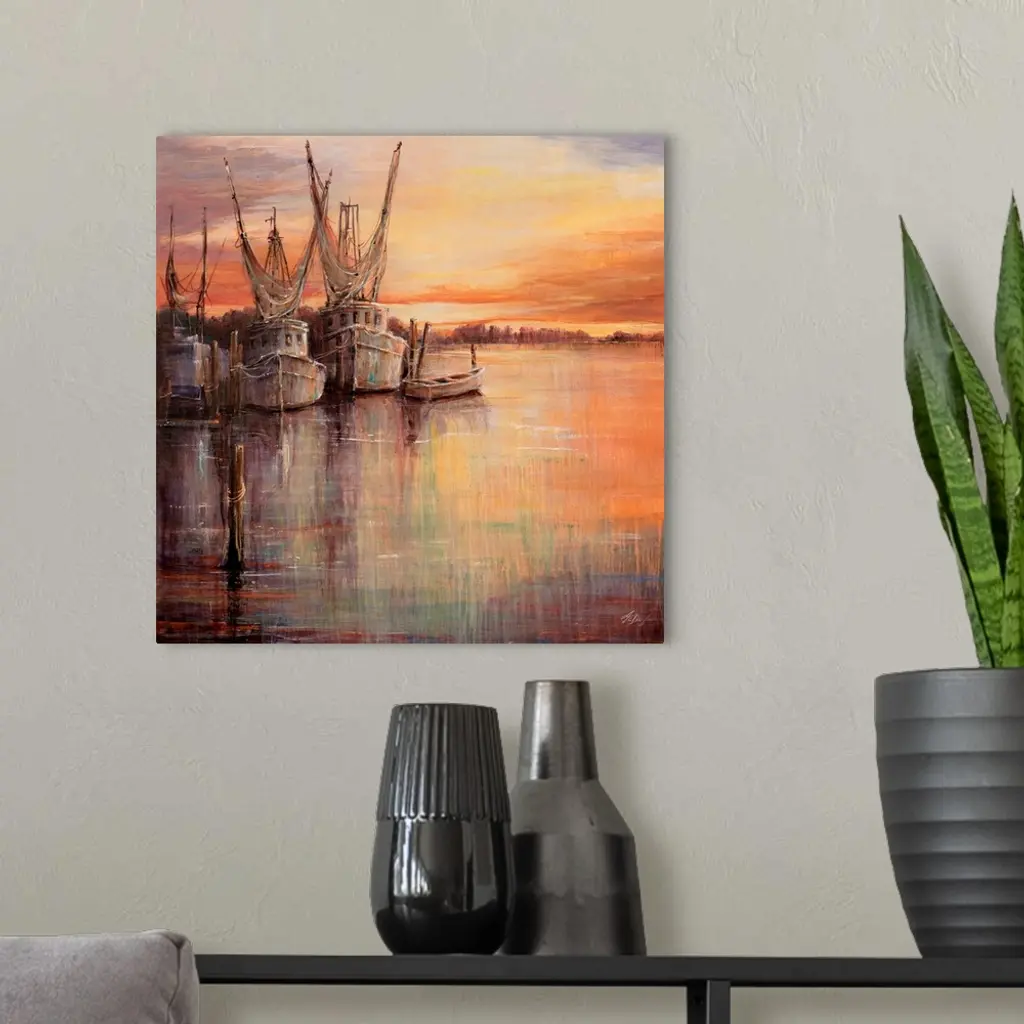 Painting of old sailboats docked at sunset under a colorful cloudy sky.