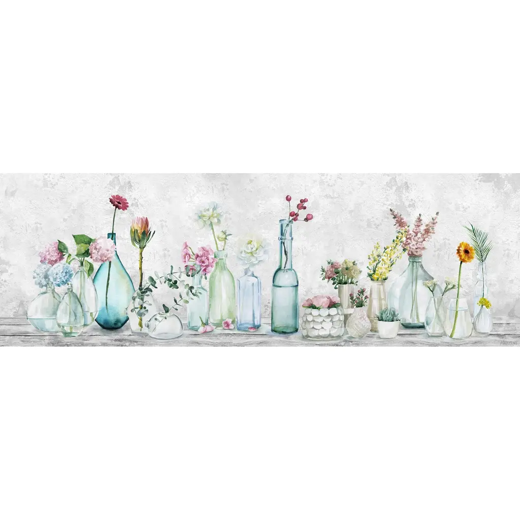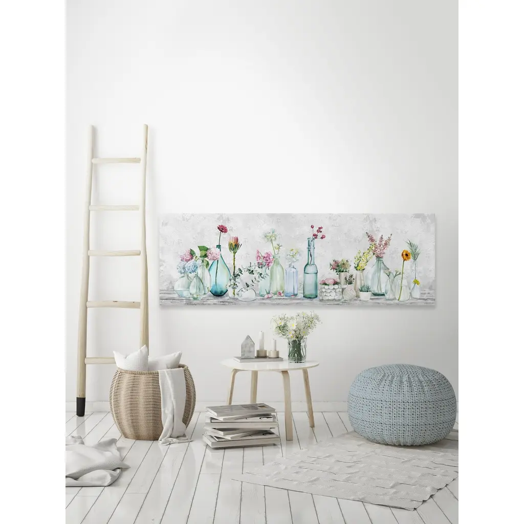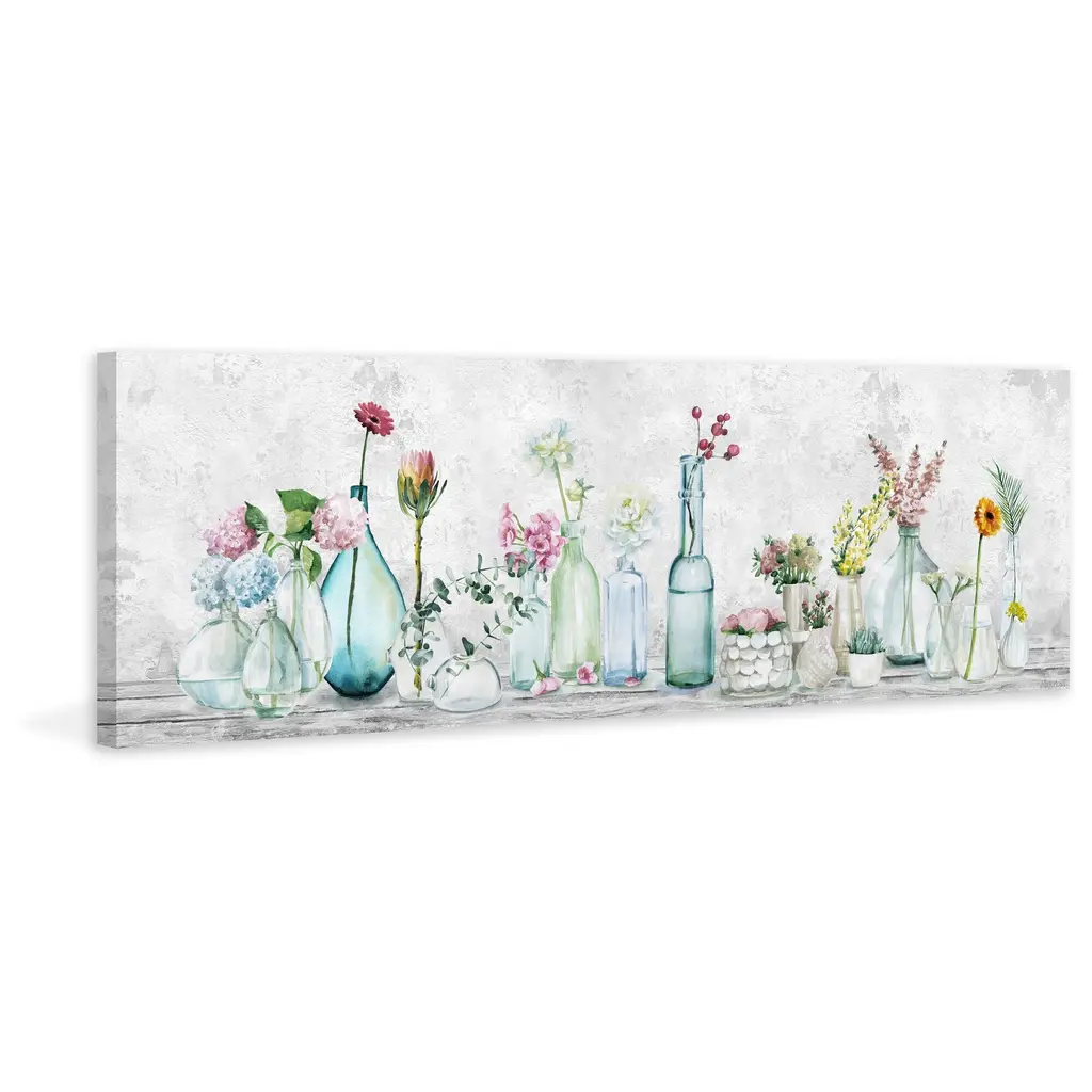 Bright, naturally beautiful flowers turn their faces to the viewer, planted in clear bottles and jars that reflect light with the water within to light up this lovely acrylic print and bring some sun to any room. Proudly made in the USA, this piece is printed on canvas before it's stretched over non-warping wooden bars for a gallery-wrapped look. With wall-mounting hooks included, this artful accent is ready to hang up as soon as it reaches your front door. • Fine art canvas print from the Marmont Hill Art Collective • Professionally hand stretched • Gallery wrapped in sustainable, non-warping wood • Arrives ready to hang • Made in the USA • Includes a certificate of authenticity