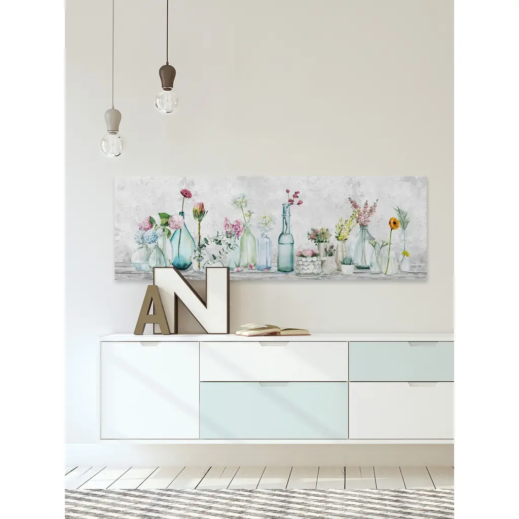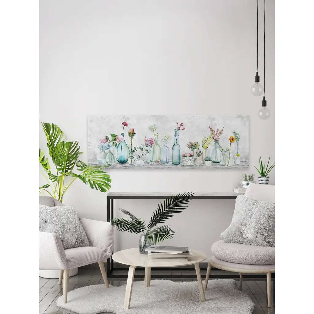 Bright, naturally beautiful flowers turn their faces to the viewer, planted in clear bottles and jars that reflect light with the water within to light up this lovely acrylic print and bring some sun to any room. Proudly made in the USA, this piece is printed on canvas before it's stretched over non-warping wooden bars for a gallery-wrapped look. With wall-mounting hooks included, this artful accent is ready to hang up as soon as it reaches your front door. • Fine art canvas print from the Marmont Hill Art Collective • Professionally hand stretched • Gallery wrapped in sustainable, non-warping wood • Arrives ready to hang • Made in the USA • Includes a certificate of authenticity