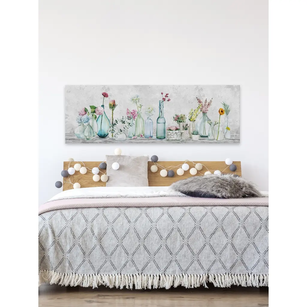 Bright, naturally beautiful flowers turn their faces to the viewer, planted in clear bottles and jars that reflect light with the water within to light up this lovely acrylic print and bring some sun to any room. Proudly made in the USA, this piece is printed on canvas before it's stretched over non-warping wooden bars for a gallery-wrapped look. With wall-mounting hooks included, this artful accent is ready to hang up as soon as it reaches your front door. • Fine art canvas print from the Marmont Hill Art Collective • Professionally hand stretched • Gallery wrapped in sustainable, non-warping wood • Arrives ready to hang • Made in the USA • Includes a certificate of authenticity
