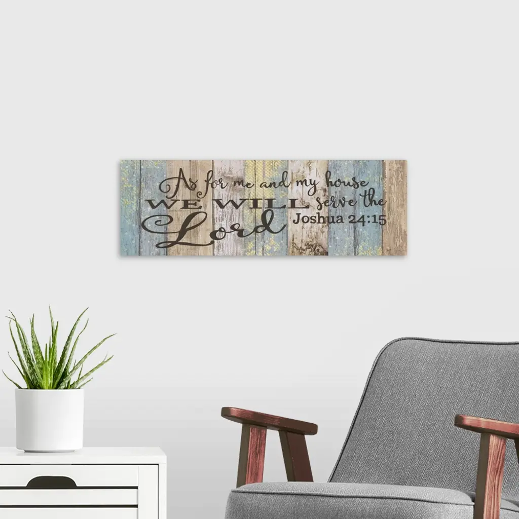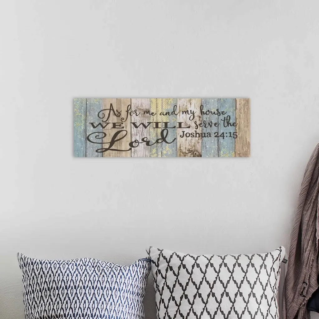 A decorative painting with the verse from Joshua 24:15 painted on top of a multi-colored wooden panel background.