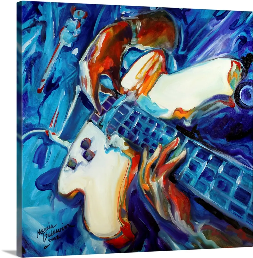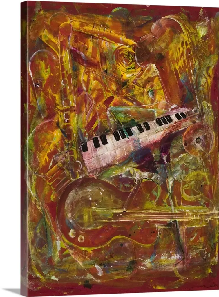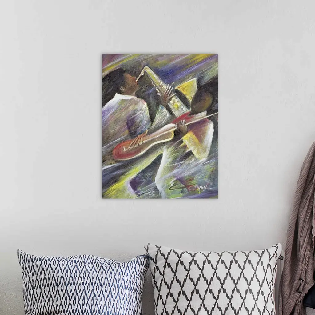 A contemporary piece of artwork with a saxophone player and a cello player with pastel like colors drawn diagonally throughout the print.