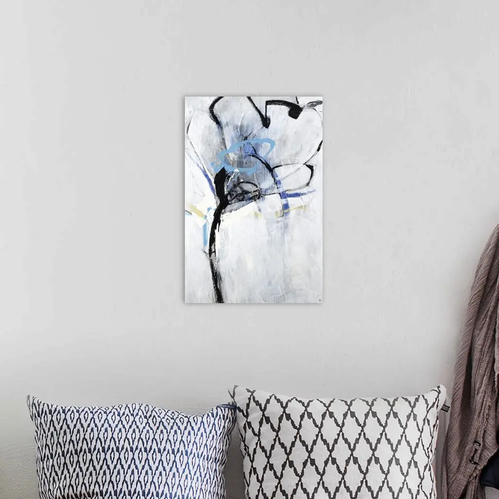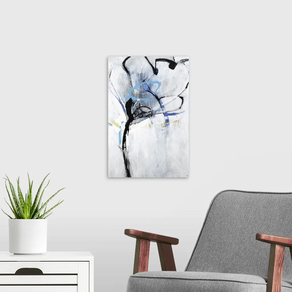 An abstract floral painting with colors of blue and yellow along with the light gray background.