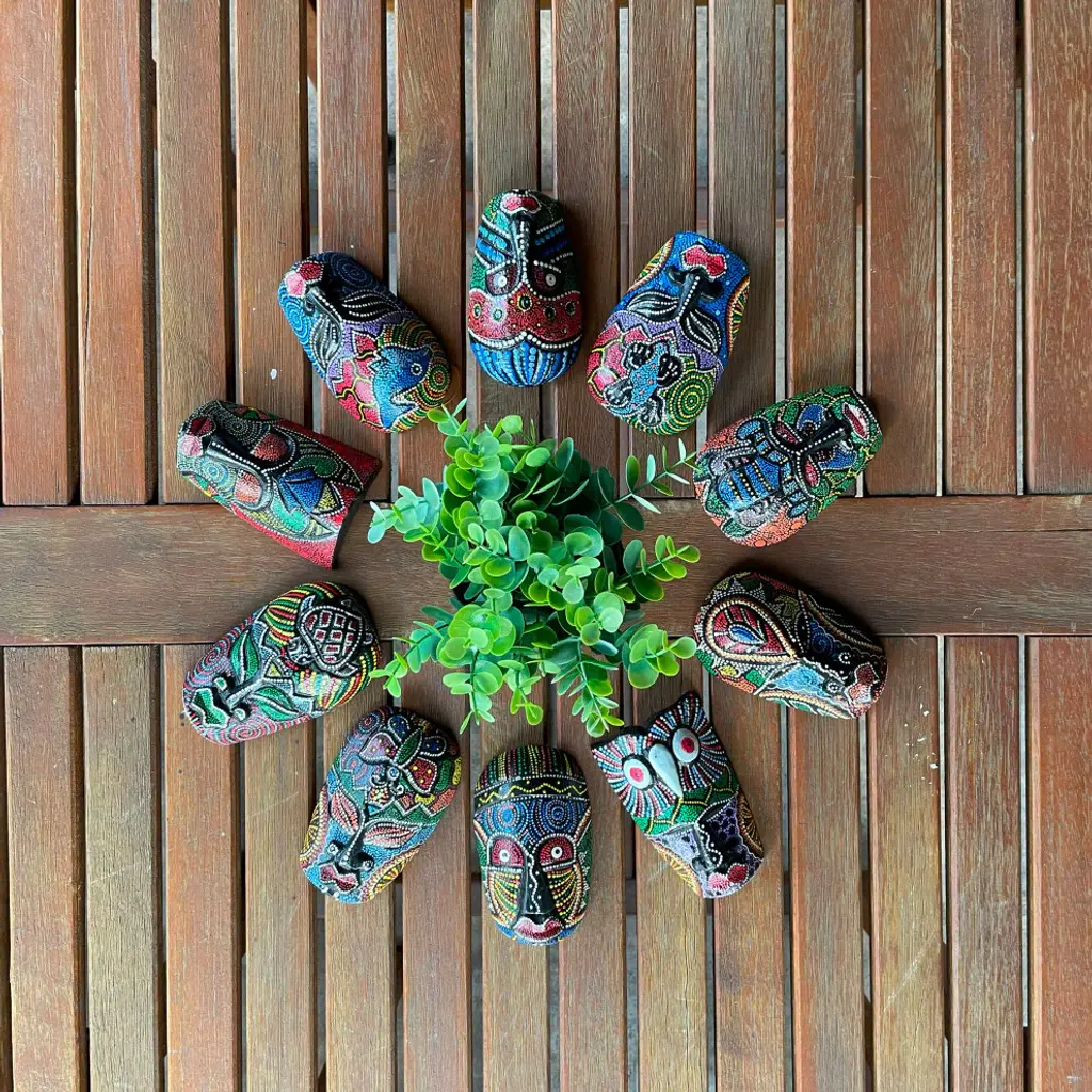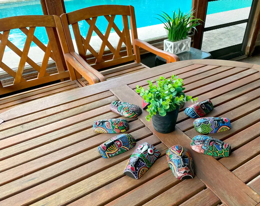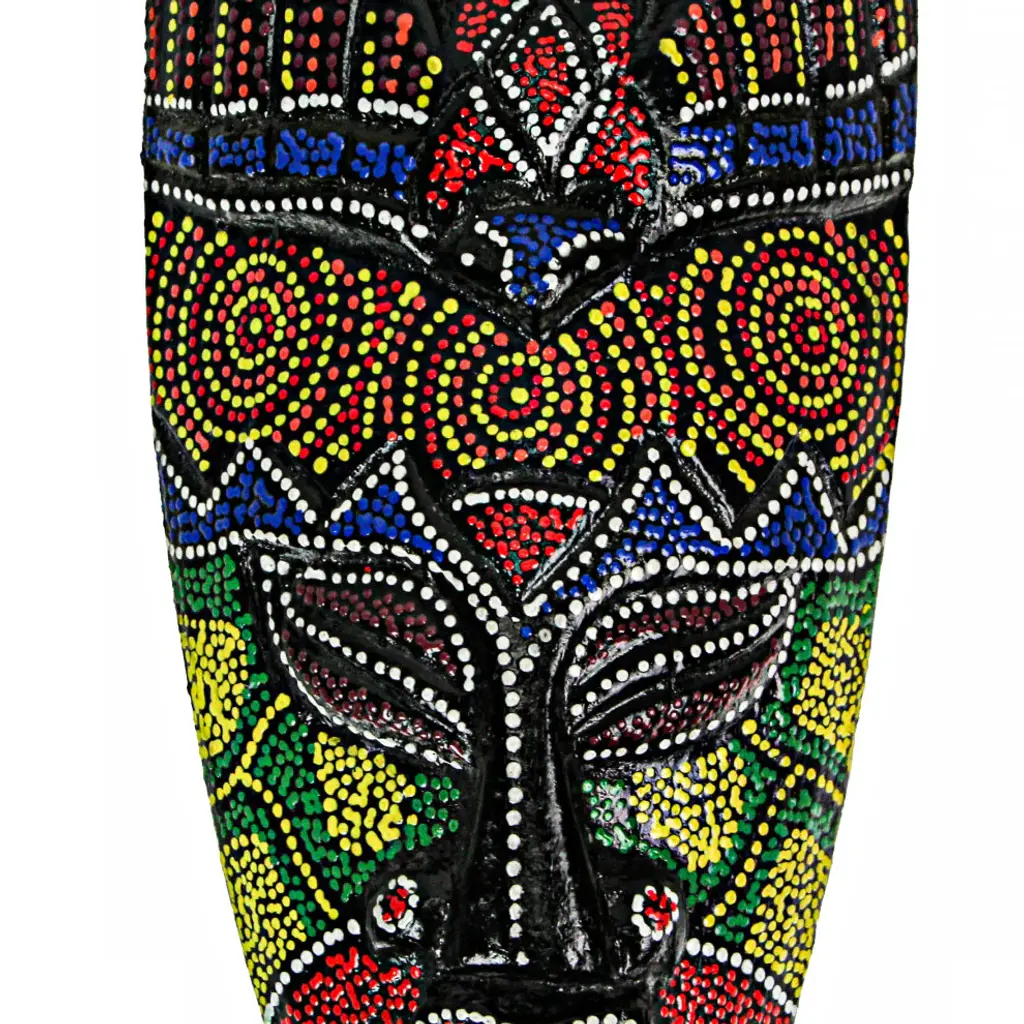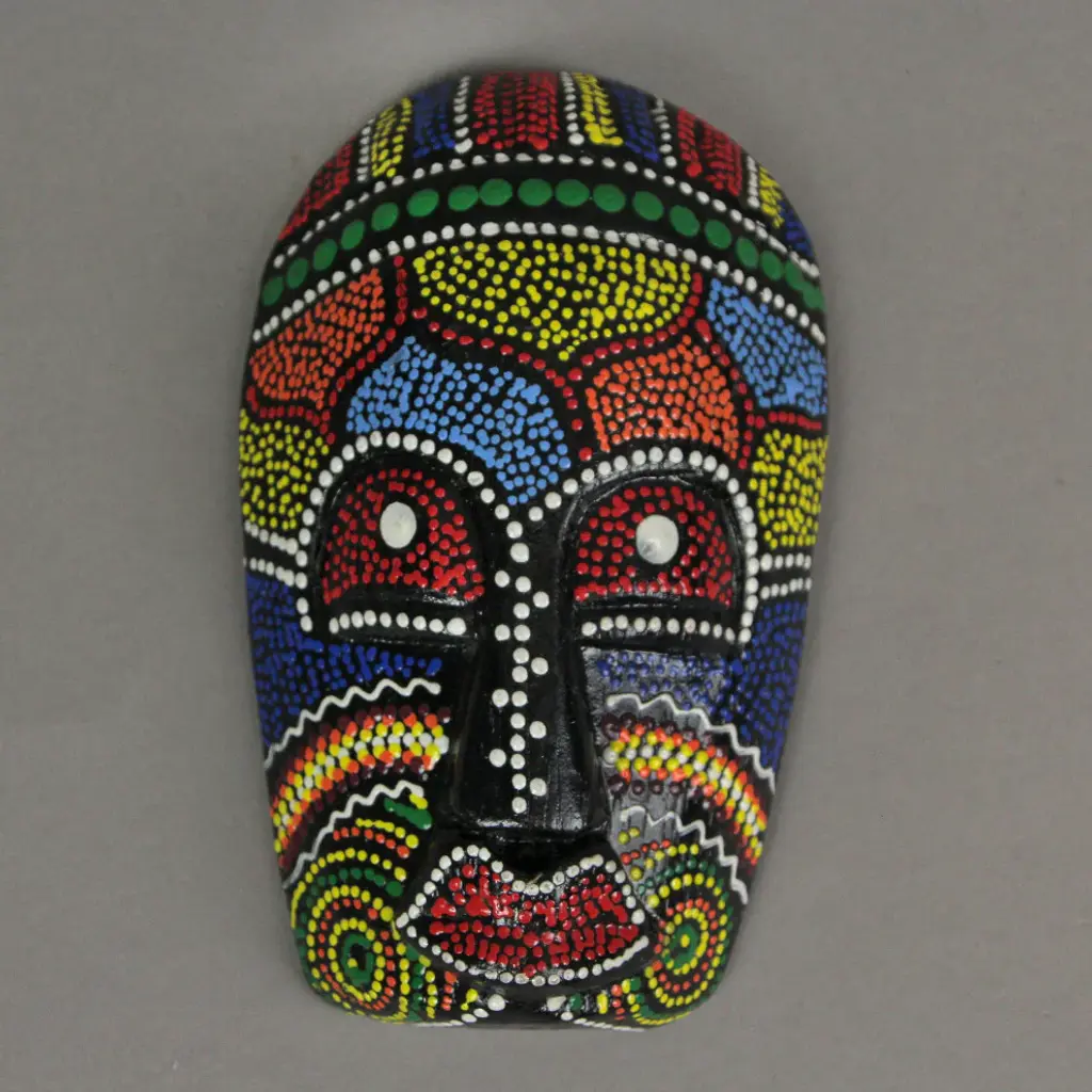 Petite Dimensions - Each mask stands at about 5 inches tall, 3 inches wide, and 1.25 inches deep, creating an ideal size for versatile placement in your home decor.Distinctive Craftsmanship - These masks are meticulously hand-carved and hand-painted, ensuring each set is unique in shape and color. Expect a beautiful array of randomly designed masks, not identical to the examples pictured.Artisan Expertise - Crafted by master craftsmen in Indonesia, these masks showcase exceptional artistry and attention to detail, embodying the skilled craftsmanship of the artisans.Effortless Installation - Equipped with hanger loops on the back, hanging these masks is a breeze. Their user-friendly design simplifies the installation process, allowing you to display them effortlessly.Thoughtful Gift Choice - Whether for yourself or your loved ones, these masks make a fantastic gift idea. Their exquisite craftsmanship and vibrant design make them a unique and heartfelt present, adding a touch of cultural elegance to any space.Transform your space with this set of ten 5-inch tall Aboriginal dot-painted tribal wall masks. Crafted by skilled artisans in Indonesia from lightweight Albesia wood, these masks bring vibrant hues and intricate detailing to your decor. Each mask, measuring approximately 5 inches tall, 3 inches wide, and 1.25 inches deep, is hand-carved and hand-painted, showcasing the artistry of the creators. Made from easily replenished Albesia wood, these decorative masks are eco-friendly and sustainable. The dark brown base is adorned with meticulous dots of brightly colored paint, giving each mask its unique personality. The masks, varying in size, shape, and color, offer a captivating blend of African and tribal aesthetics. Their versatility allows them to enhance any room, adding a splash of color and cultural richness. Display them indoors as unique wall decor, or outdoors to infuse your garden or patio with artistic flair. These masks, embodying the essence of tribal art, bring an exotic touch to your home. Please note that due to their handmade nature, each mask may exhibit slight variations in colors and patterns, making your collection truly one-of-a-kind.